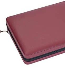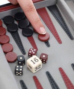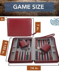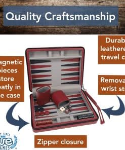 ¡Uno de nuestros sets más populares! Este elegante set de backgammon borgoña de 9 pulgadas es apreciado por su tamaño compacto, correa de transporte y cierre de cremallera. También es magnético para un juego fácil. ¡Hace un maravilloso compañero de viaje! Dimensiones: Abierto: 9″ L x 14″ An x 1″ Alt, Cerrado: 9″ L x 7″ An x 2″ Alt. Edades 8+