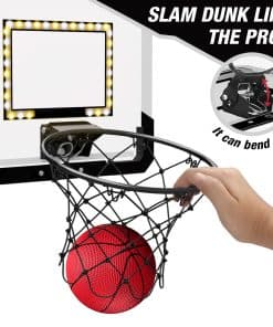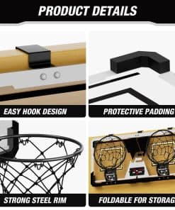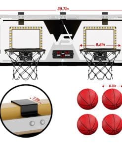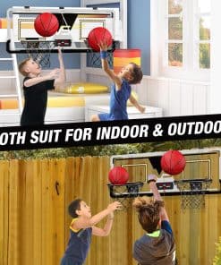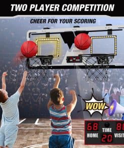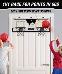 HYES Juego de Baloncesto de 2 Jugadores, Canasta de Baloncesto Doble sobre la Puerta con Puntaje y LED es la opción perfecta para aquellos que desean disfrutar de la emoción del baloncesto en casa, en la oficina, en el exterior o en la piscina. Con su diseño de 2 aros, puntaje eléctrico, efecto LED y facilidad de instalación, este juego de baloncesto promete horas de diversión para niños y adultos por igual. La canasta de baloncesto viene con todas las herramientas necesarias y manuales detallados para una instalación sencilla, sin necesidad de perforar, y se pliega para un fácil almacenamiento. Con un aro desmontable con carga de resorte y acero de alta calidad, este juego de baloncesto es resistente y duradero, permitiendo que los jugadores hagan mates como verdaderos profesionales. Además, al incluir 3 pelotas, este juego es ideal para regalar a fanáticos del baloncesto de todas las edades, fomentando la actividad física y la diversión en familia o con amigos. ¡Juega y diviértete con HYES!