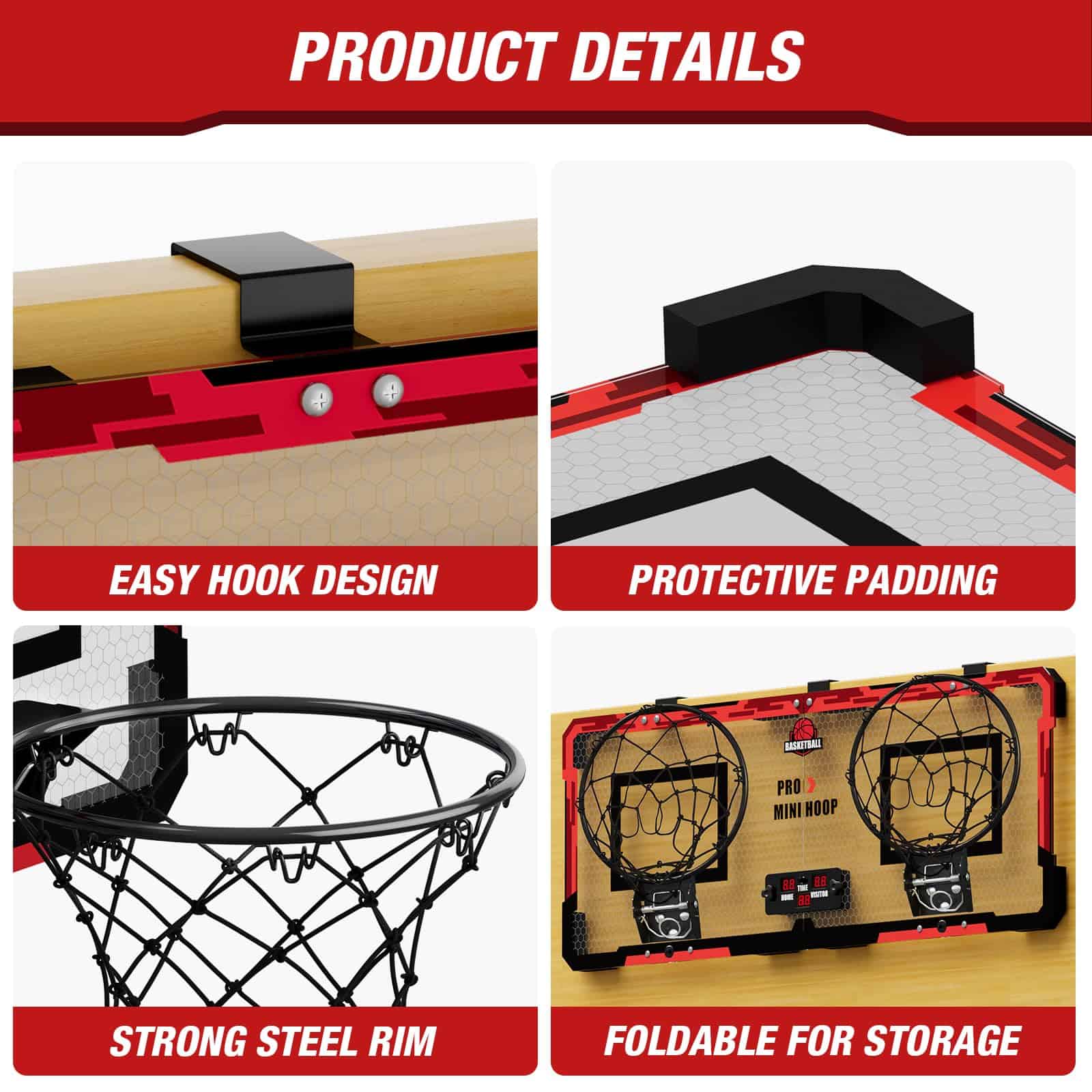 3. Fácil de instalar y diseño plegable: La mini canasta de baloncesto para 2 jugadores de HYES viene con todas las herramientas necesarias y manuales detallados para que puedas instalarla y usarla fácilmente. Canasta de baloncesto sobre la puerta con diseño de ganchos fáciles, no es necesario perforar y se adapta a la mayoría de las puertas. El diseño plegable perfecto ahorra espacio de almacenamiento, no afecta la apertura y cierre de la puerta. Fácil de llevar para jugar al aire libre.