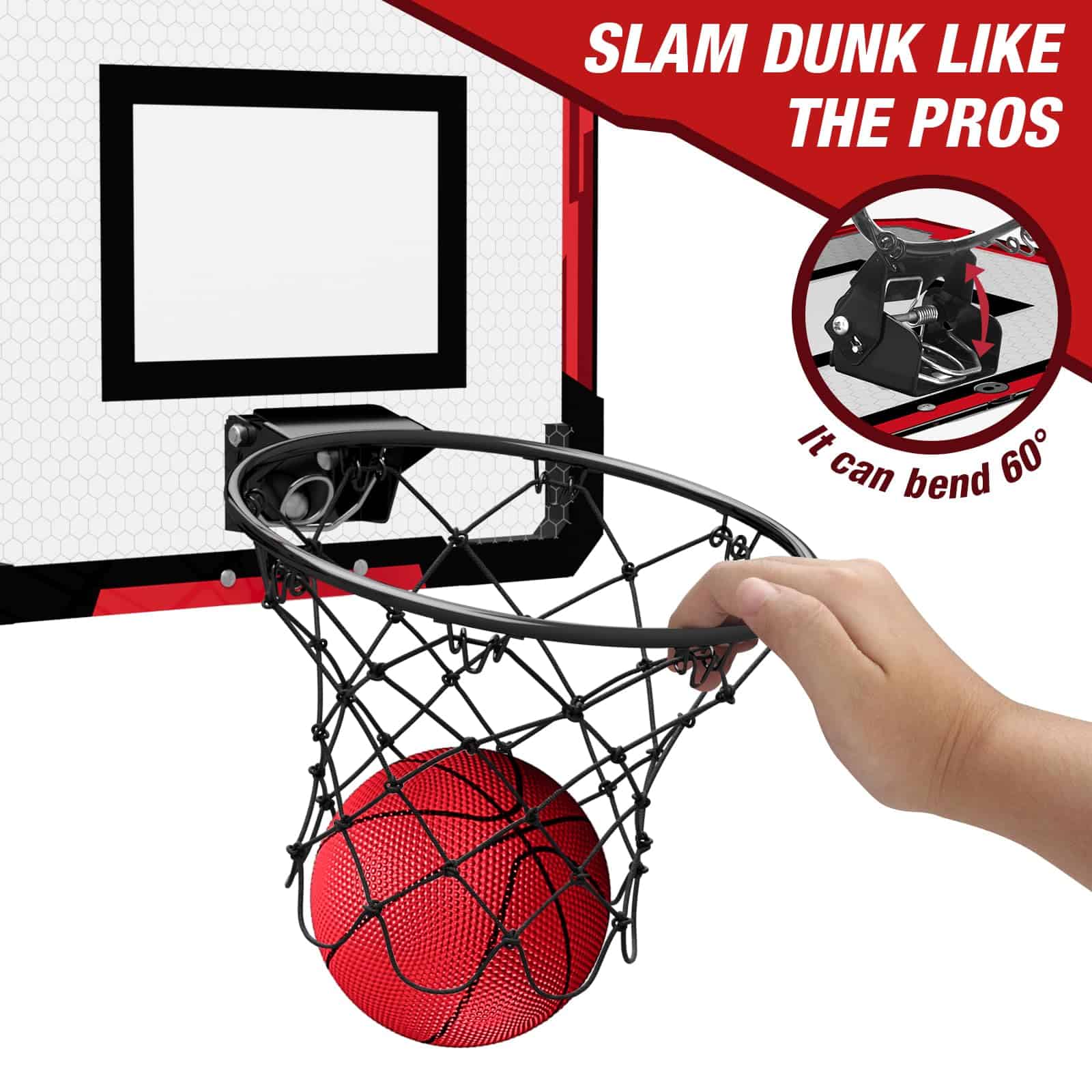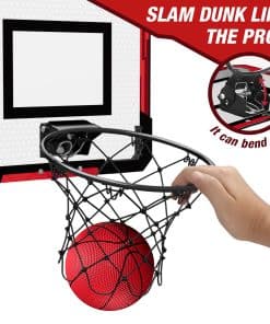 4. Da un mate como un profesional del baloncesto: La canasta de baloncesto sobre la puerta está diseñada con un aro desmontable con carga de resorte, ¡el ángulo máximo es de hasta 60 grados, lo que estimula la sensación real de dar un mate! La canasta de baloncesto de acero de alta calidad lo hace lo suficientemente resistente como para soportar los mates más potentes sin doblarse o romperse.