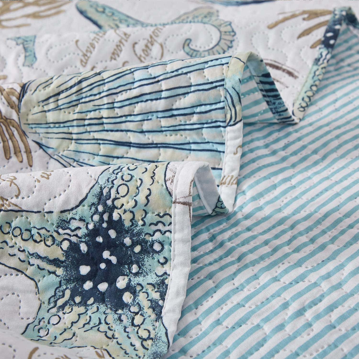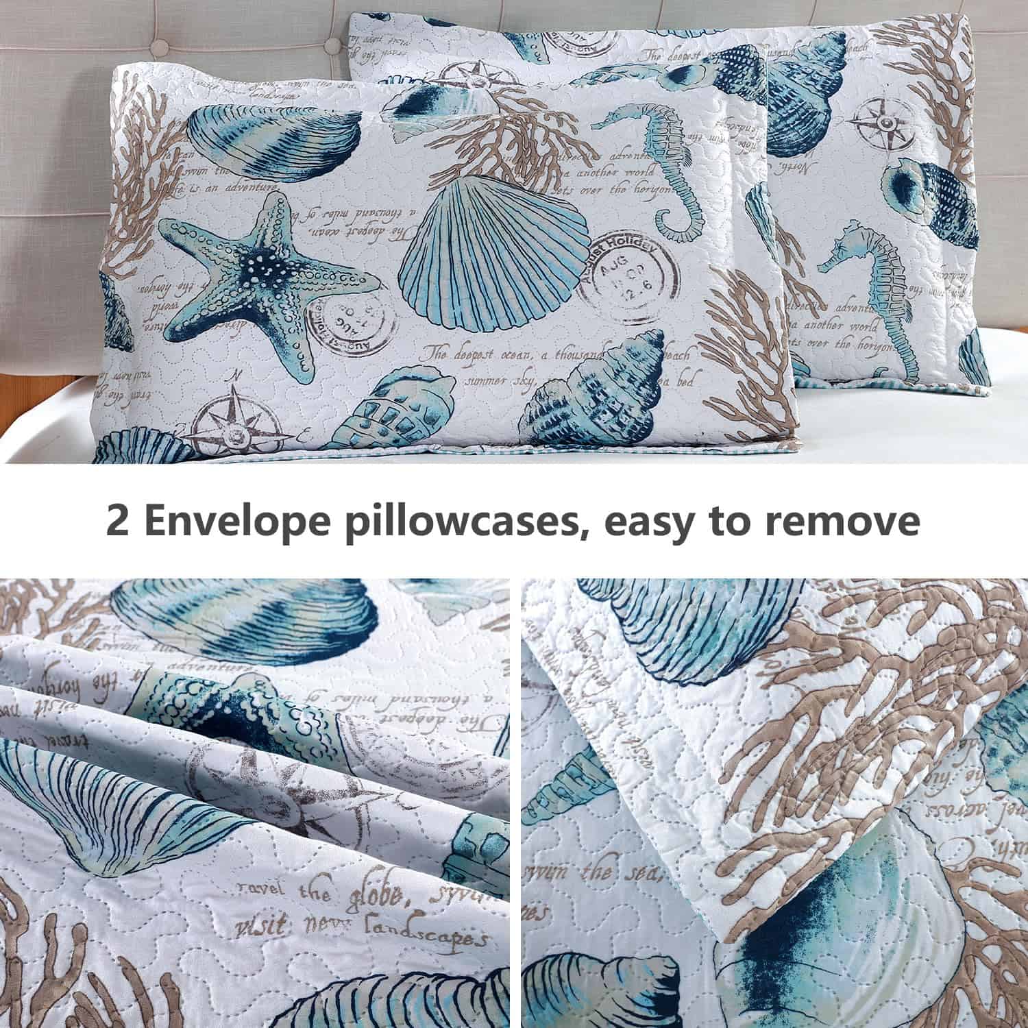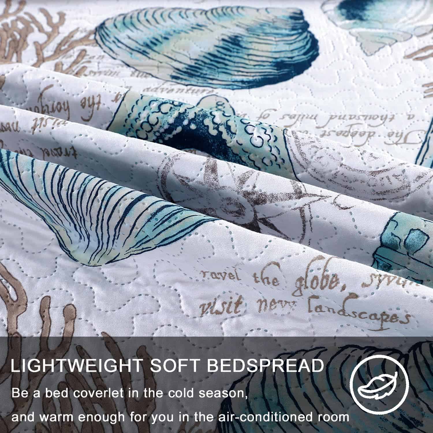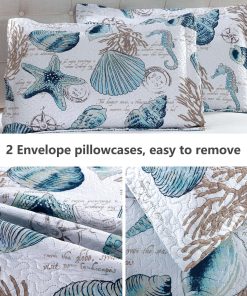 Ocean Quilts Set Package Inlcude: 1 Pieza de Colcha + 2 Piezas de Fundas de Almohada, sin otros elementos. Tamaño de Juego de Colchas Full/Queen: Colcha: 228cm x 228cm (90″ x 90″), Fundas de Almohada: 51cm x 66cm + 5cm (20″ x 26″ + 2″). Juego de Colchas de Playa: Diseño temático de océano, juego de colchas con conchas, caracoles, estrellas de mar, caballitos de mar, algas marinas impresas, se ve muy hermoso, perfecto como regalo para habitaciones de niños/niñas/adolescentes/adultos o habitaciones de invitados. El juego de colchas de océano te hará sentir de vacaciones todos los días, relajante y con un buen descanso. Juego de Colchas de Verano: Las colchas de microfibra de poliéster son muy suaves y cómodas, las colchas de playa son muy delgadas y ligeras, muy adecuadas para las noches calurosas de verano, también se pueden usar como manta en invierno. Las colchas ligeras permiten mover tu cuerpo libremente al dormir por la noche. Cuidado fácil: El juego de colchas de océano es resistente a la decoloración, encogimiento y arrugas. Lavar a máquina en frío. Secar rápidamente en secadora a fuego lento. Esta colcha mantendrá tu cuerpo fresco y garantizará una cómoda noche de sueño. Diseños Diferentes en Ambos Lados: El juego de colchas costeras no es reversible, los dos lados de la colcha tienen diseños diferentes, un lado está impreso con concha, caracol, estrella de mar, caballito de mar y algas marinas, el otro lado está impreso con rayas azules y blancas, se ve muy hermoso y único.