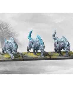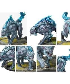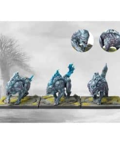 Massing almost half a ton and porting massive fangs and wicked claws, the most terrifying trait of the Fenr Beastpack is its cunning intellect. Closer to what one would expect from apes, those Wargs that consent to join a host in battle can be found ranging ahead of the main force, hunting light cavalry and skirmishers before turning to fall upon the flanks and rear of the engaged enemy. Plastic components. Contents: 3 figuras de Miniatures 3 Fenr, 3 soportes de caballería (65mm), 3 bases de caballería (55mm), 1 Tarjeta de Comando. Las miniaturas se suministran sin pintar. Se requiere preparación y montaje.