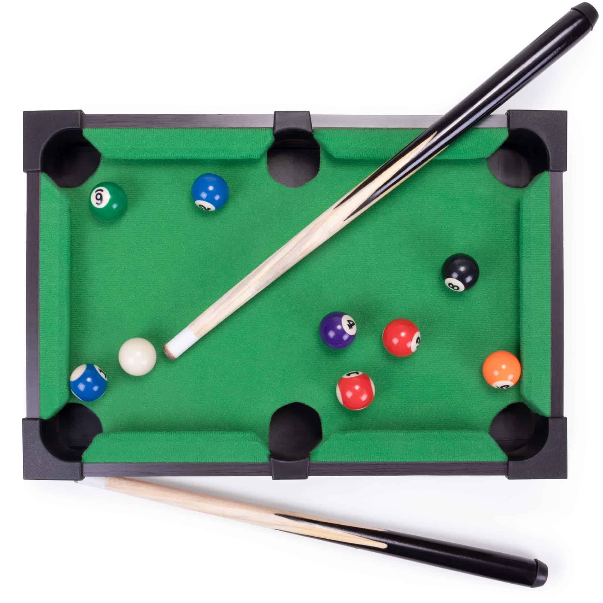 ¿Poco espacio, poco tiempo Juega al billar donde quieras ir! Este set de mesa incluye todo lo que tienen las mesas grandes; 16 bolas de billar de resina sólida, dos tacos de billar de madera real, un triángulo para colocar las bolas, incluso una tiza para un mayor control de la bola. Viene con una versión miniaturizada de una mesa de billar con forro de fieltro para que puedas jugar al billar directamente en tu escritorio! ¡No se necesitan viajes a la sala de descanso o intentos de convencer a tu jefe para tener una mesa de billar!
