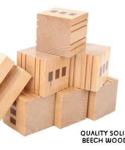 GRAN VALOR Este set de bloques de castillo medieval incluye 69 bloques en 19 formas diferentes. Todos los bloques están hechos de madera de haya sólida de alta calidad con hermosas vetas de madera y pintados con pinturas no tóxicas a base de agua. Las piezas grandes son fáciles para las pequeñas manos agarrar, apilar, derribar y construir de nuevo.