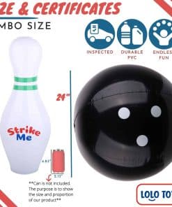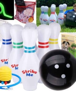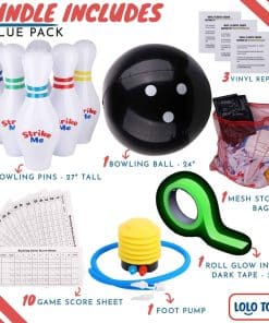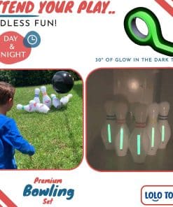 1. ¡Diversión infinita en la noche! – Nuestro juego de bolos para interiores y exteriores incluye cinta fosforescente para extender la diversión, solo agrega cinta a los bolos inflables y a la bola y juega de noche! Cada lote de cinta que uses durará 4 horas de brillo. El juego de bolos para el césped de Lolo Toys es el juego de bolos de patio perfecto para niños, juegos de fiesta en familia, juegos al aire libre, juegos de camping, juegos gigantes en interiores o actividades para niños en interiores o exteriores en el patio trasero.