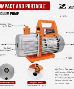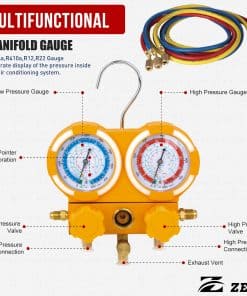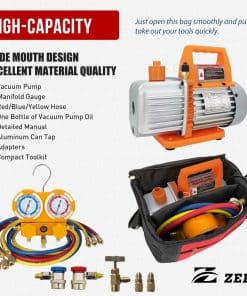 ZRB-3B se utiliza para diagnosticar y reparar el sistema de aire acondicionado de vehículos. El manómetro de presión de aire puede usarse para probar, evacuar y llenar sistemas de aire acondicionado de automóviles o domésticos. Envasado en bolsa portátil, almacenamiento conveniente, transporte práctico. La bomba de vacío tiene una potencia de 110V-60HZ, con un flujo de 2CFM y una potencia de 1/4HP. El kit incluye un manómetro de aire acondicionado de 60″ para R22 R134A R404A R410a, un acoplador rápido de 400QC con una capacidad de 17L/H y una bolsa de transporte.