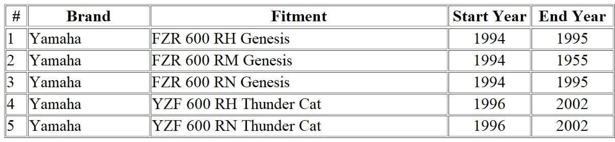 Este cable es compatible con los siguientes modelos Yamaha 600 FZR 600 RH Genesis (1994-1995) Yamaha 600 FZR 600 RM Genesis (1994-1955) Yamaha 600 FZR 600 RN Genesis (1994-1995) Yamaha 600 YZF 600 RH Thunder Cat (1996-2002) Yamaha 600 YZF 600 RN Thunder Cat (1996-2002)