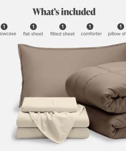 Juego de cama Bare Home de 5 piezas que incluye un edredón Taupe Twin/Twin XL (66″ x 92″), una sábana ajustable Sand (39″ x 80″ x 15″), una sábana plana Sand (66″ x 100″), una funda de almohada Taupe (tamaño estándar, 20 x 26) y una funda de almohada Sand (tamaño estándar, 20″ x 30″). Los edredones de Bare Home cuentan con un acolchado sólido que evita que el relleno se mueva o se amontone. Los bordes con ribete proporcionan un aspecto limpio y elegante. Nuestra lujosa tela de microfibra ultra suave de 1800 hilos se ha tejido con la mejor artesanía. Diseñado con una combinación perfecta de durabilidad y suavidad. Fácil cuidado: Lavar a máquina en agua fría con colores similares en ciclo suave. Secar al aire o en secadora a baja temperatura. Descansa tranquilo: Tus primeras 30 noches son gratis. Literalmente. Si no te encanta nuestro juego de cama, devuélvelo.