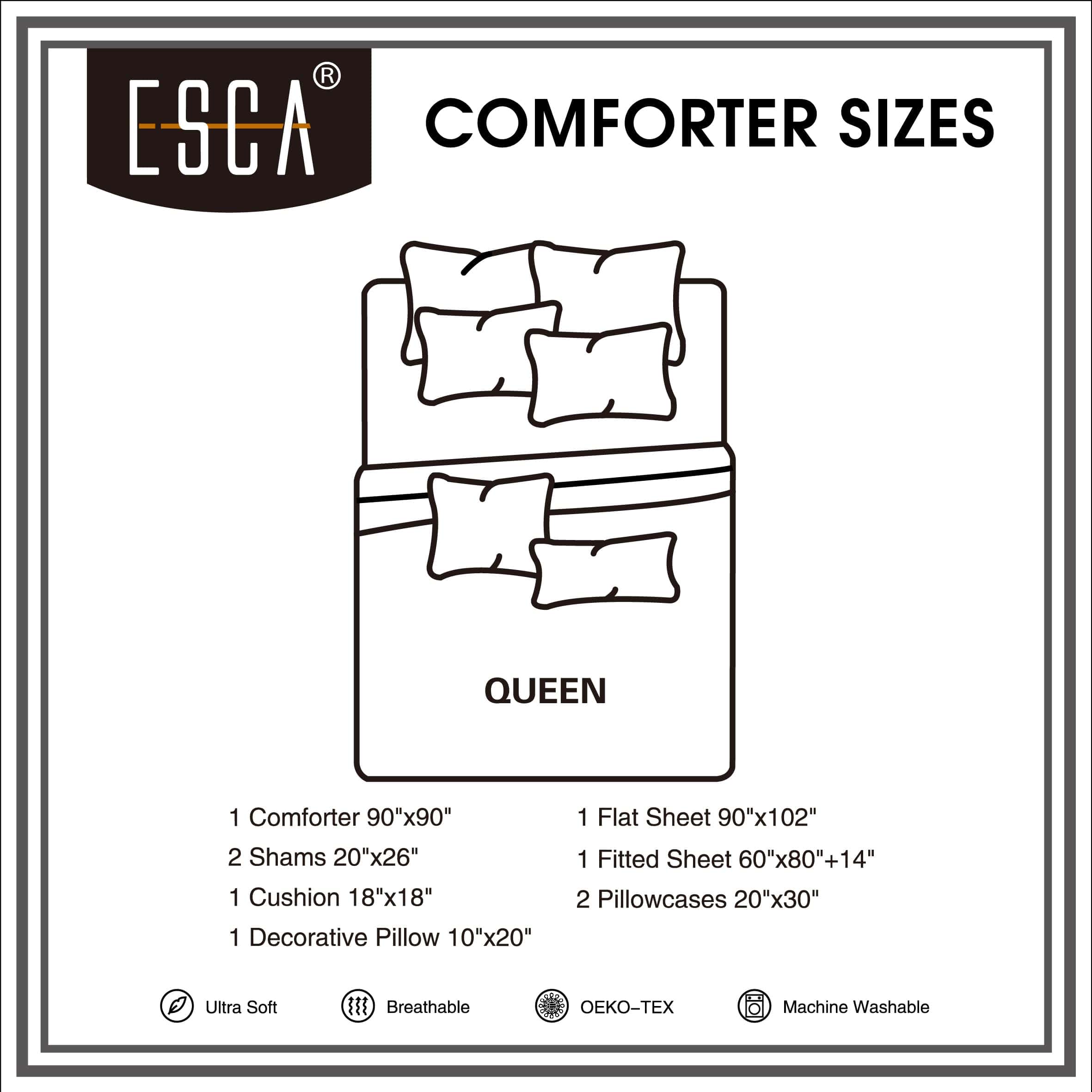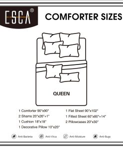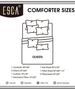 Talla Queen: Edredón 90″x 90″, Fundas 20″x 26″, Cojín 18″x 18″, Sábana 90″x 102″, Sábana ajustable 60″x 80″+14″, Almohada de desayuno: 12″ x 18″, Fundas de almohada 20″x 30
