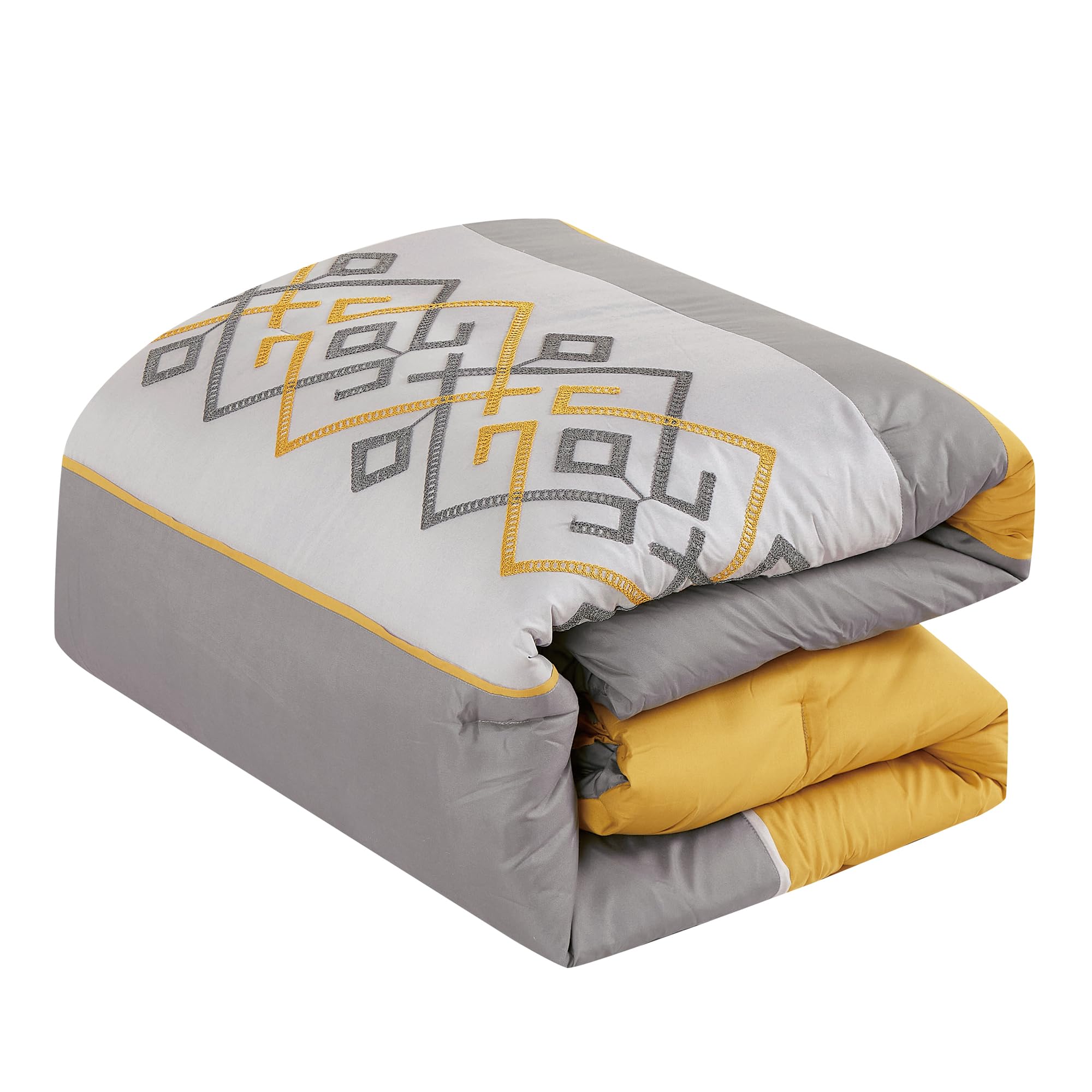 Showcasing delicate, detailed embroidery, this bedding set brings a luxurious touch to your space, adding texture and sophistication that elevates your bedroom decor. This comforter set is your go-to solution for year-round coziness, ensuring a perfect night’s sleep in every season. Rest assured, our bed sheets are certified by the internationally recognized STANDARD 100 by OEKO-TEX. This certification guarantees that our products have undergone rigorous testing to ensure they are free from harmful substances. We prioritize your well-being and are committed to providing you with the highest standards of quality and safety, giving you peace of mind while you sleep. Our bed-in-a-bag set is machine washable, making it easy to clean and maintain. Simply wash it in cold water on a gentle cycle, tumble dry on low heat, and avoid bleaching and ironing for long-lasting quality. The microfiber fabric is resistant to pet fur and easily releases it during washing. This set includes: Comforter 104″ x 90″, Shams 20″ x 36″, Cushion 18″ x 18″, Flat Sheet 108″ x 102″, Fitted Sheet 72″ x 84″ + 14″, Decorative Pillow 10″ x 20″, Pillowcases 20″ x 40″.