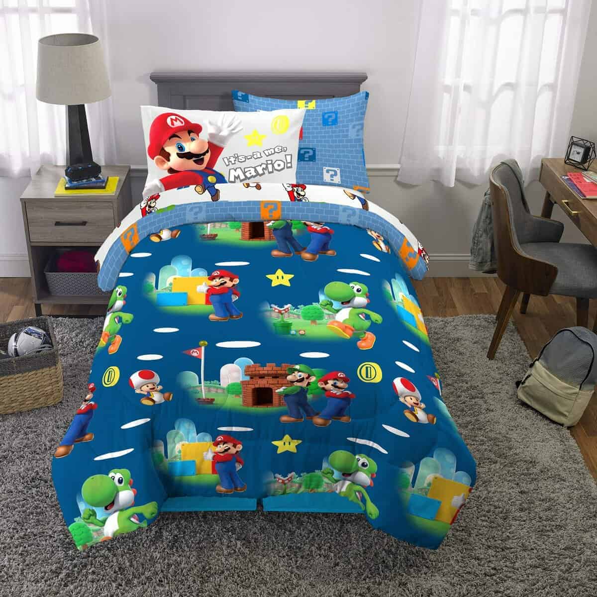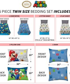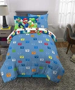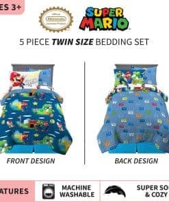 Los jóvenes jugadores pueden acurrucarse con sus personajes favoritos de Super Mario con este juego de ropa de cama suave y elegante. Mario, Luigi, Yoshi y Toad del querido videojuego de Nintendo traen su estilo colorido y lleno de acción a esta ropa de cama con estampado de «Plomero Mario». Este set de microfibra de alta calidad incluye un edredón, sábana ajustable, sábana plana, funda(s) de almohada y almohada sham(s) coordinados en colores y diseño. El edredón reversible ofrece un estilo de otro nivel con los personajes de Super Mario saltando a la acción contra un fondo azul oscuro por un lado, mientras que un colorido estampado de bloques de preguntas cambia las cosas en el reverso azul claro. Los colores y las imágenes de los personajes en el resto de las sábanas «Plomero Mario», funda(s) de almohada y sham ayudan a crear un look cohesivo de Super Mario. Los personajes instantáneamente reconocibles de Mario, Luigi, Yoshi y Toad han sido favoritos de los fans de Nintendo durante años, gracias a su adorable arte, divertidas travesuras y emocionante jugabilidad. Ayuda a inspirar a una nueva generación de fans de Super Mario con este elegante y de alta calidad set de ropa de cama temática de Super Mario. El set está disponible en un juego de cama de tamaño twin de 5 piezas o un juego de cama de tamaño completo de 7 piezas.