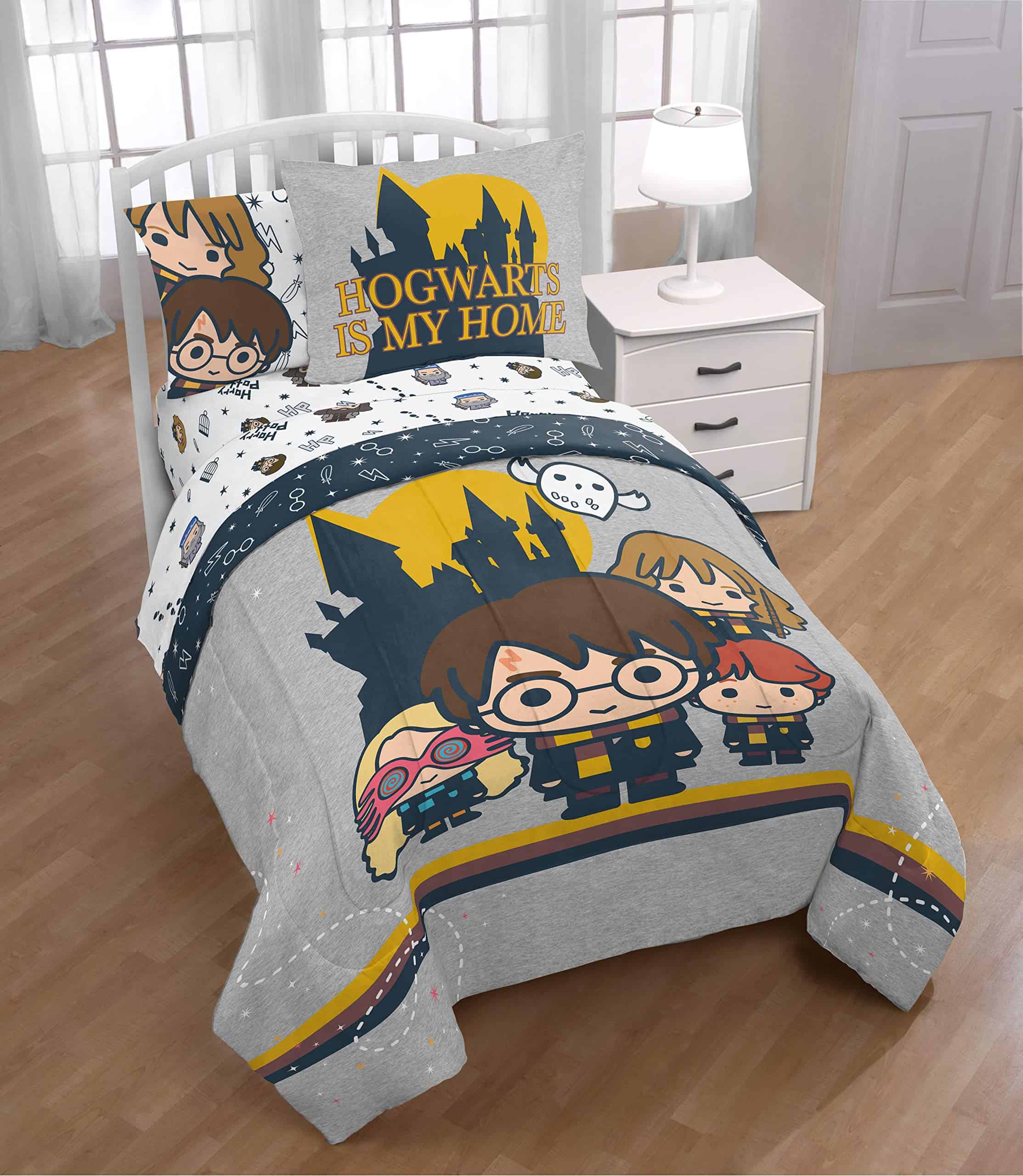 Set de cama Harry Potter Charms diseñado para los fanáticos de Harry Potter. Este set incluye 1 edredón twin, 1 sábana ajustable, 1 sábana plana, 1 funda de almohada estándar y 1 funda de almohada. El juego de cama es suave y colorido, presentando a los personajes icónicos de las películas de Harry Potter. Hecho de 100% poliéster de microfibra cepillada, este set proporciona comodidad acogedora para un buen descanso. Fácil de cuidar, es lavable a máquina y se puede secar a baja temperatura. Este set de cama es un regalo divertido y perfecto para decorar la habitación de tu hijo, habitación de invitados o casa de vacaciones.