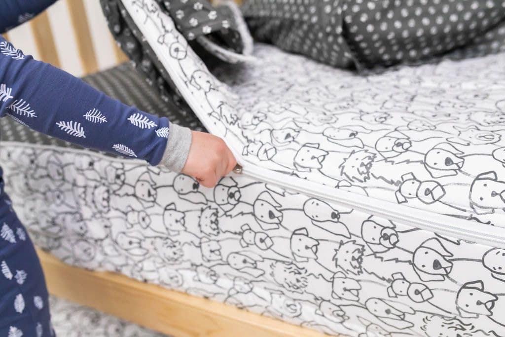 1. JUEGO DE CAMA TODO EN UNO: Nod & Winks de Beddy’s lo tiene todo (y mucho más!). Nuestra ropa de cama con cierre viene en una sola pieza y se coloca como una sábana ajustada. El set incluye un edredón, sábana cosida, paneles de confort, funda de almohada ajustada y cubrecama. 2. FÁCIL DE HACER: Dile hola a la cama que prácticamente se hace sola. Haz que tu rutina matutina sea un juego de niños o consigue que tus hijos finalmente comiencen a hacer su cama. Todo lo que necesitas es tirar de las cremalleras de tracción rápida y listo. 3. COMODIDAD MEJORADA: No pierdas el sueño por tu ropa de cama. Los materiales premium son suaves en tu piel con paneles de confort extendidos que te ofrecen cobertura contra las cremalleras. Mientras tanto, el elástico resistente de la parte inferior mantiene todo en su lugar durante toda la noche, incluso para los durmientes más inquietos. 4. MATERIALES: Todos los tejidos exteriores e interiores son 100% poliéster. Las cremalleras recubren por completo el edredón superior para que sea fácil de quitar y lavar. 5. TAMAÑOS: Nod & Winks de Beddy’s están diseñados para adaptarse a colchones de tamaño estándar. Disponibles en tamaño para Niños pequeños, Individual y Doble. 6. DIMENSIONES (Doble): Largo: 75 pulgadas, Ancho: 54 pulgadas, Profundidad: 15 pulgadas. 7. TEN EN CUENTA: La ropa de cama con cremallera de Beddy’s y/o Nod & Winks no está destinada a niños menores de 3 años. Se recomienda que los niños entre 3-5 años duerman con al menos un lado de su ropa de cama con cremallera completamente abierta.