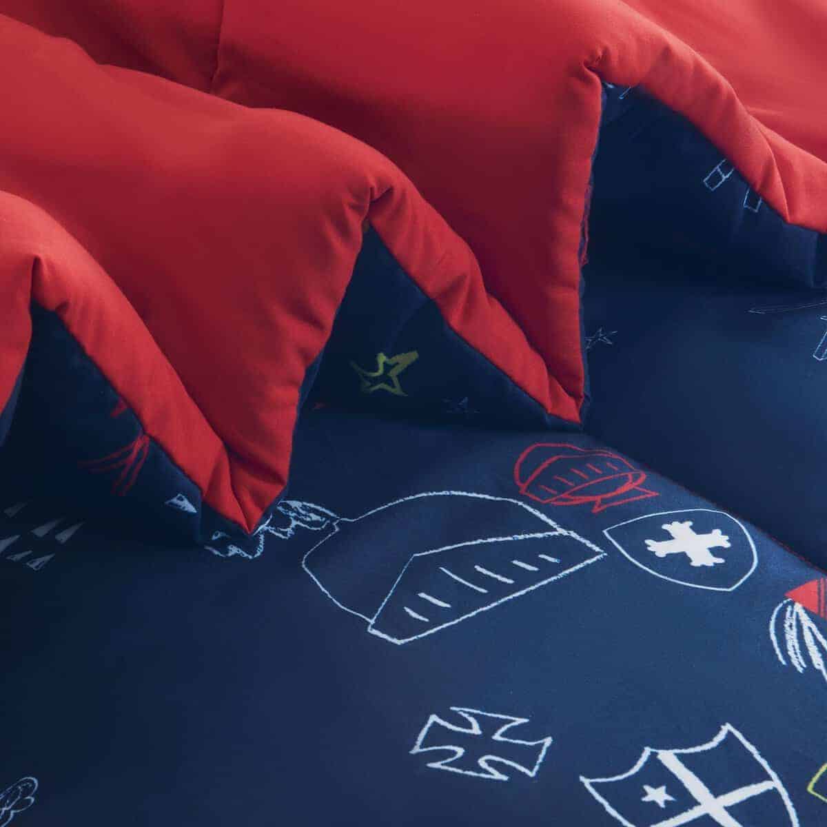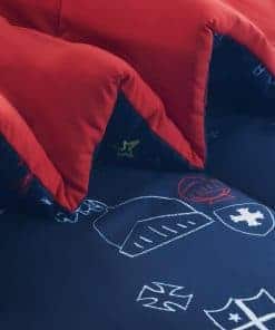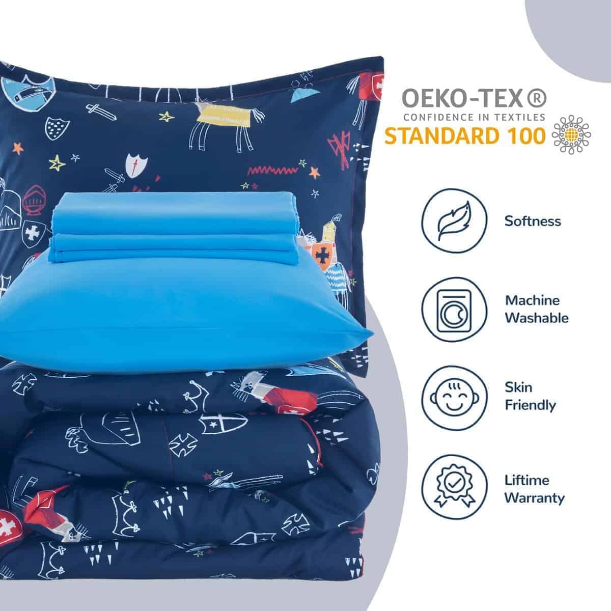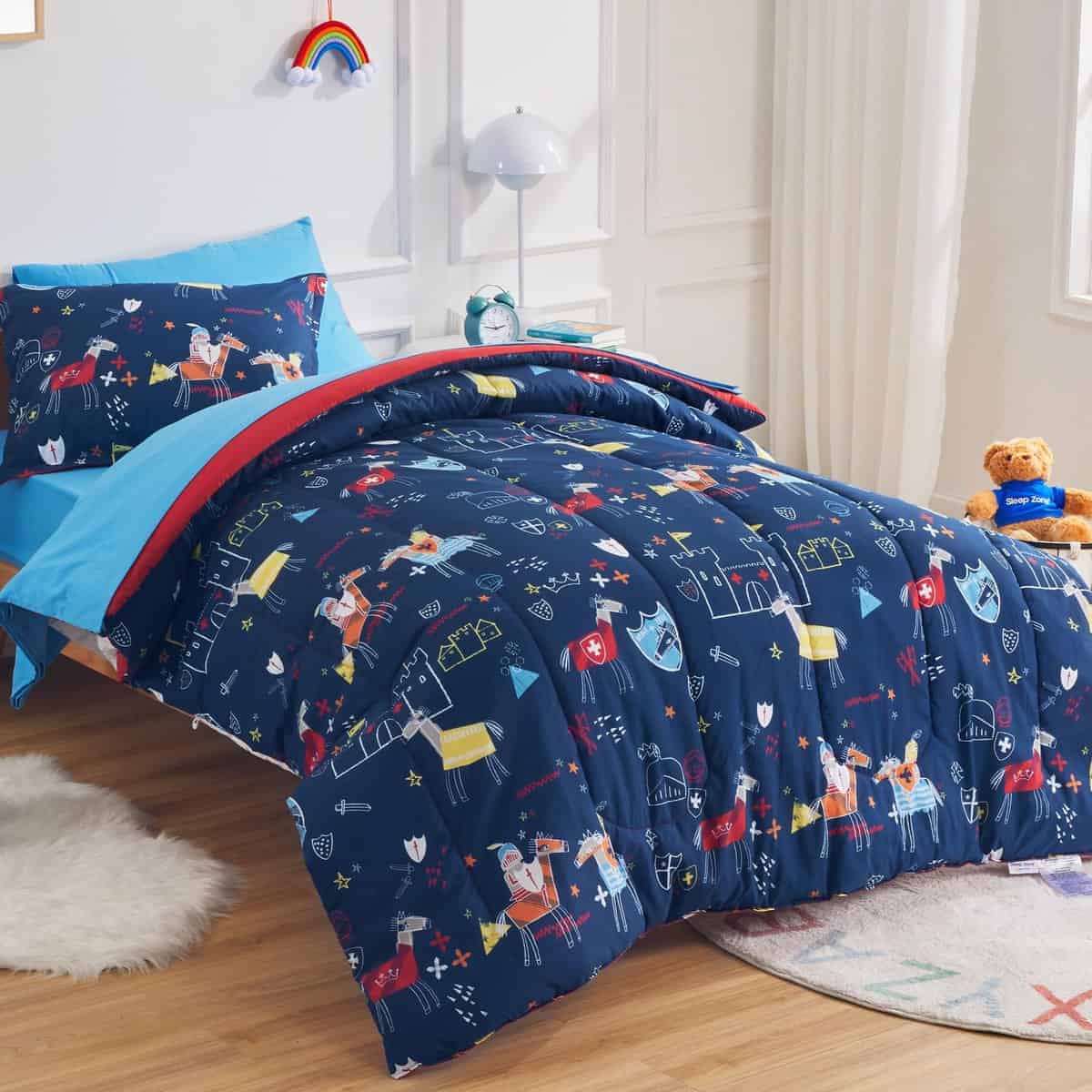 Este juego de cama SLEEP ZONE de 7 piezas para niños está diseñado para brindar comodidad y durabilidad. El juego incluye un edredón, sábana, funda de almohada y funda de almohada, todo en un hermoso diseño de Cuento de Caballeros. Hecho con materiales de alta calidad, este juego de cama es perfecto para niños que buscan un sueño tranquilo y reparador.