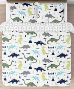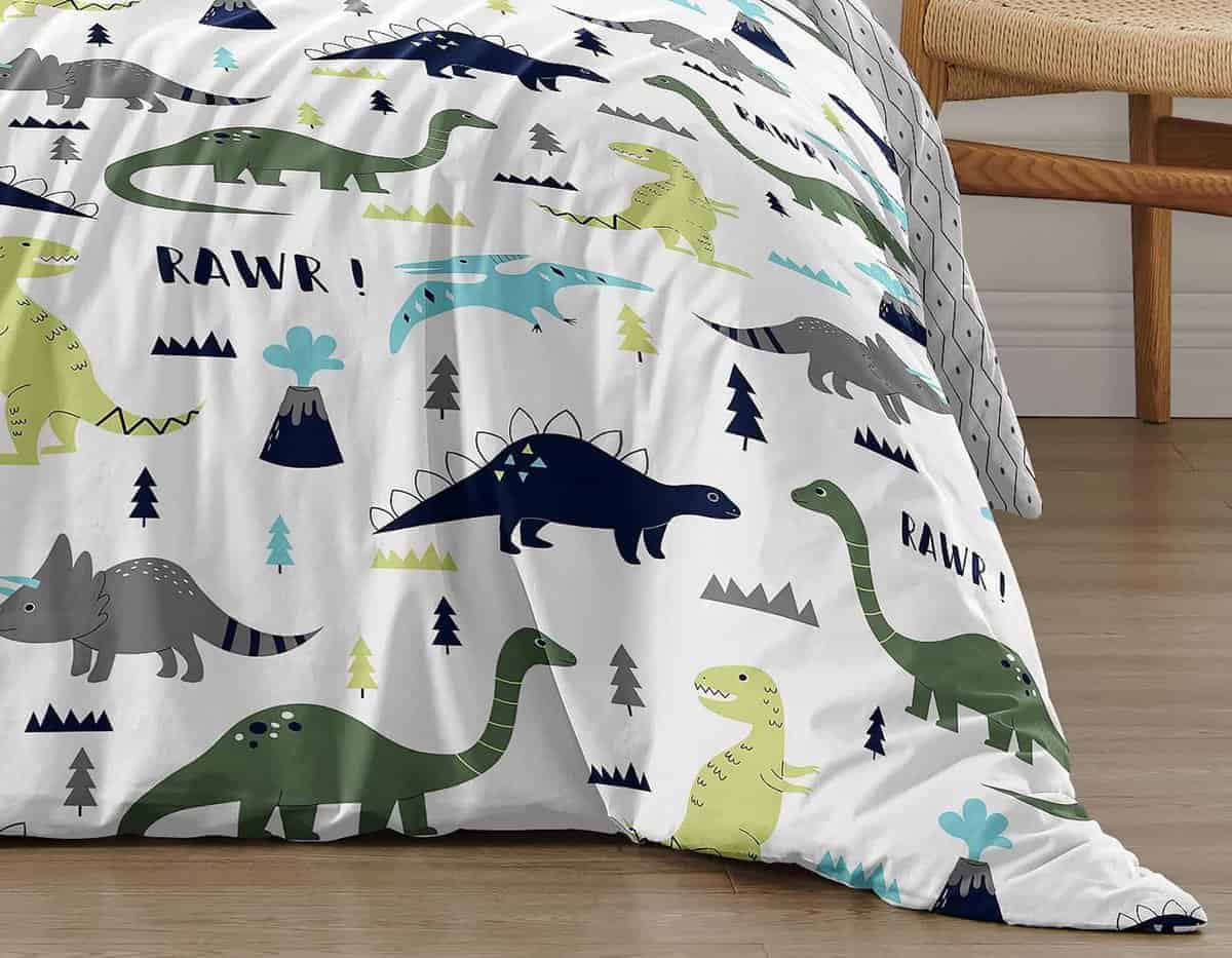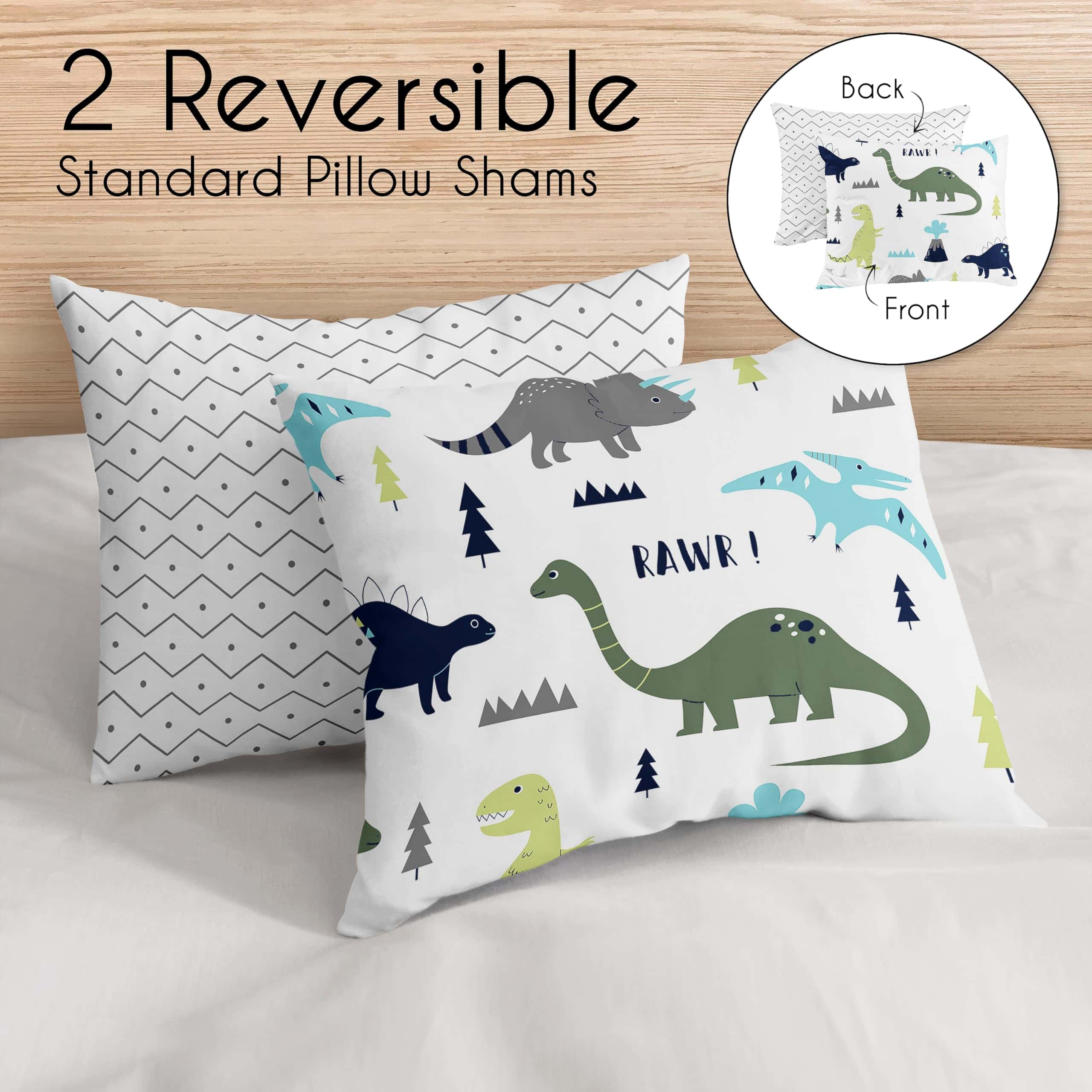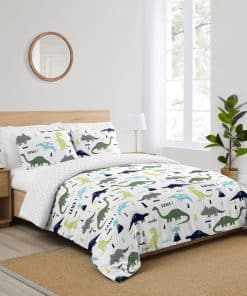 Este juego de cama combina un estampado de dinosaurios multicolor con un estampado de chevron gris coordinado. Hecho de microfibra cepillada y lavable a máquina. Incluye accesorios a juego como tratamientos para ventanas, cestos, cortinas de ducha y almohadas.