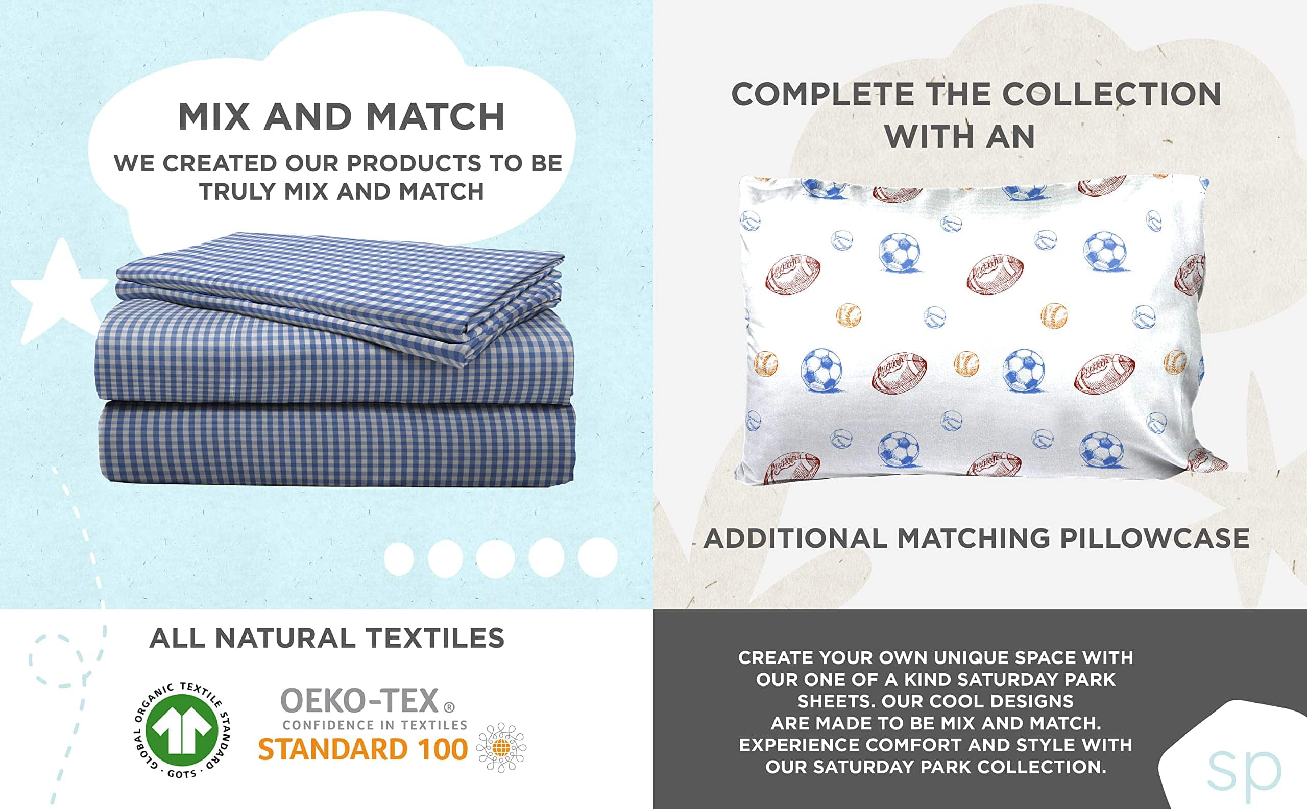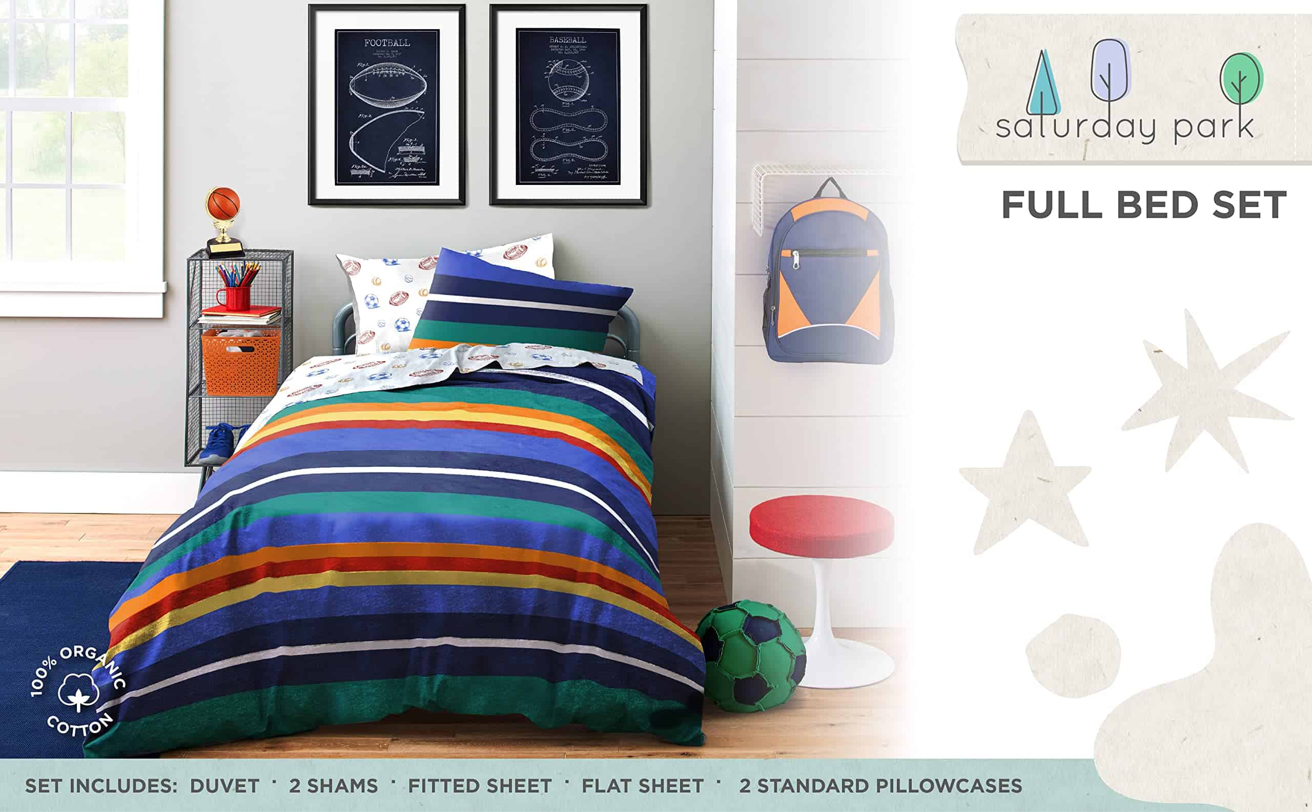 – Tamaño perfecto y diseño elegante – El set de cama completo incluye (1) funda de edredón completa de 88 x 88 pulgadas, (1) sábana ajustable de 54 x 75 pulgadas, (1) sábana plana de 81 x 96 pulgadas, (2) fundas de almohada estándar de 20 x 30 pulgadas y (2) cubiertas de almohada de 20 x 26 pulgadas. Agrega un toque de encanto decorativo a tu habitación con nuestro elegante set de cama Saturday Park, que presenta tus deportes favoritos: fútbol, béisbol, fútbol y tenis.