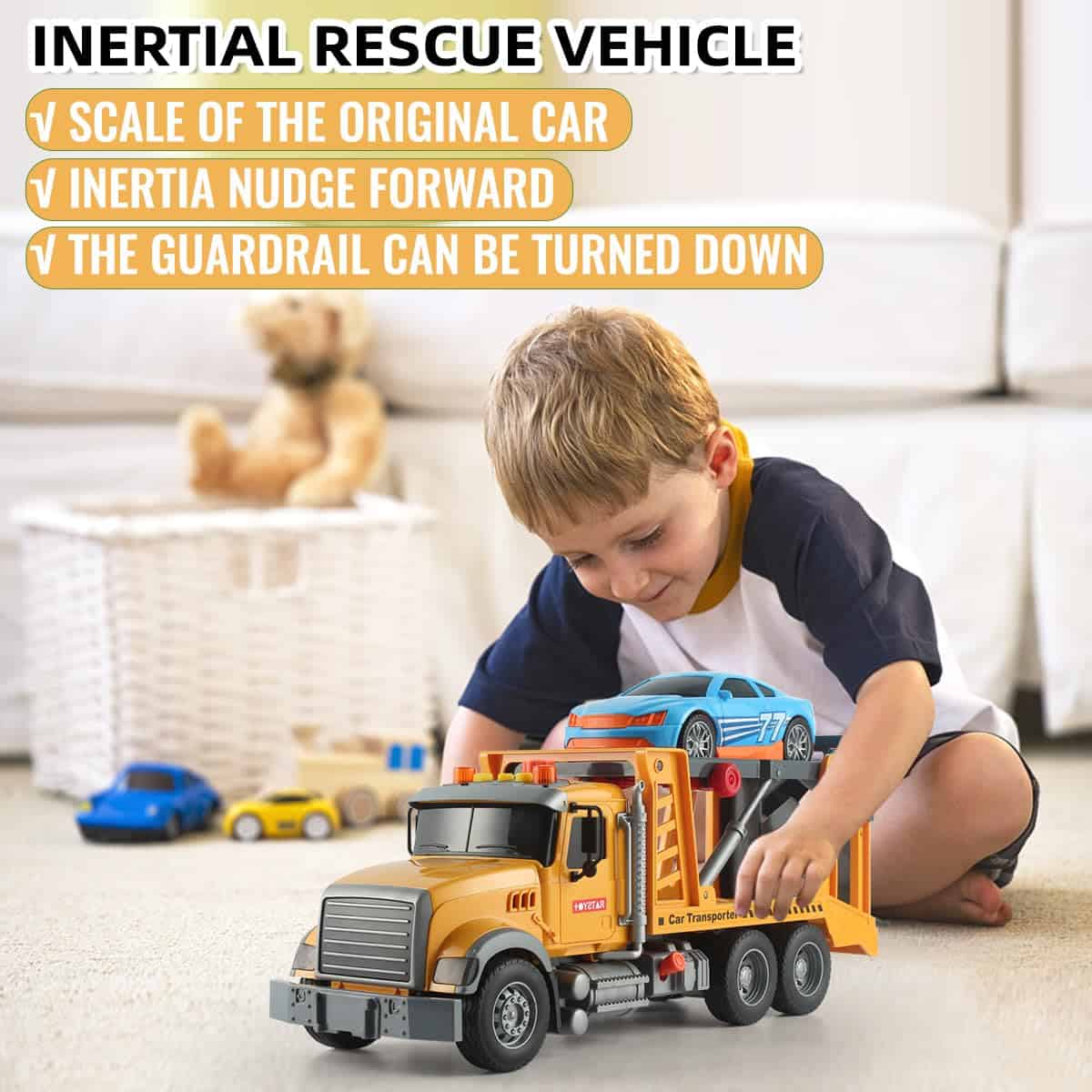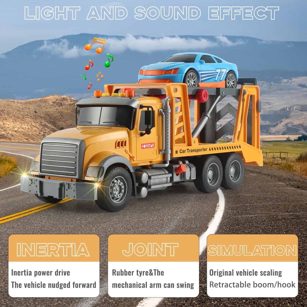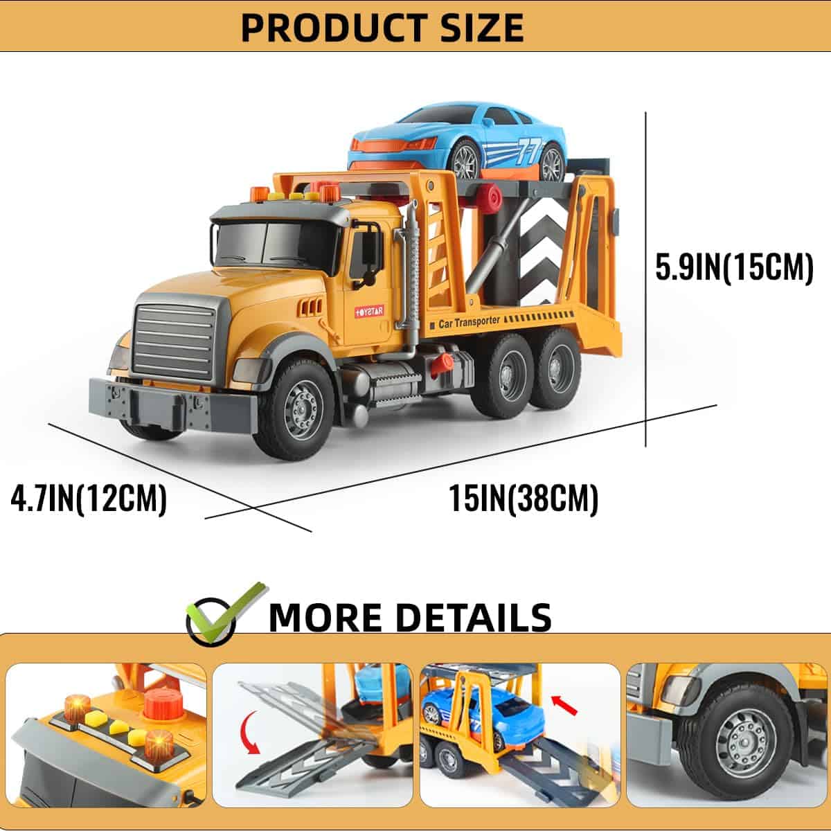 1. Camión de Juguete Versátil: Nuestro gran camión de remolque también funciona como un transportador de autos, incluyendo un elegante auto de carreras para más opciones de juego.