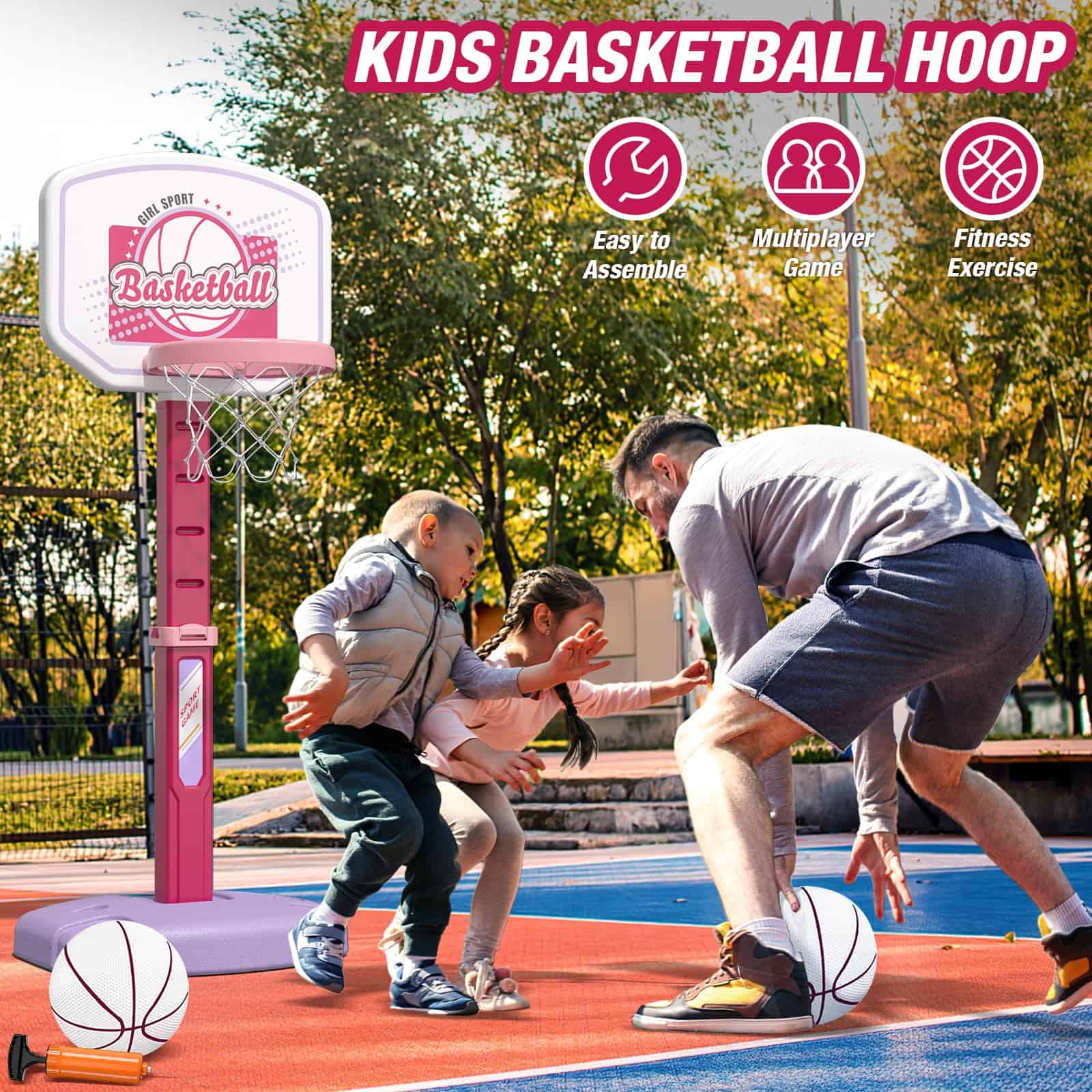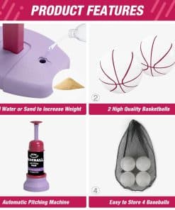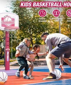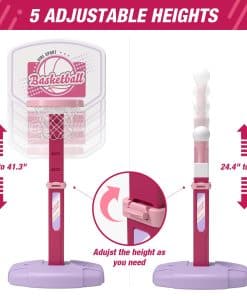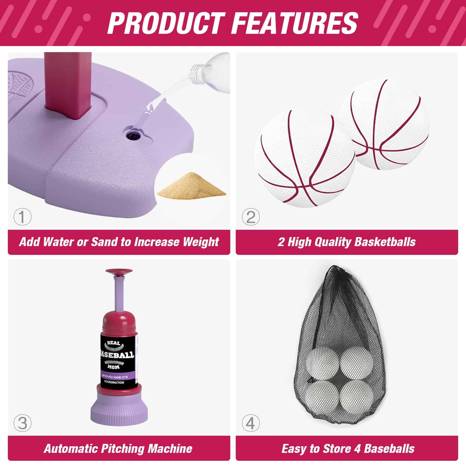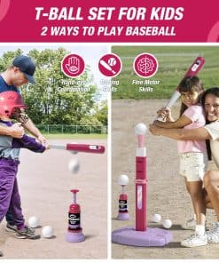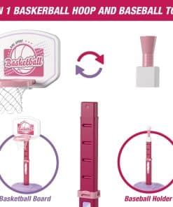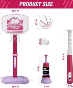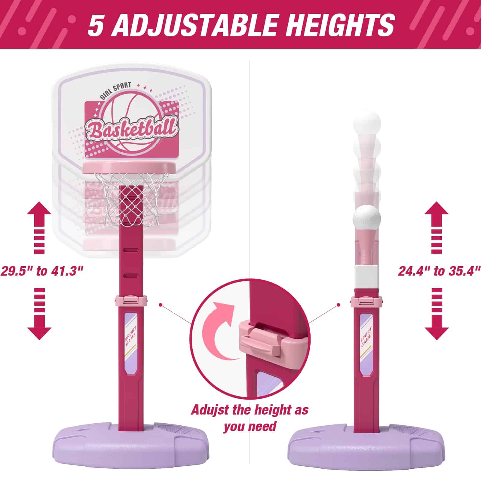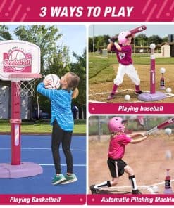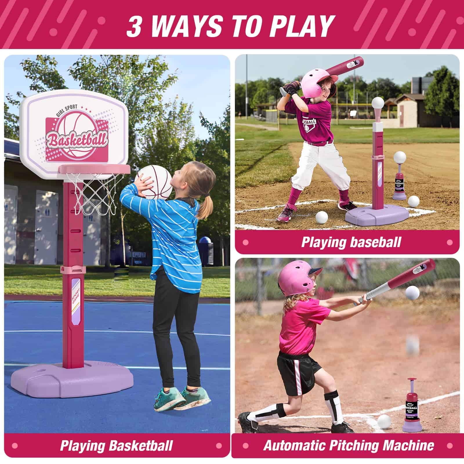 Juego de Canasta de Baloncesto para Niños y Juego de Tee Ball – Altura Ajustable, Soporte de béisbol para niños con Máquina de Lanzamiento Automático, Juguetes Deportivos para Interiores y Exteriores, Regalos para Niños Niñas Edad 1-5, Rosa