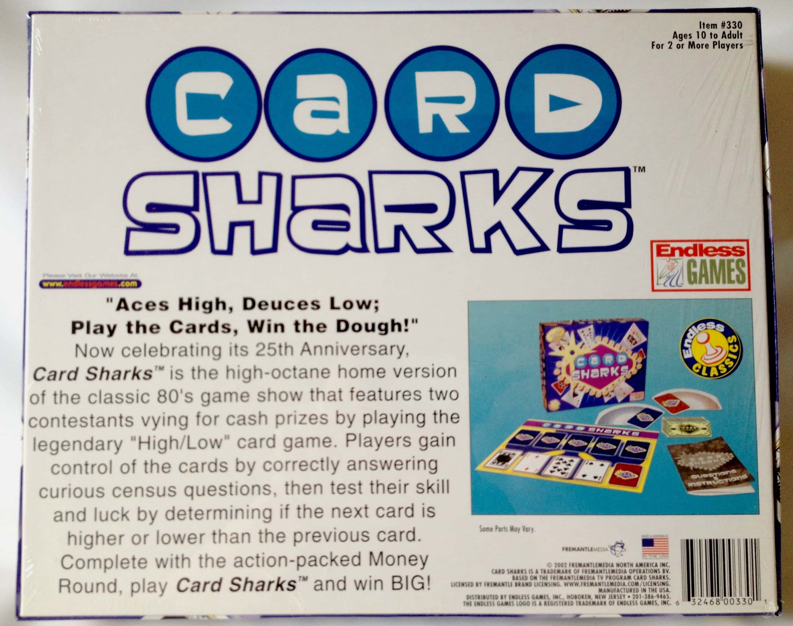 ¡Ases altos, doses bajos, juega las cartas, gana la plata! Para celebrar el 25 aniversario del popular programa de televisión, aquí tienes la versión casera del juego de cartas Acierta o Paga. No ganarás ninguna «plata» real, pero sí tendrás horas de diversión. Los jugadores responden a preguntas censales de «alto/bajo» para ganar el control de las cartas, luego tienen que determinar si la siguiente carta es más alta o más baja que la carta anterior. El juego casero incluso incluye la bonificación de la «Ronda del Dinero.» ¡Reúne a 2 o más jugadores y disfruten de este emocionante y entretenido juego de cartas! ¡Diviértete adivinando y apostando con Acierta o Paga!