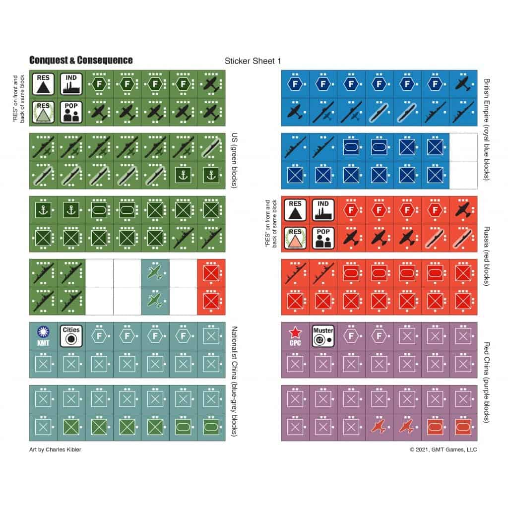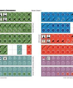 Conquest and Consequence lleva el sistema Triumph and Tragedy al teatro del Pacífico/Este de Asia durante el mismo período de 1936-1945. Al igual que T&T, está diseñado para 3 jugadores, manteniendo la dinámica de 3 bandos que añade tanta variedad e intriga al sistema. Contiene: 22 x 34 Tablero de mapa montado 229 Bloques de madera de 16mm 2 hojas de etiquetas (etiquetas autoadhesivas) 2 hojas de contadores de 2 5/8 55 cartas de Acción 55 cartas de Inversión Reglamento de 24 páginas Cuaderno de reglas de 24 páginas 3 cartas de Ayuda al jugador (cartulina de dos caras) 1 bloc de hojas de registro de juego 4 dados de 6 lados