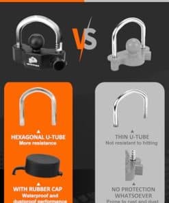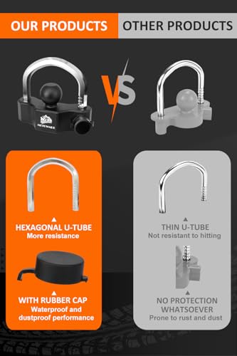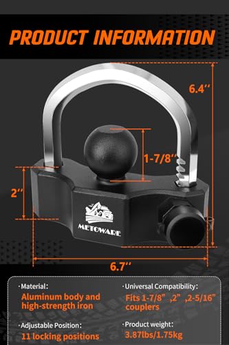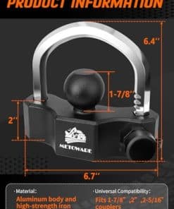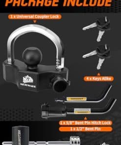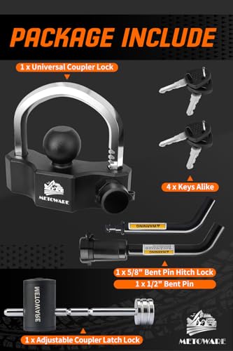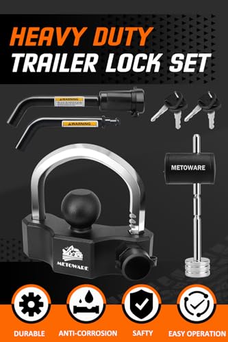 METOWARE Heavy Duty Trailer Coupler Lock Set es un juego completo que incluye todos los cerrojos necesarios para proteger tu remolque de manera segura. La cerradura de enganche es ajustable con 11 posiciones de bloqueo para adaptarse a diferentes tamaños de acoplamientos de remolque. La cerradura de pasador doblado de 1/2″ y 5/8″ es ideal para receptores de remolque de diferentes clases y accesorios. La cerradura de enganche ajustable se puede ajustar desde 1 pulgada hasta 3-1/4 pulgadas para adaptarse a una variedad de acoplamientos. Con un núcleo de alta calidad de aleación de zinc y la última tecnología antirrobo, puedes estar seguro de que tus pertenencias estarán protegidas. ¡Obtén tu conjunto de cerraduras de enganche METOWARE hoy mismo y viaja con tranquilidad!