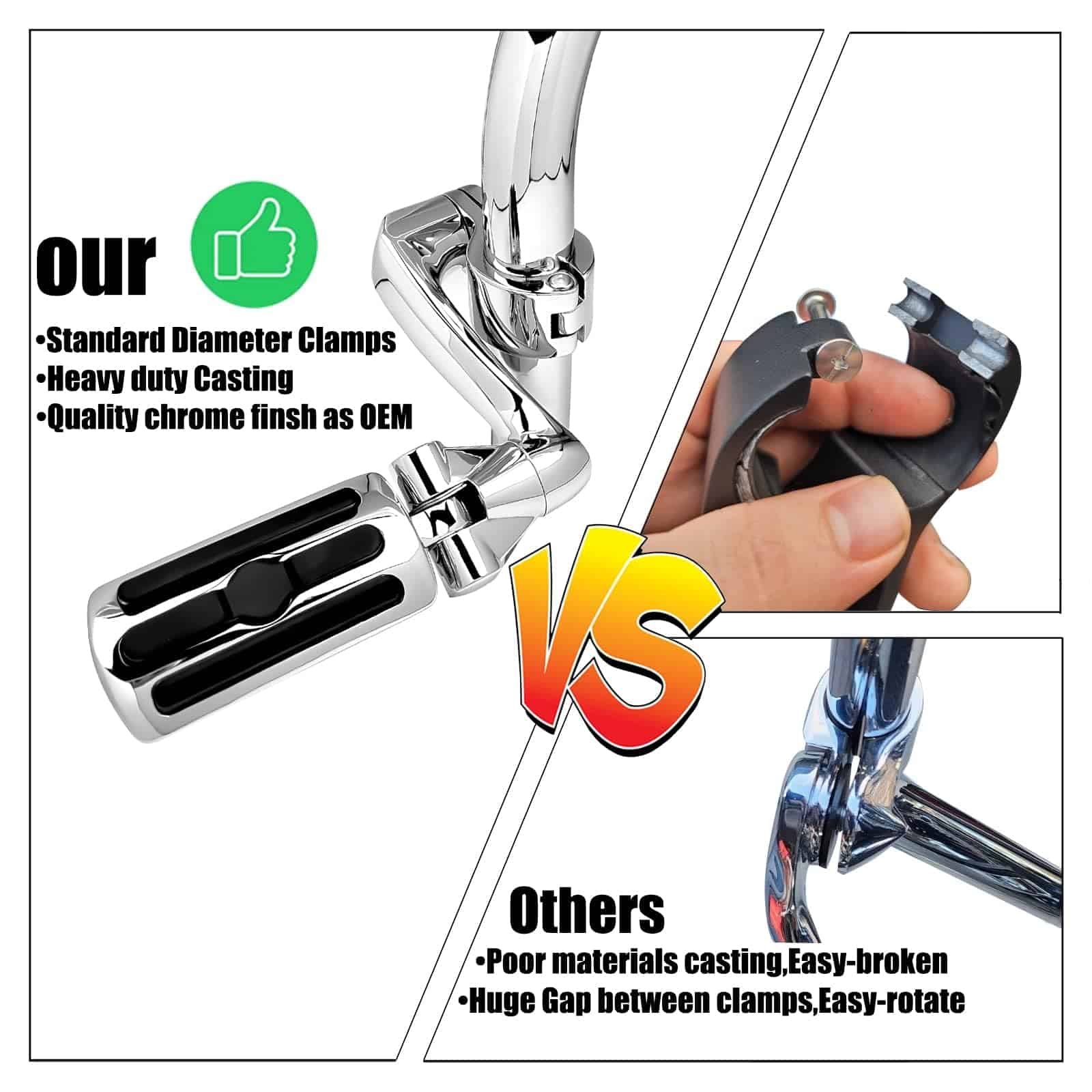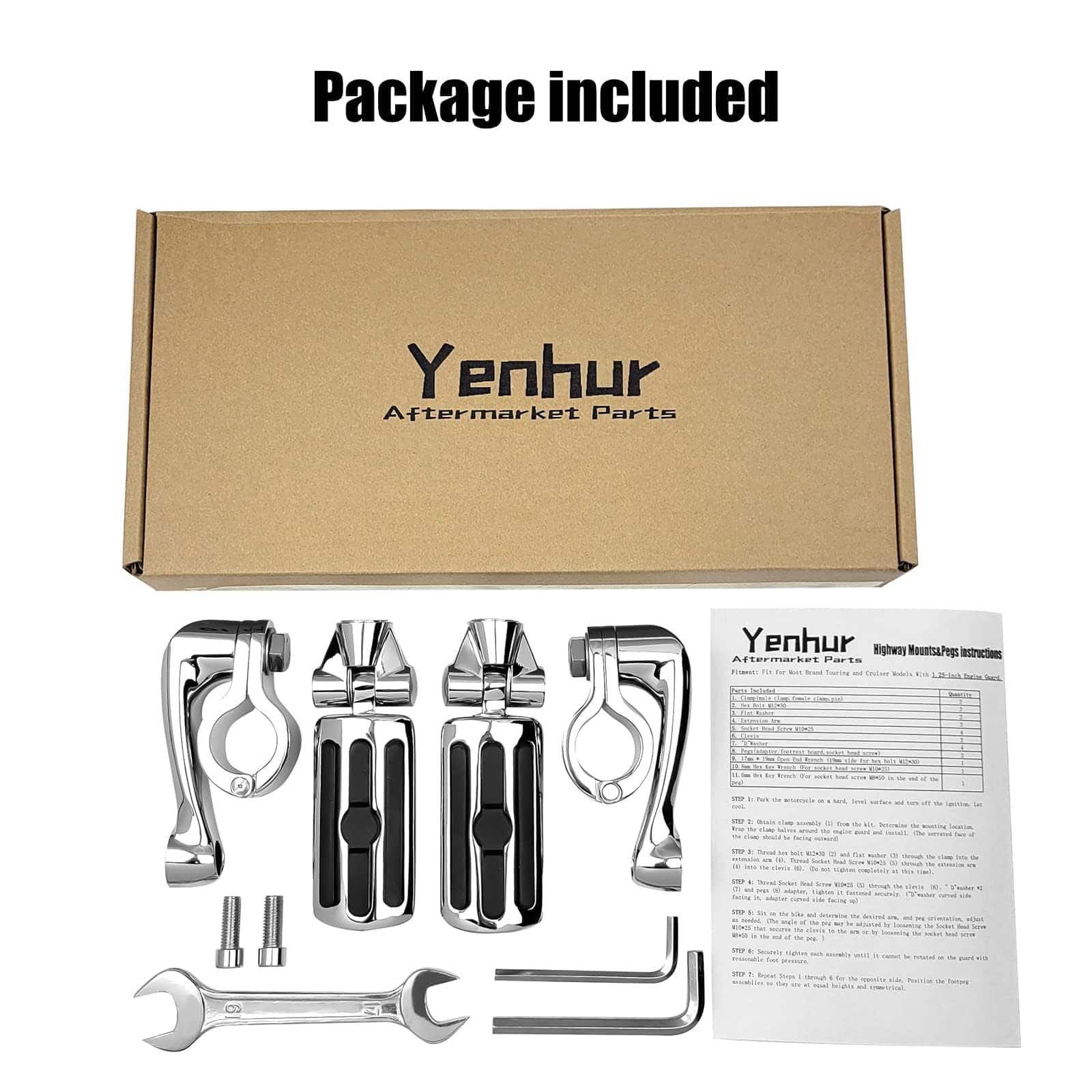 Características: Estado: Postventa 100% nuevo Material: Abrazaderas de fundición de acero de alta resistencia, brazo de extensión y clavijas de caucho premium y aleación de aluminio de calidad Color: Cromo Ajuste (Solo compatible con modelos con defensas de 1.25″ o barra de choque de 1 1/4 pulgadas): No recomendado para motocicletas con carenados inferiores. Road Glide 1998-2022 Road King 1995-2022 Electra Glide 1984-2022 Street Glide 2006-2022 Softail Classic/Custom/Standard/Deluxe/Slim 1983-2022 Cruisers Dyna Super Glide/Street Bob/Wide Glide/Low Rider 1991-2022 Sportster XL Iron 883 1200/Forty-Eight 1988-2022 Honda Shadow Phantom Spirit AERO ACE VT 750 1100 1300 VTX 1300 Retro Kawasaki Vulcan 900 1100 Custom Classic Lt Yamaha V Star 250 650 950 1100 1300 Tourer Classic Road Star s Suzuki Boulevard C50 T Indian Cheif Chieftain Scout Paquete incluido: Un kit de montaje y clavijas de autopista, llave de montaje requerida para la instalación, manual de instalación. Servicio: Para cualquier consulta sobre nuestros productos, no dude en contactarnos. Nuestro equipo de servicio resolverá los problemas del cliente de manera oportuna y perfecta.