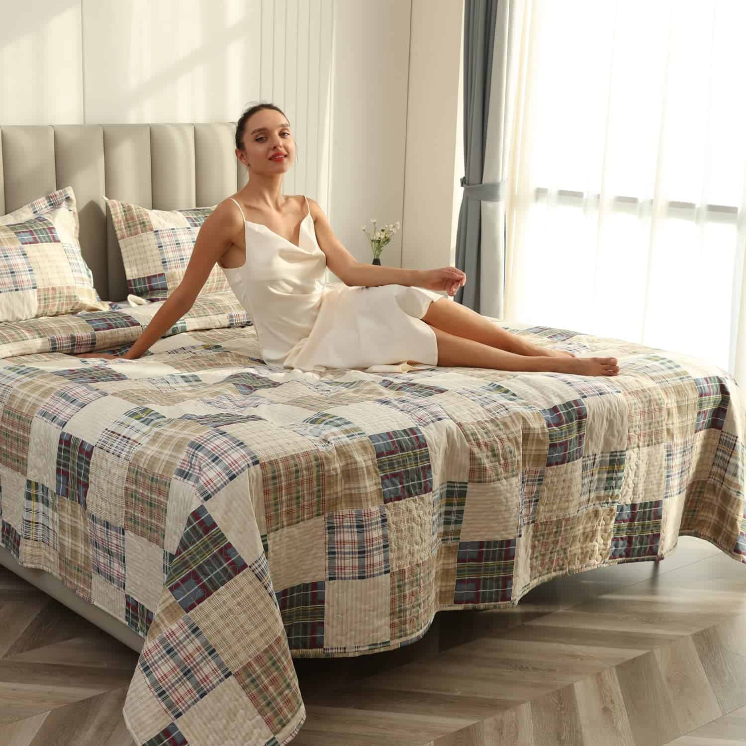 Material suave y duradero: El juego de colcha a cuadros beige está hecho de material de poliéster de microfibra de alta calidad, doble cepillado en ambos lados para una suavidad y comodidad máximas. Colcha ligera, transpirable y cálida al dormir. Crea una experiencia de sueño fácil y cómoda, te ayuda a disfrutar de un día familiar especial y fácil.