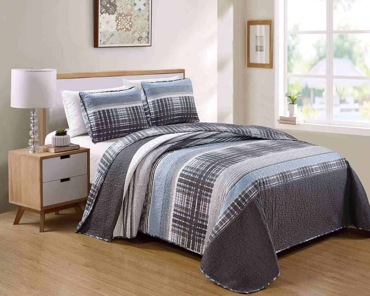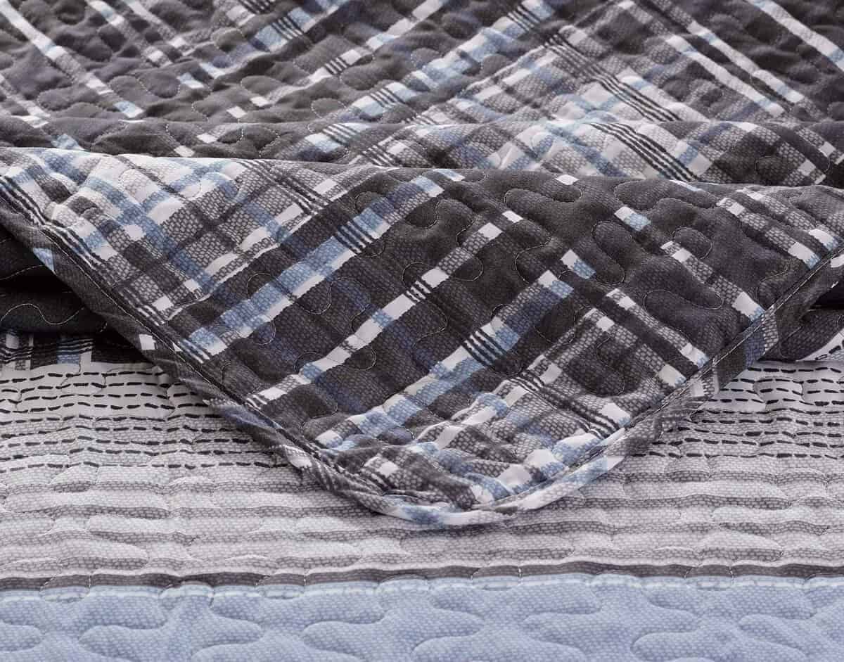 Colcha Acolchada Reversible de Lujo de 3 Piezas para Cama King/California King Moderno a Cuadros en tonos Azul, Gris y Blanco. Este juego incluye una colcha de tamaño generoso y dos fundas de almohada a juego. Confeccionado con microfibra de alta calidad, este juego es suave al tacto y fácil de cuidar gracias a que es lavable a máquina. Añade un toque de elegancia y comodidad a tu dormitorio con este juego de colcha moderno y reversible.
