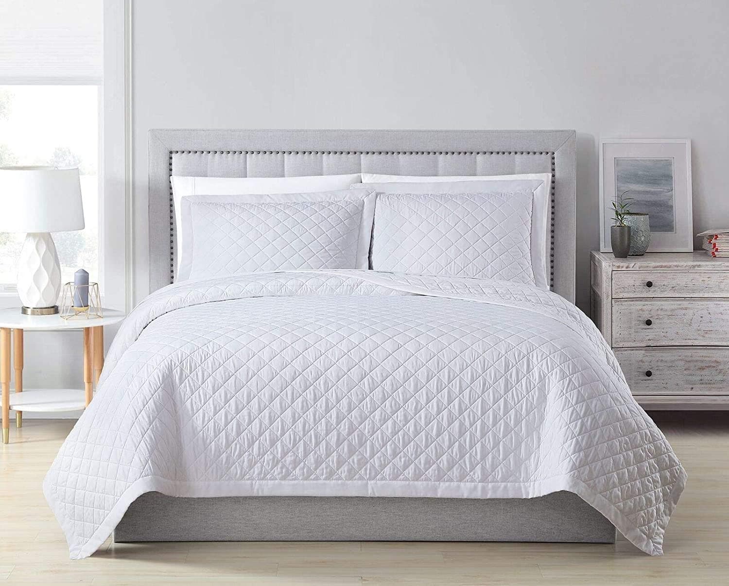 La Juego de Colcha Chezmoi Collection Owen de 3 Piezas está diseñada para ofrecer un nivel superior de comodidad y estilo a su dormitorio. Este juego de colcha incluye una colcha y dos fundas de almohada, todo en un elegante color blanco diamante. La colcha Queen size mide 92″ x 96″ y las fundas de almohada tienen unas dimensiones de 20″ x 26″.