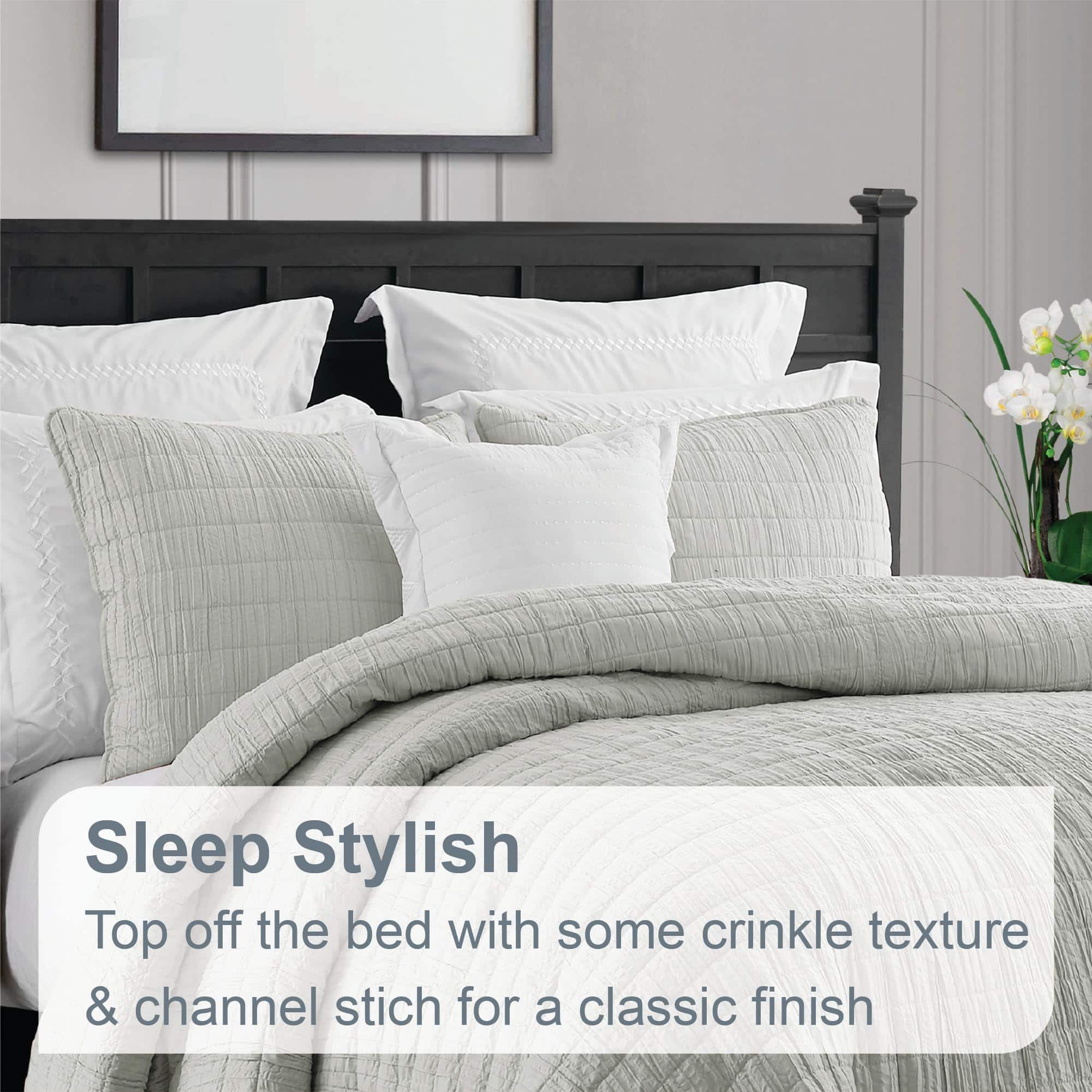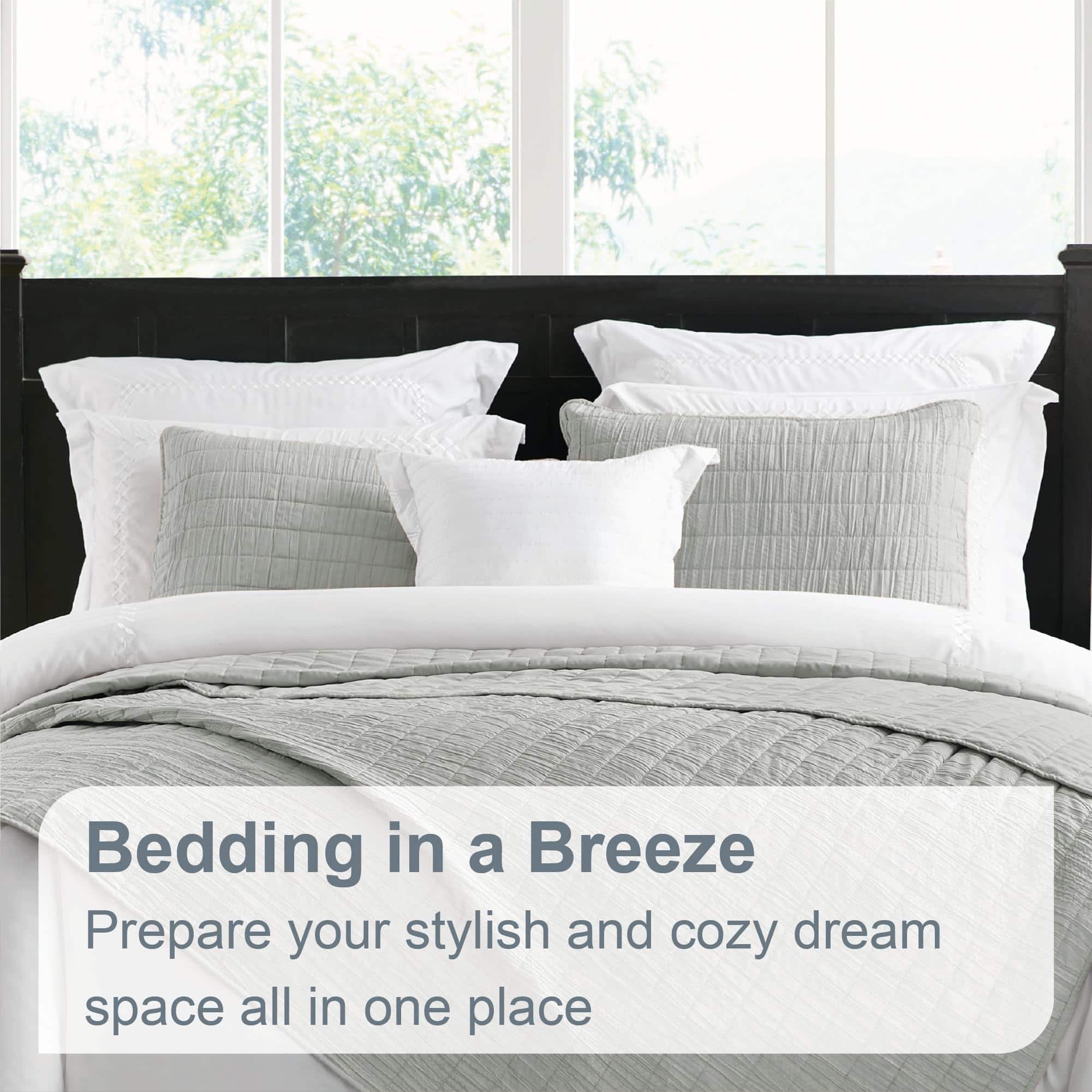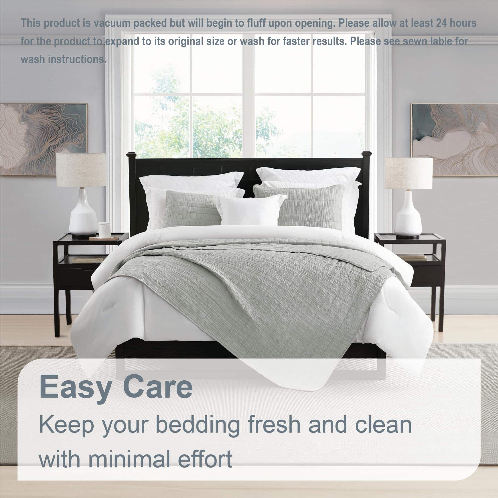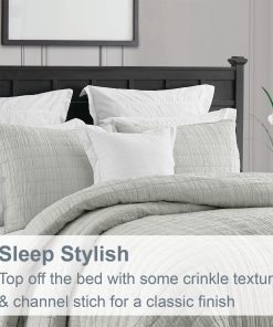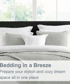 Tejido exterior de microfibra de poliéster 100%; Relleno de algodón/poliéster al 50%. La microfibra es una fibra ultrafina que puede estar hecha de poliéster, nailon y/o combinaciones. La mezcla de algodón poliéster permite una mejor transpirabilidad y no desencadenará sensibilidades. Set Full/Queen Incluye: una colcha extragrande de 92 x 92 pulgadas y dos fundas estándar de 20 x 26 pulgadas. Cuidado fácil: Lavar a máquina en ciclo suave con agua fría y colores similares. Luego secar a baja temperatura y retirar de inmediato para obtener los mejores resultados. Por favor, tenga en cuenta que debido a la diferencia en la iluminación y los ajustes del monitor, el color del producto real puede variar ligeramente de lo que ve en pantalla.