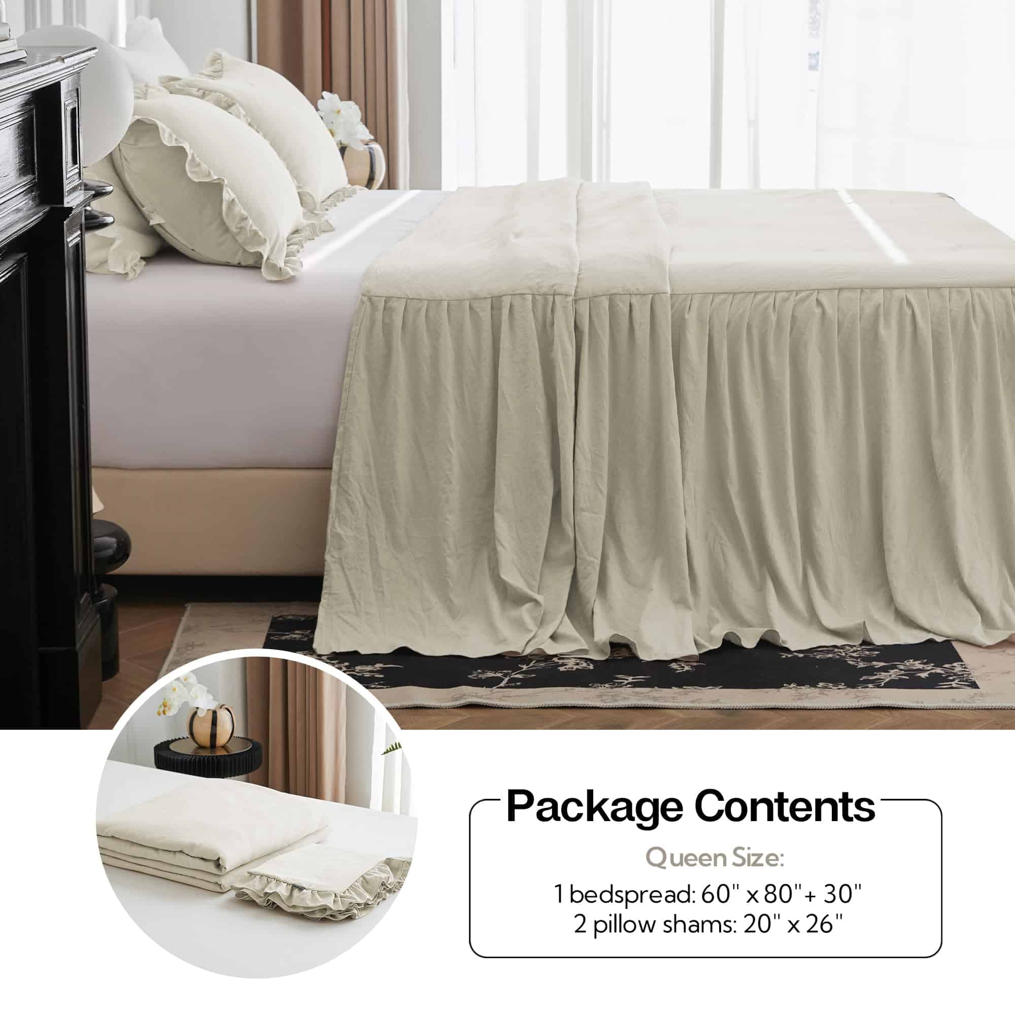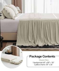 1. TELA CON TEXTURA ARRUGADA: Este juego de colcha está confeccionado en microfibra lavada a la piedra, una tela tratada especial que es mucho más suave que la microfibra normal y se caracteriza por sus arrugas naturales en la superficie, agregando una vibra relajante y sin esfuerzo que complementa perfectamente el estilo de granja, shabby chic, rústico y boho. 2. BORDES RIZADOS NATURALES: A diferencia de los volantes sueltos, nuestra colcha tiene volantes más finos y diminutos para un drapeado natural y aireado. La caída de 30 pulgadas cae elegantemente al suelo, manteniendo la cama ordenada y elegante mientras le da un encanto romántico a tu dormitorio. 3. DISEÑO PRÁCTICO: La capa superior cuenta con acolchado para mayor suavidad y mejor ajuste, mientras que la costura ajustada asegura que el relleno se mantenga en su lugar de forma segura y evita que el acolchado se desplace, brindándote una experiencia de usuario cómoda. 4. JUEGO DE COLCHA 3 PCS: Tamaño completo: 1 colcha 55″x80″+30″ y 2 fundas de almohada a juego 20″x26″; Tamaño queen: 1 colcha 60″x80″+30″ y 2 fundas de almohada a juego 20″x26″; Tamaño king: 1 colcha 80″x83″+30″ y 2 fundas de almohada a juego 20″x42″. 5. CUIDADO FÁCIL, COMPAÑERISMO A LARGO PLAZO: Lavable a máquina para tu comodidad. Simplemente sigue nuestras instrucciones de cuidado para mantener la tela suave y duradera. Si tienes alguna pregunta, no dudes en contactarnos para recibir soporte.