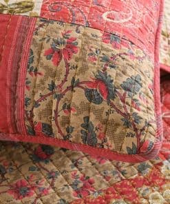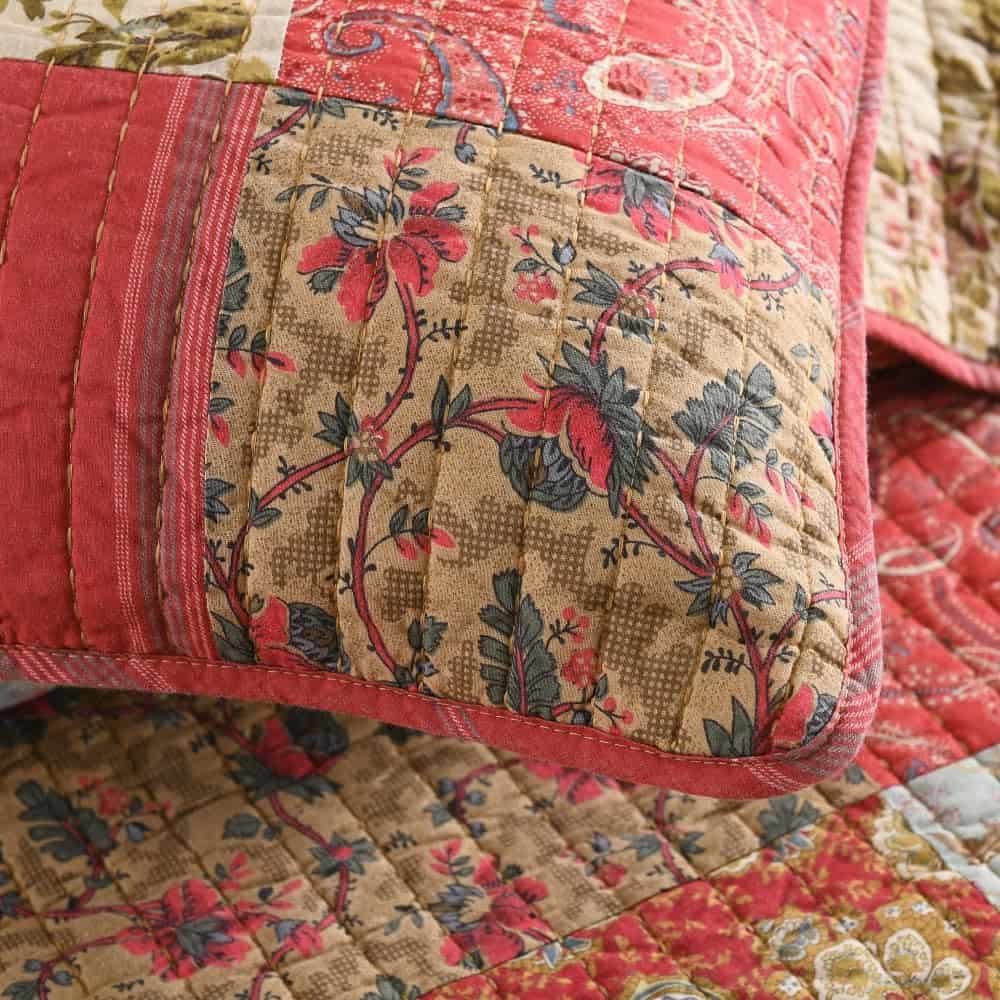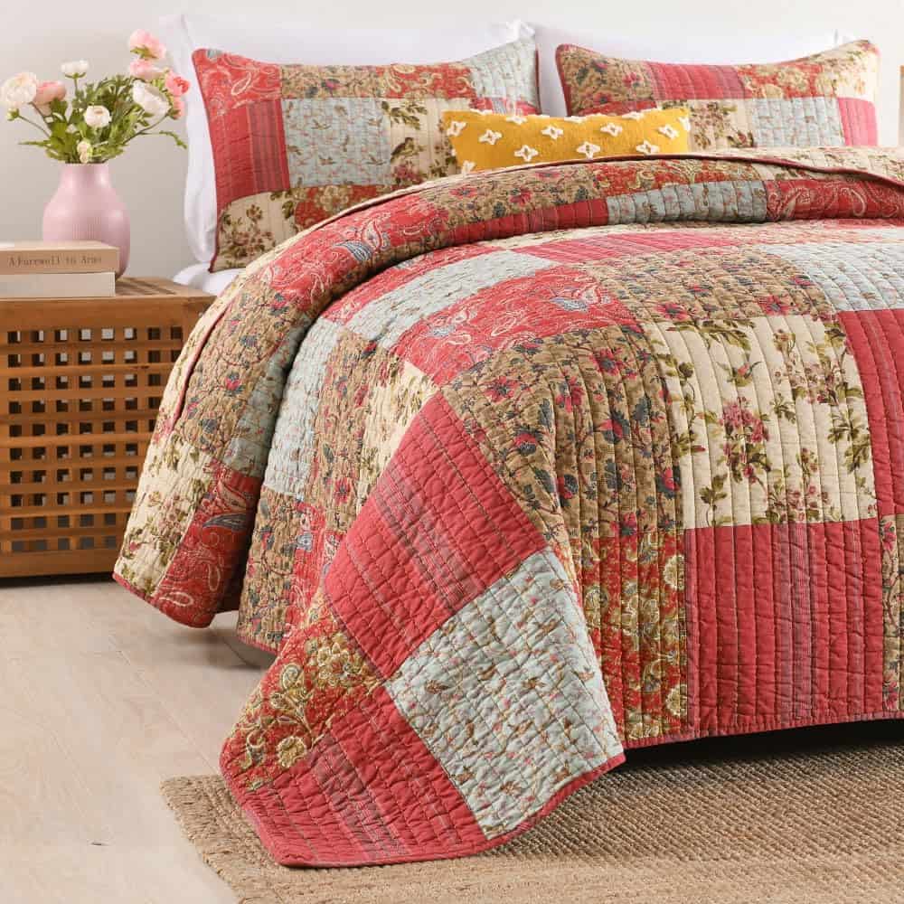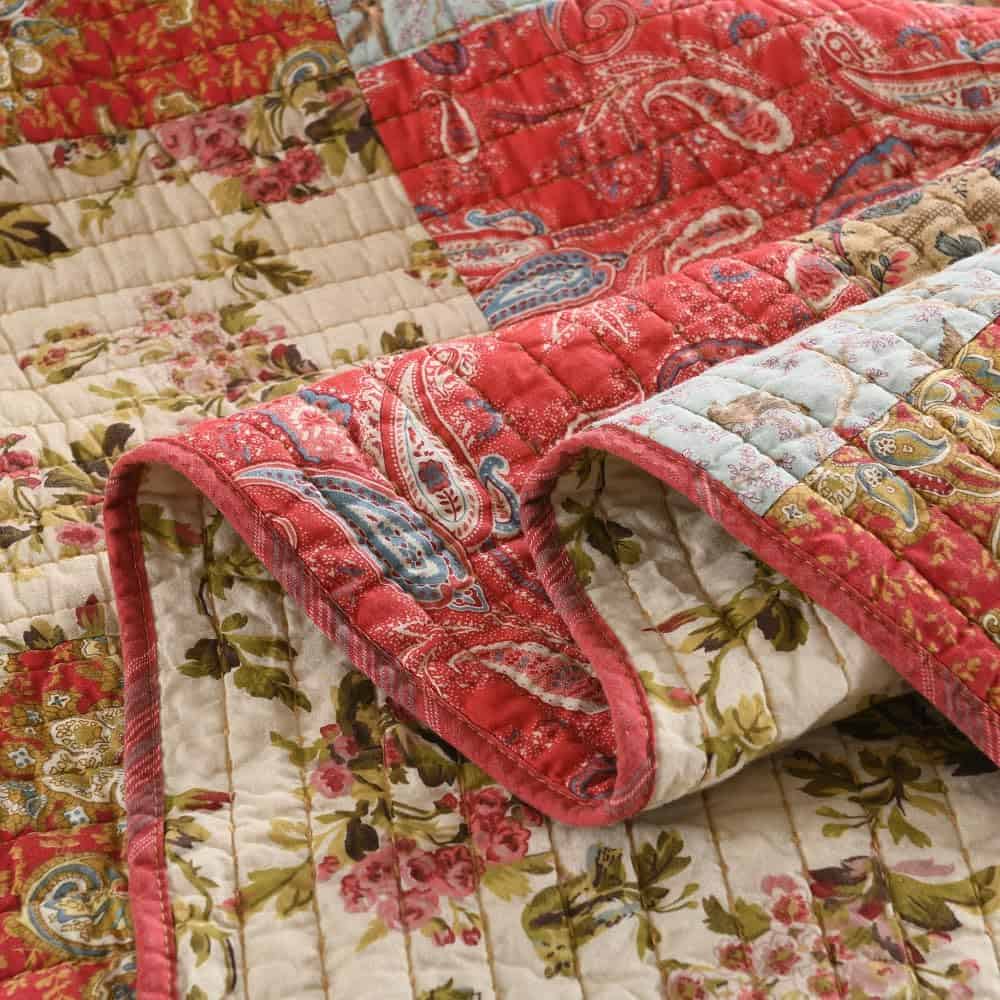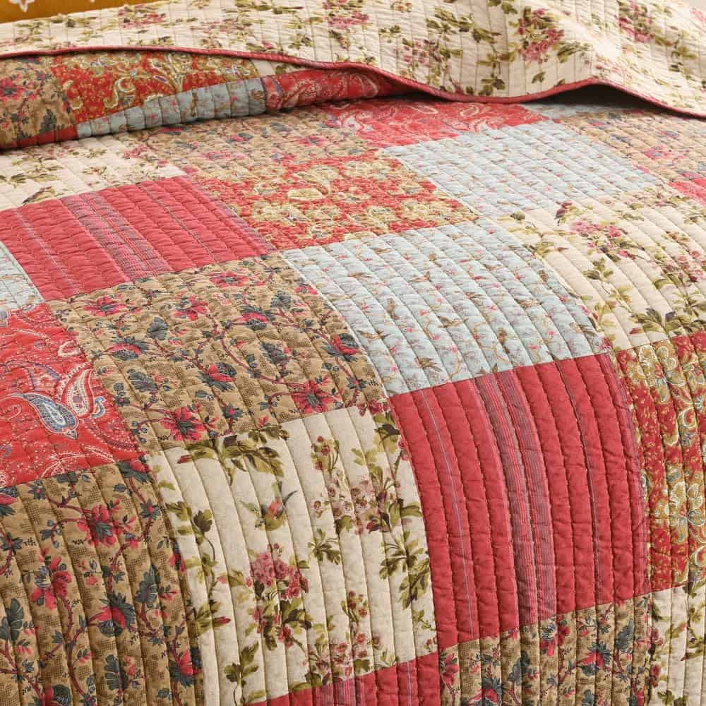 3. Diseño rústico vintage: Diseño de patchwork vintage en rojo y azul con varios tipos de patrones florales que traen a tu habitación un espacio vívido y noble. Uso reversible con un patrón floral beige en la parte trasera.