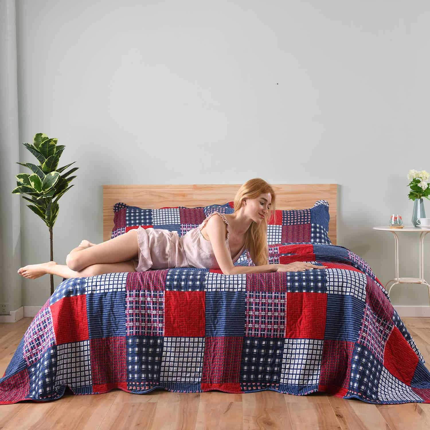 Juego de Colcha de Cuadros Rojos y Azules Hailea Tamaño Completo/Queen Size Ropa de Cama Country Patchwork Ligera Colcha Reversible Cubrecama con Funda de Almohada Juego de Cama para Todas las Estaciones. La colcha del juego de 3 piezas para tamaño completo/queen size incluye 1 colcha y 2 fundas de almohada estándar. La colcha de tamaño completo/queen size mide 90 x 90 pulgadas. La funda de almohada de tamaño estándar mide 20 x 26+2 pulgadas. Diseño de 3 capas con patrón de cuadros rojos y azules, compuesto por 3 capas separadas que se cosen cuidadosamente juntas. Relleno de poliéster sintético ligero en la colcha, cubrecama ligero, fresco en verano y cálido en invierno. La ropa de cama de cuadros rojos y azules es de material de poliéster de microfibra de alta calidad, cepillado doble en ambos lados para una suavidad y comodidad definitivas. Colcha ligera, transpirable y cálida al dormir. Crea una experiencia de sueño fácil y cómoda, ayudándote a disfrutar de un día familiar especial y relajado. Colcha de cuadros rojos y azules suave y ligera, lavable a máquina en agua fría y secar en ciclo suave, lavar por separado de colores diferentes. Resistente a desvanecimientos, manchas, encogimientos y arrugas. Suave y duradera, el color no se desvanecerá tras lavar, el material de poliéster de microfibra puede mantener la forma y suavidad después de lavar repetidamente. Decora tu dormitorio, habitación de invitados, casa de vacaciones con este único y elegante juego de colcha de cuadros rojos y azules cubrecama, lo suficientemente ligero para llevar cuando viajas o participas en actividades al aire libre con tu familia para apreciar la belleza de la naturaleza, conveniente y práctico. La colcha de cuadros también puede ser un regalo maravilloso para bodas, cumpleaños, vacaciones y muchas otras ocasiones.