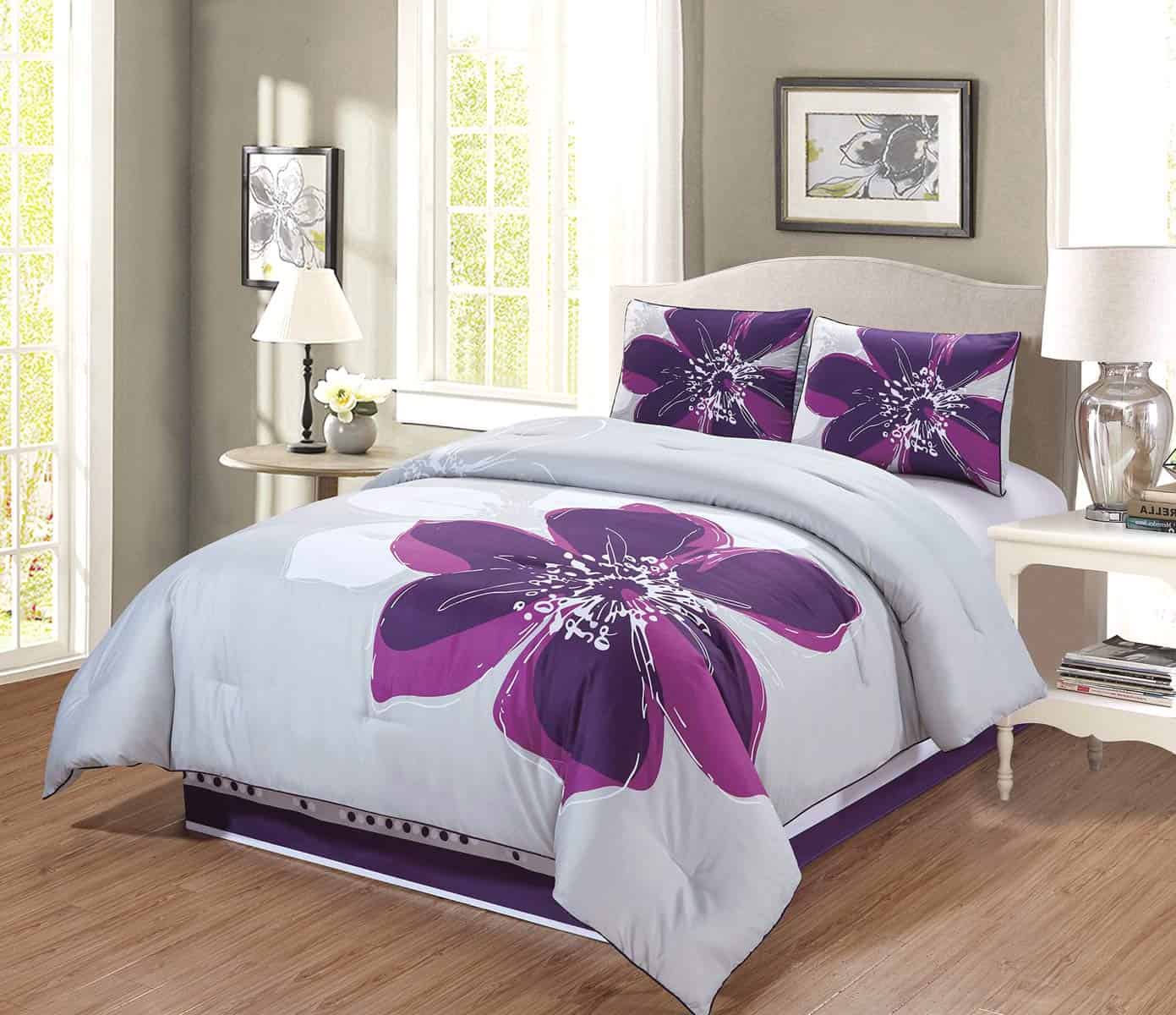 Juego de Colcha de Hibiscos Florales en Gris, Morado y