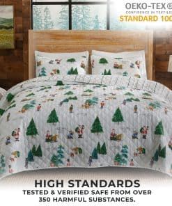 Esta colcha de Navidad de alta calidad cuenta con un diseño encantador de Santa y sus amigos en acuarela. Es suave, ligera y cómoda, perfecta para mantenerte cálido y acogedor durante todo el año. Esta colcha reversible está diseñada para ser utilizada en todas las estaciones y cuenta con un diseño navideño que complementará perfectamente tu decoración durante las fiestas. El juego incluye una colcha completa / queen de 90″ x 90″ y 2 fundas de almohada estándar de 20″ x 26″. Este juego de ropa de cama es duradero y fácil de cuidar, ya que es lavable a máquina. Simplemente lávalo con agua fría y sécalo a baja temperatura. Incluso puedes plancharlo si es necesario para obtener esa sensación de ropa de cama de hotel. Puedes tener la tranquilidad de que tu ropa de cama está limpia y fabricada con materiales de calidad, libres de químicos y tintes dañinos. En Great Bay Home, nuestra prioridad es la satisfacción del cliente. Estamos seguros de que te encantará este juego de colcha navideña, pero si por alguna razón no estás satisfecho, nuestro equipo de atención al cliente estará encantado de ayudarte a solucionarlo. ¡Elige la calidad y el confort con nuestros productos de ropa de cama!