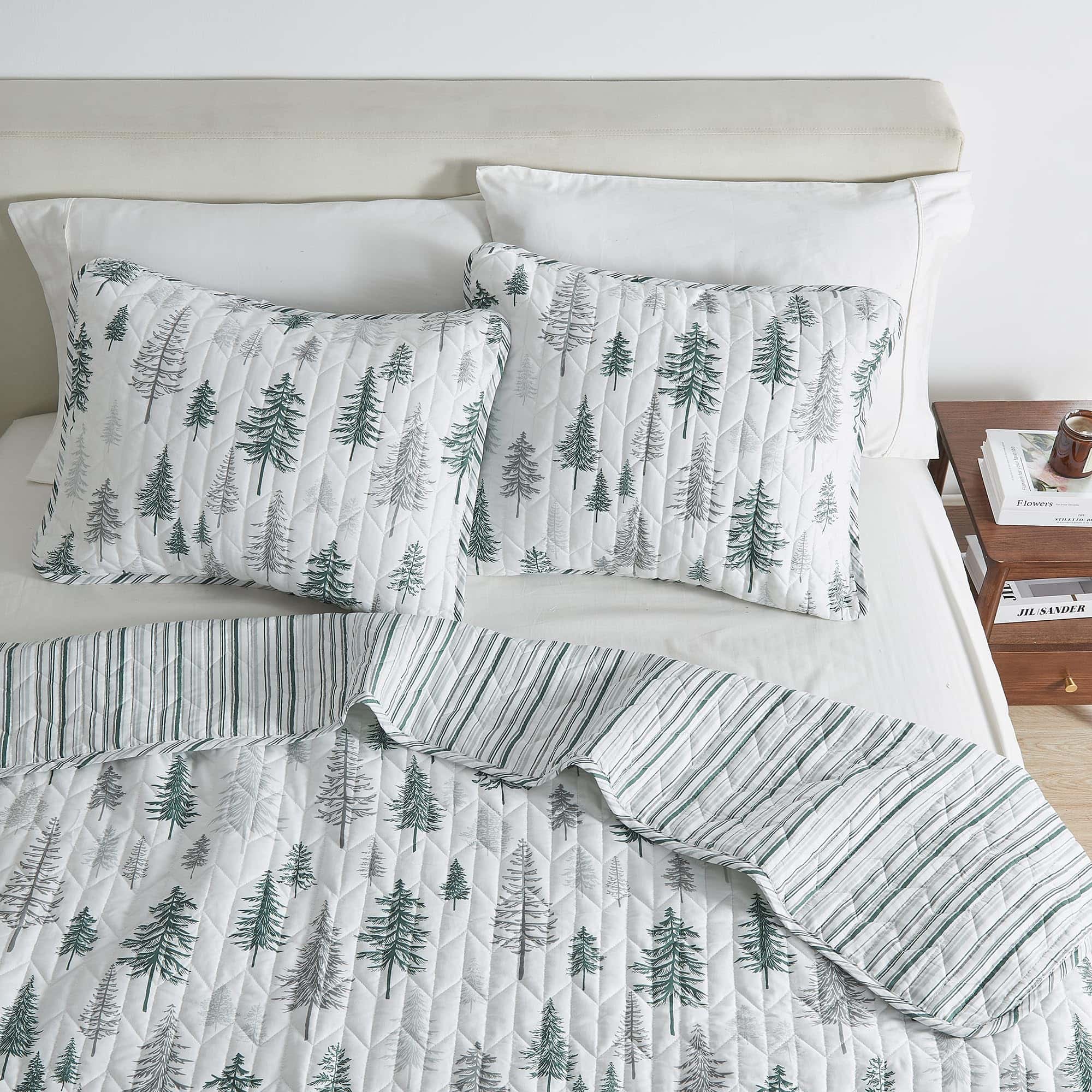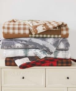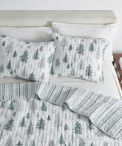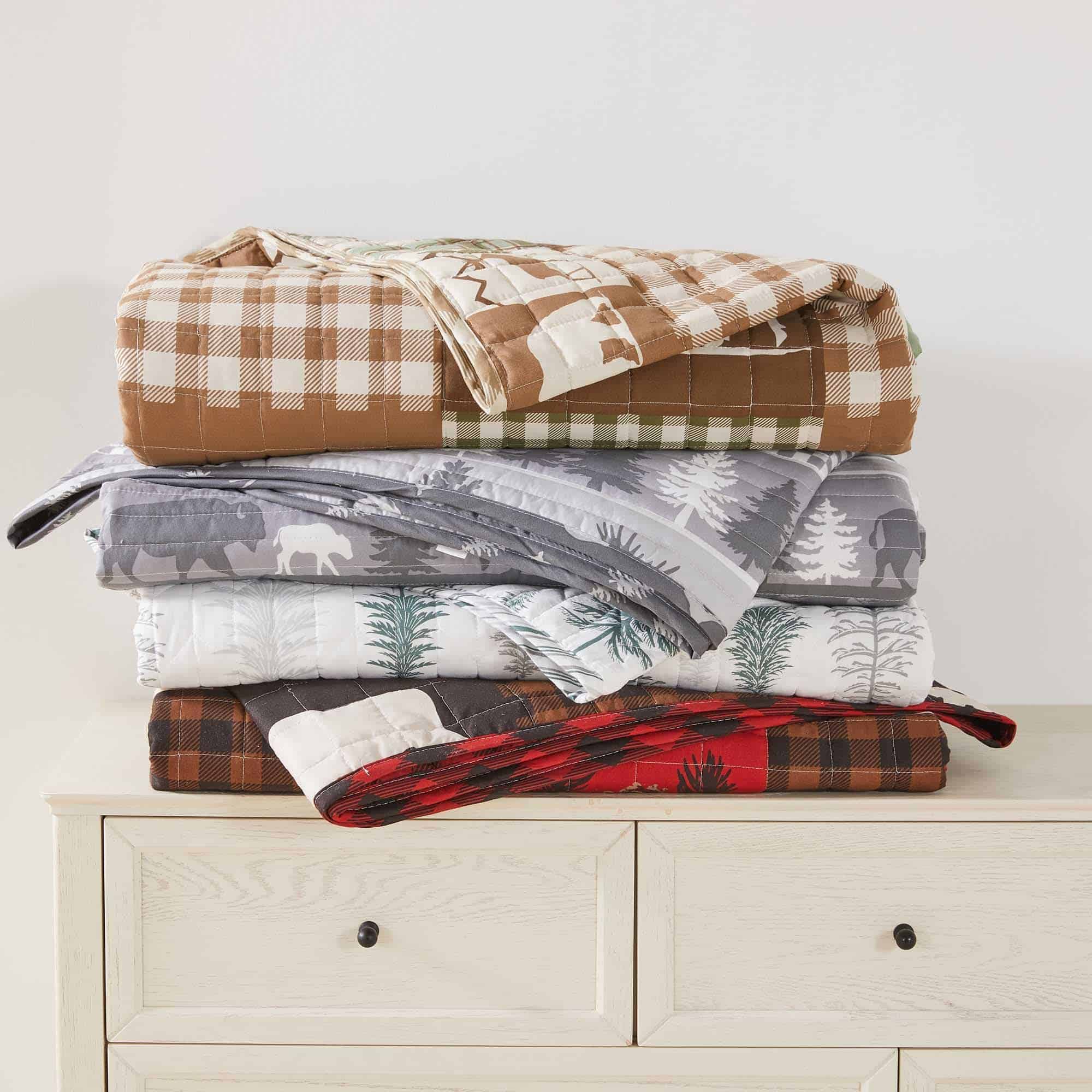 1. Estampado de Cabaña Rústica: Complementa tu decoración de cabaña en el lago con un juego de colcha inspirado en la naturaleza y en la cabaña. Este juego presenta elementos como animales y árboles, hasta patrones reversibles de cuadros con fundas de almohada a juego. Los diseños en las fundas de almohada pueden variar.