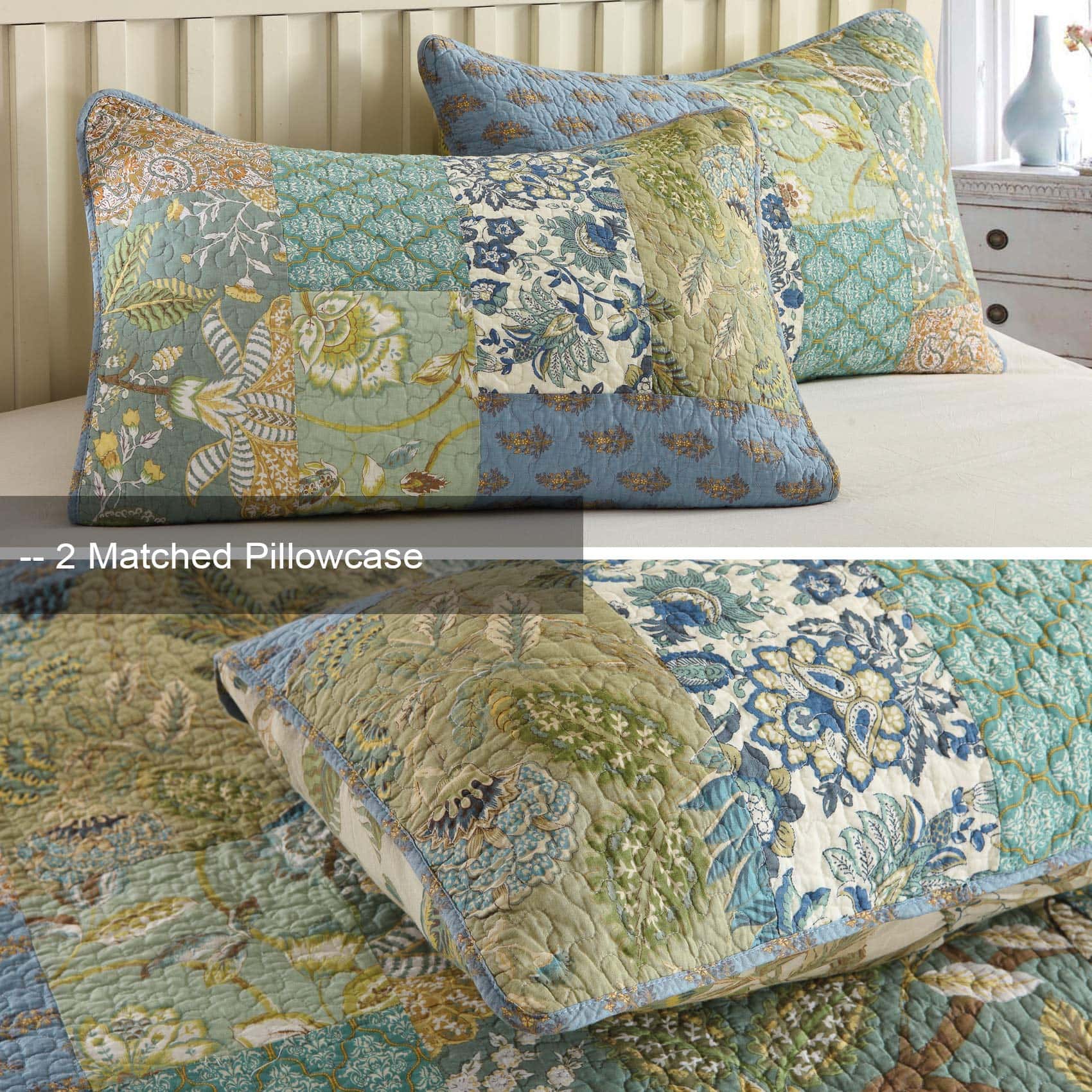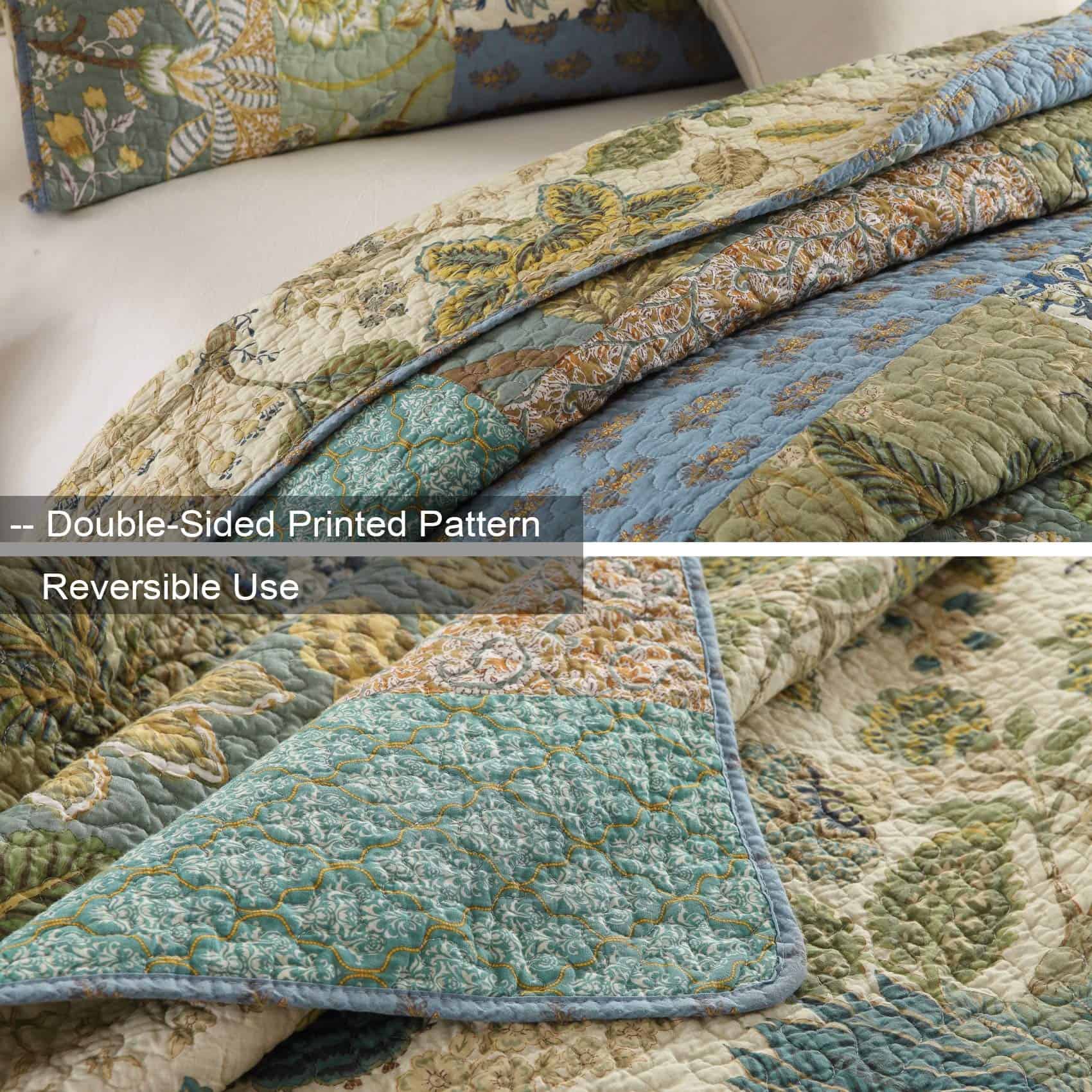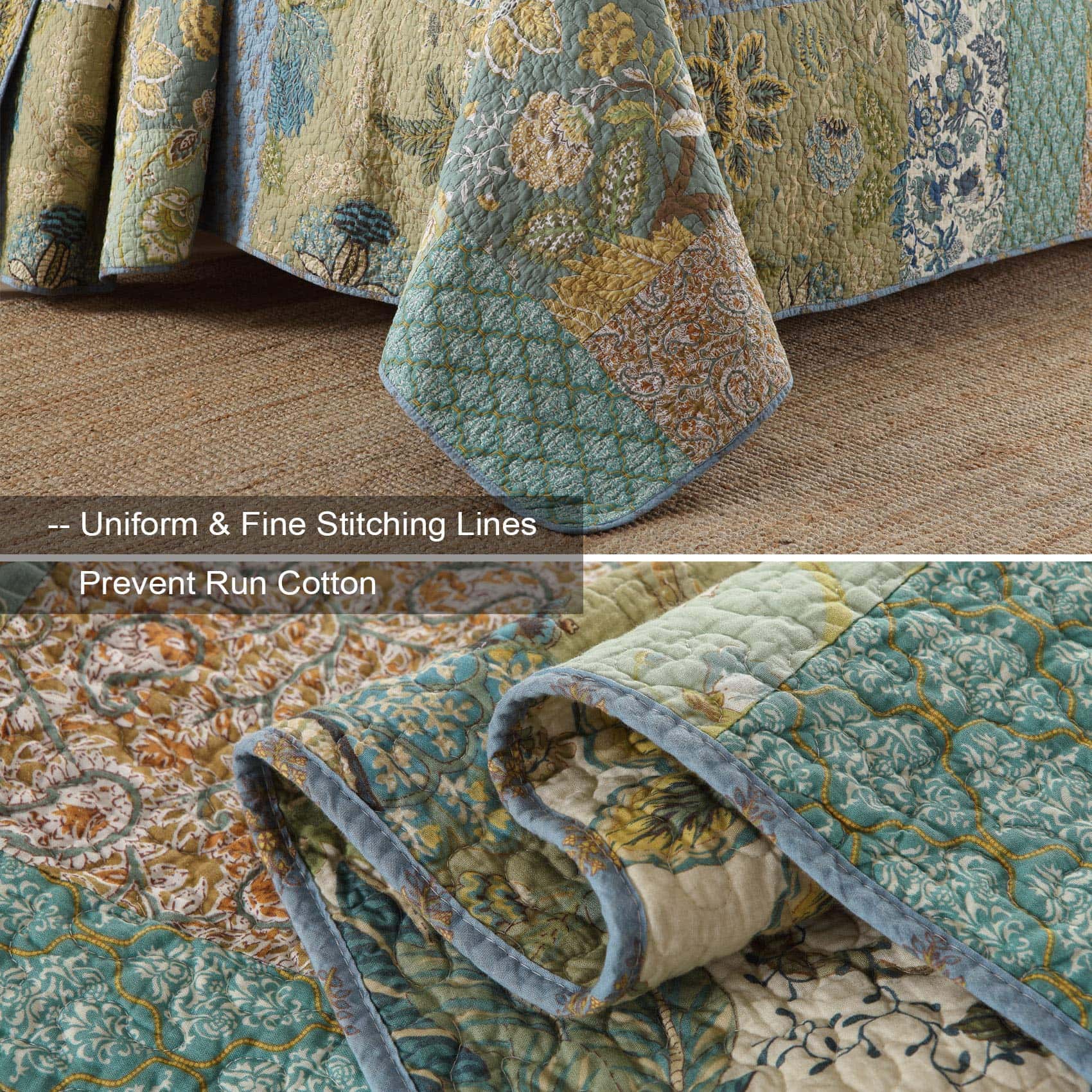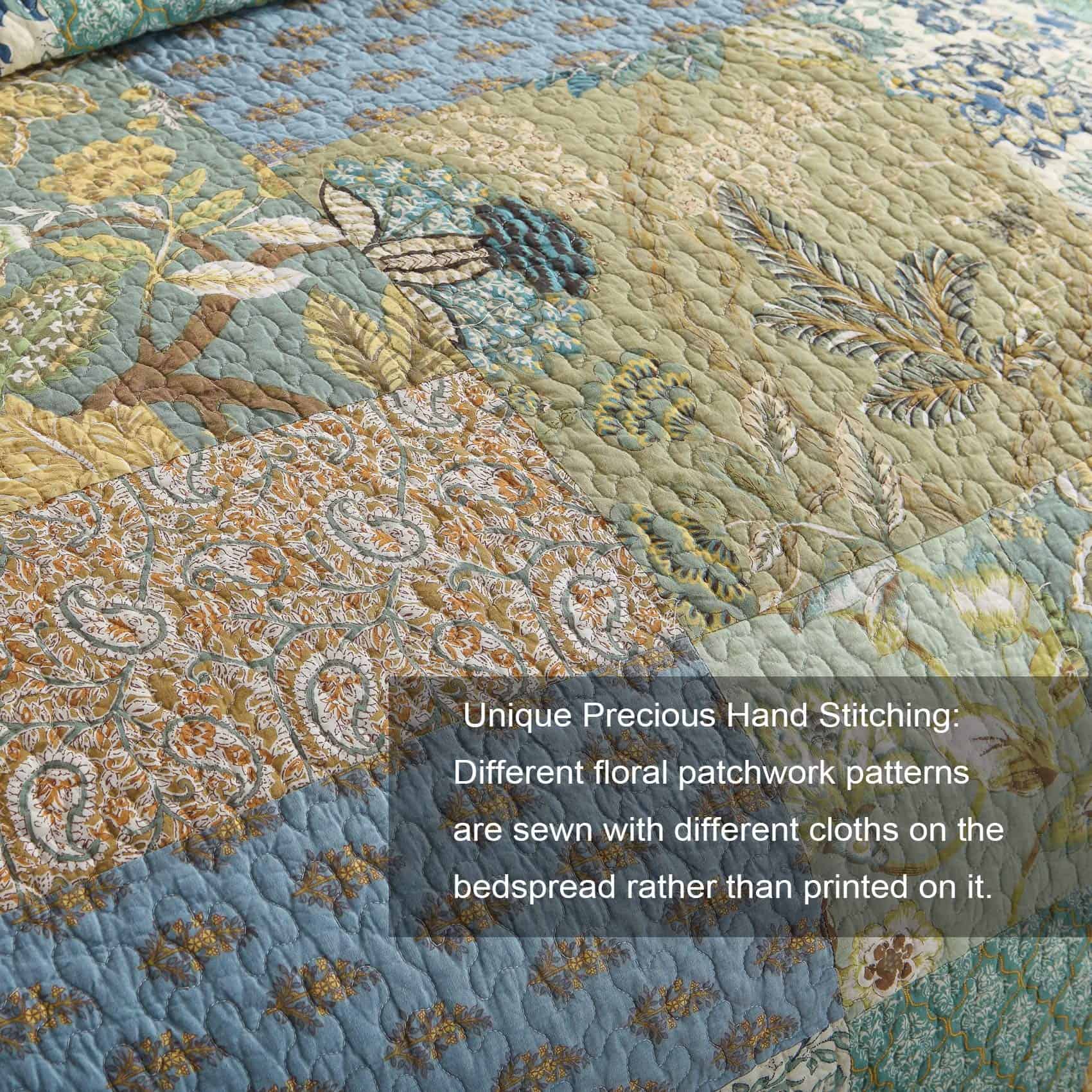 El Juego de Colcha Edredón de Algodón MaiuFun garantiza tanto buena función como confort, brindando una experiencia más cómoda y conveniente. Sobre el Producto- Tela: 100% Algodón, Relleno: fibra de algodón 100%, características suave, acogedor, transpirable, con buena conservación del calor, lavable y duradero, sin decoloración, sin encogimiento.- Artesanía: Líneas de costura uniformes y finas para garantizar que se pueda lavar múltiples veces sin que se corra el algodón o se deforme, se puede lavar directamente en la lavadora.- Varios Colores: Bonitos Patrones de Patchwork Floral Impreso, elige cualquiera para cumplir con tus expectativas de belleza.- Fácil de Decorar: Dos fundas de almohada a juego se incluirán en nuestros juegos de colcha, fáciles de combinar. MultipropósitoNo importa cuándo ni dónde, es una excelente opción durante todo el año. En la temporada fría, puedes usarlo como una capa adicional sobre un edredón o funda nórdica. TamañoColcha Tamaño Queen: 1X Colcha (90 x 98 pulgadas) + 2 X Fundas de Almohada a juego (20 x 27 pulgadas)Colcha Tamaño King: 1X Colcha (96 x 108 pulgadas) + 2 X Fundas de Almohada a juego (20 x 36 pulgadas)Cuidado Fácil y GarantíaLavable a máquina en agua fría y sin blanquear. Si tienes alguna pregunta, no dudes en contactarnos. Resolveremos el problema lo antes posible.