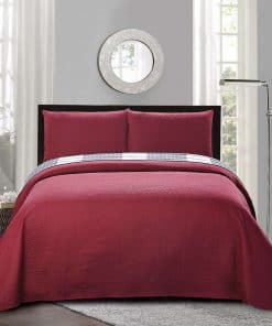 1. Construcción 100% poliéster resistente y fácil de limpiar. 2. 1 colcha tamaño king/cal king acolchada (118″ x 106″). 3. 2 fundas de almohada a juego tamaño king/cal king (20″ x 36″ cada una). 4. Patrón a rayas/cuadros grises, blancos y negros que se revierte a un color burdeos sólido. 5. Elegante acolchado en los tres piezas.