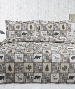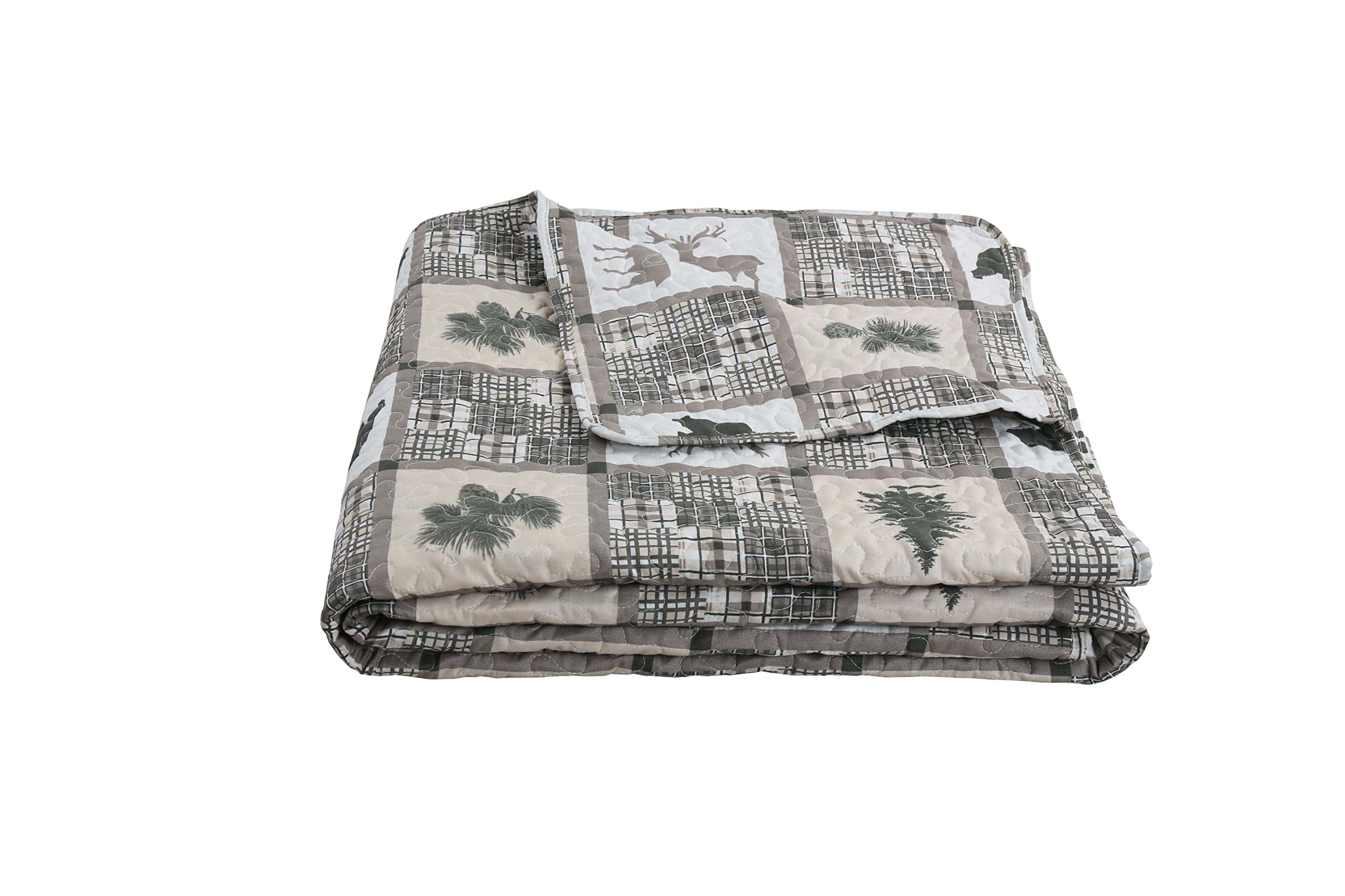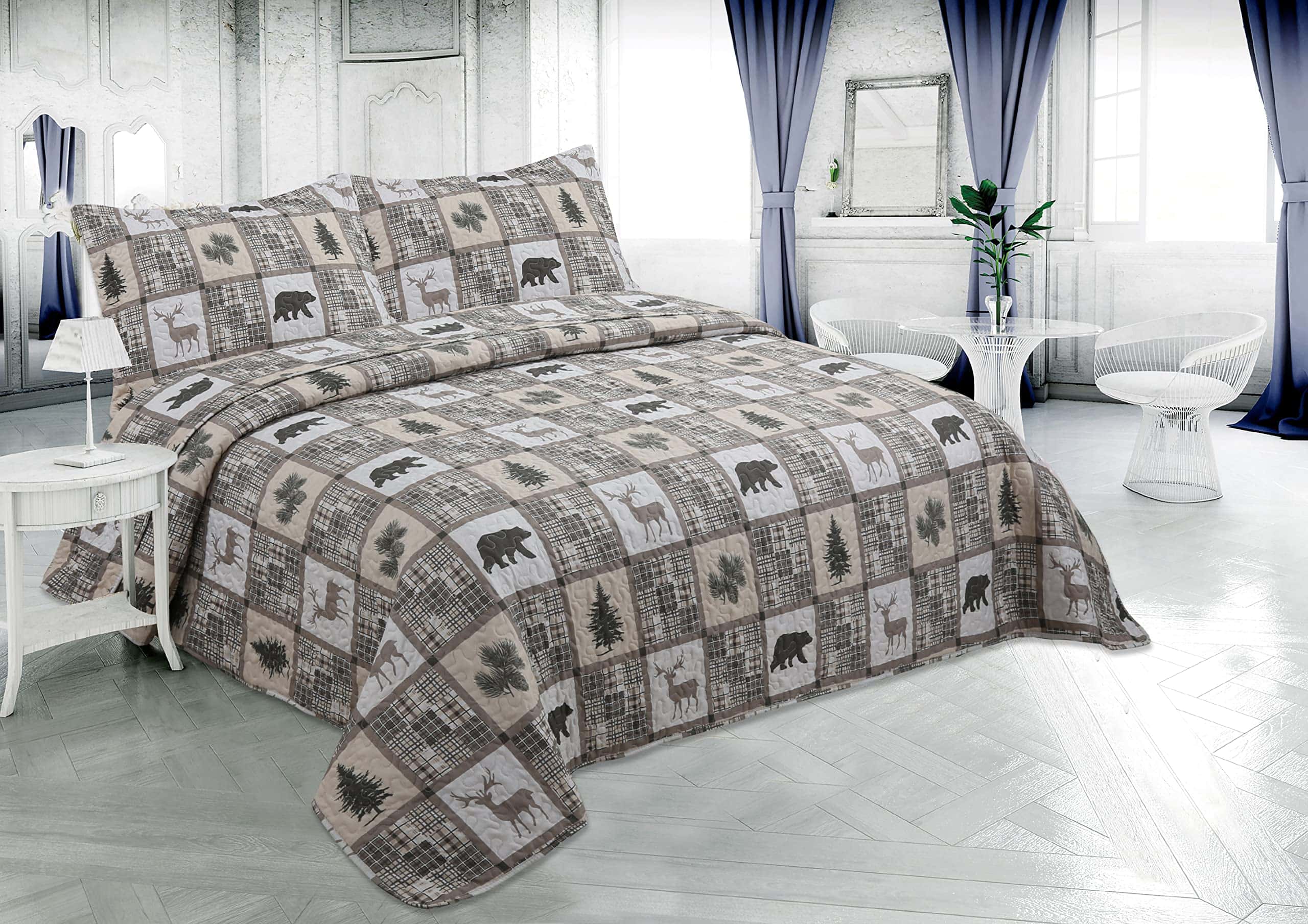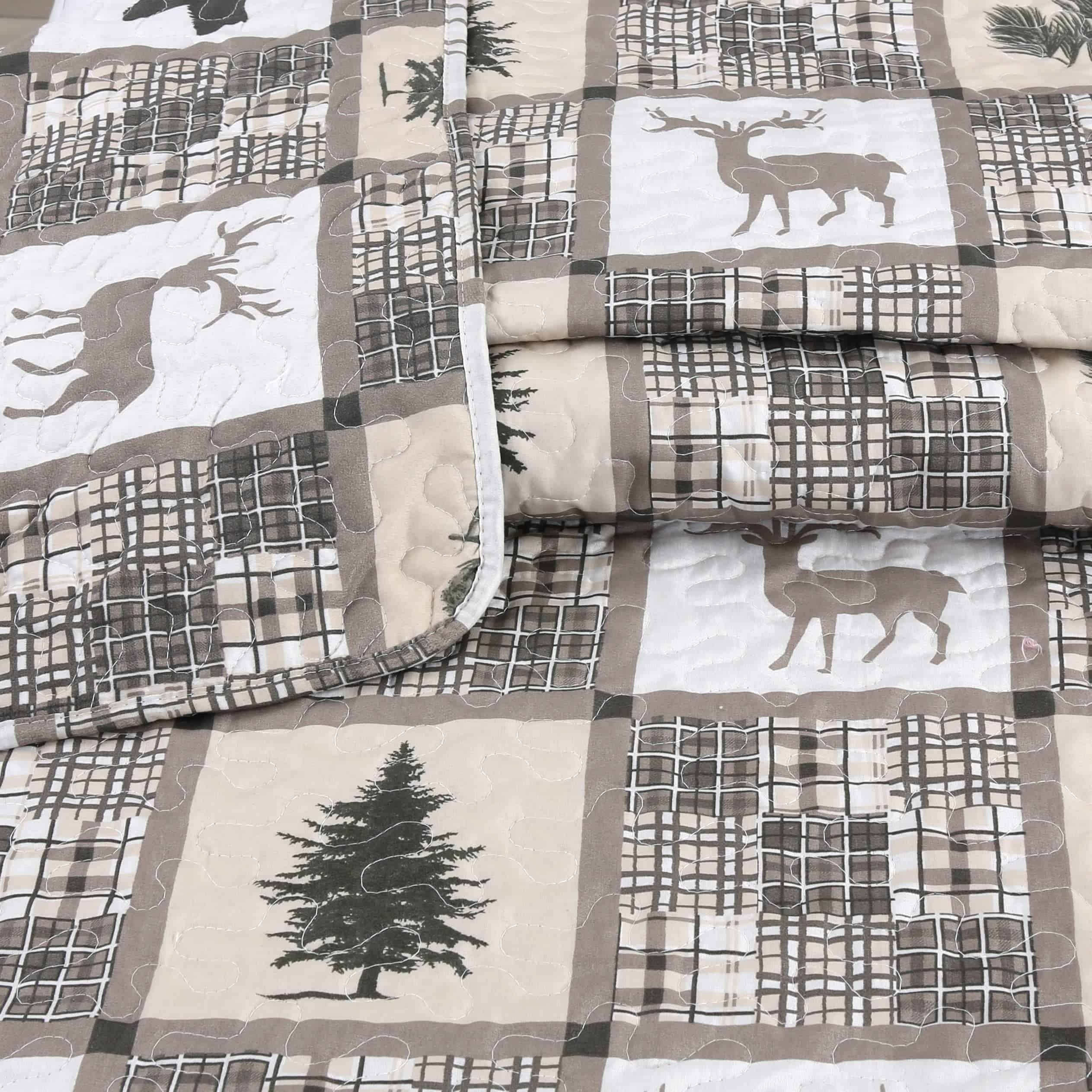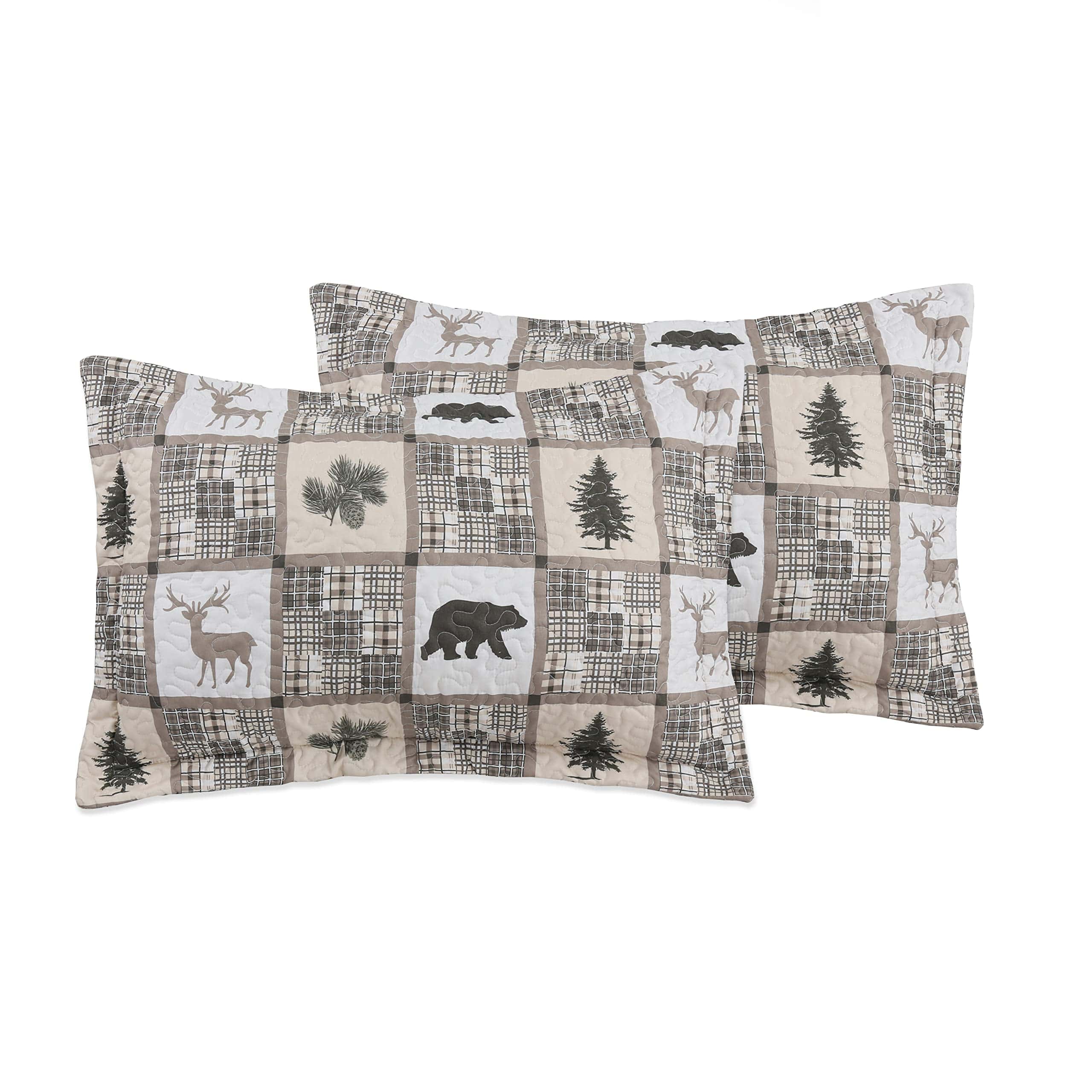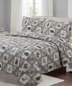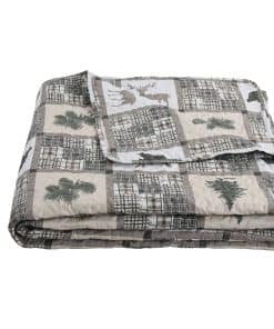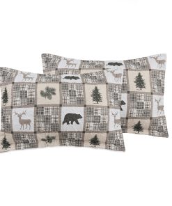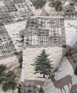 Este juego de colchas único con estampado moderno de cabaña es perfecto para la decoración del hogar. Incluye un diseño de oso negro, ciervo taupe, árbol y cuadros en tonos taupe. Hecho de lino fino, transpirable, elegante y reversible. Ideal para propietarios con gustos sofisticados en decoración.