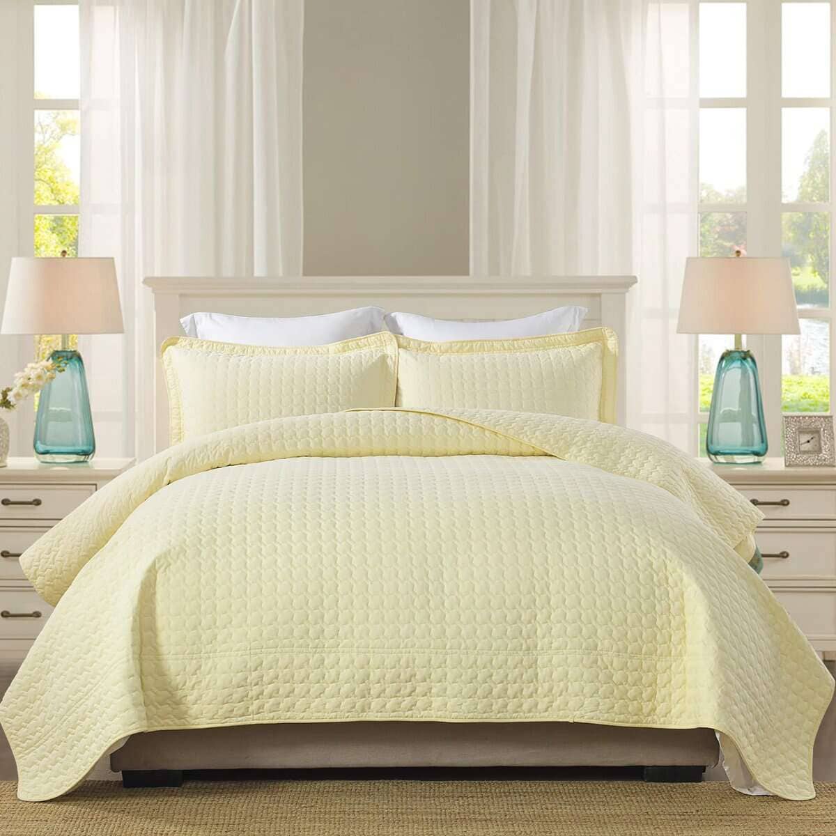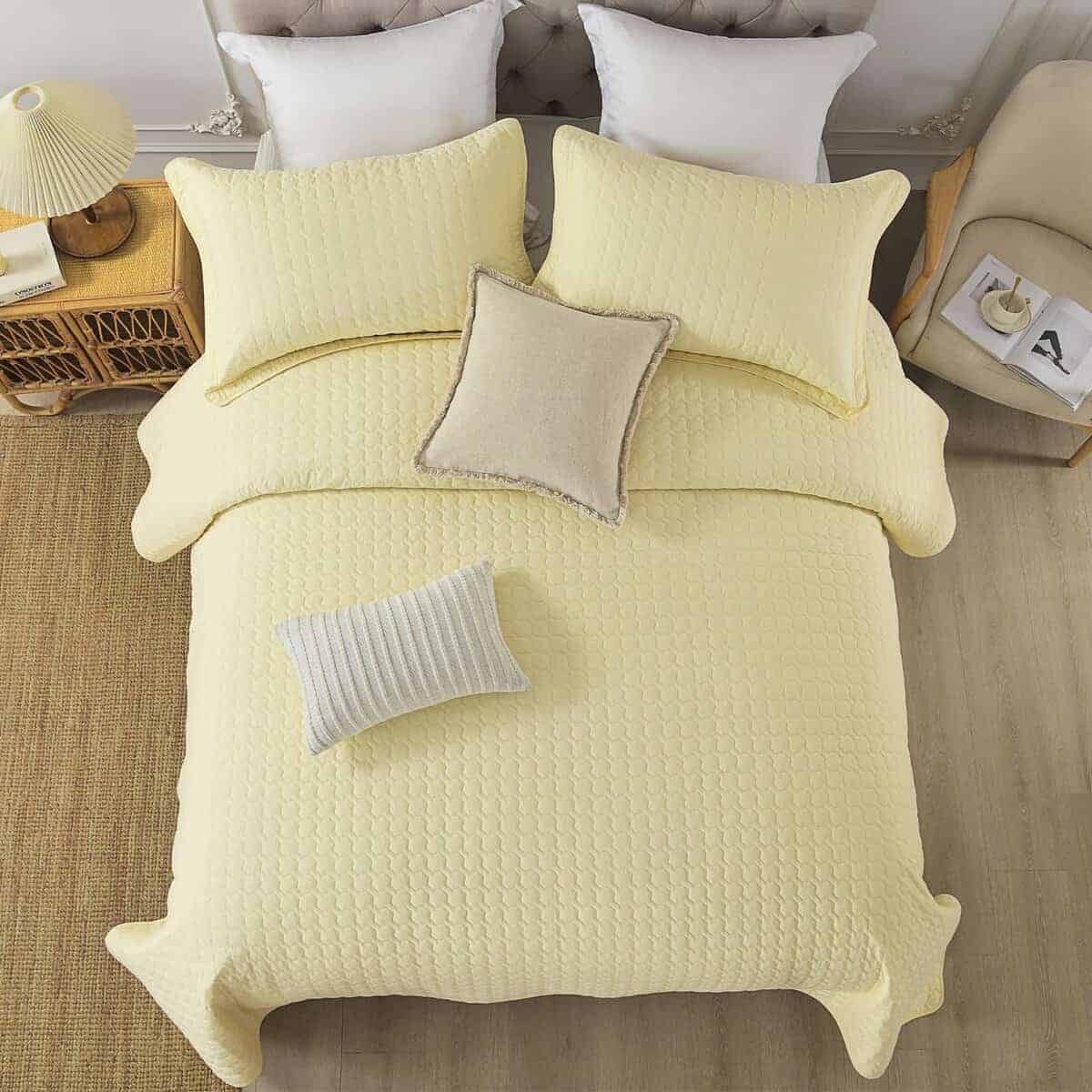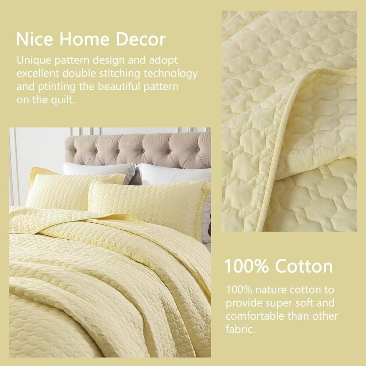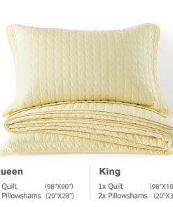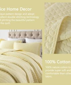 1. Artesanía Exquisita – Lograda a través de una artesanía detallada de costura, esta colcha amarilla clara agrega un ambiente cálido y acogedor a cualquier dormitorio, mezclándose perfectamente con diversos estilos de decoración interior. 2. Suavidad Duradera – La colcha de cama está hecha de tejido de algodón de alta calidad, ofrece un tacto suave y cómodo, asegurando una experiencia de sueño lujosa. Es transpirable y duradera, perfecta para un uso a largo plazo. 3. Versátil y Práctica – Esta colcha sirve como una manta ligera para el verano y una capa extra de calidez durante el invierno, también se puede usar como colcha para mascotas o un elemento decorativo simple y elegante para la ropa de cama, lo que la hace adecuada para su uso durante todo el año. 4. Cuidado Fácil – Diseñada para la comodidad, esta colcha es apta para lavadora, lo que la hace fácil de limpiar y mantener. Resiste decoloración y mantiene su forma, lavar a máquina en agua fría en ciclos suaves y secar a baja temperatura para una restauración como nueva. 5. Lo Que Puedes Obtener – Esta colcha de cama queen viene con una colcha (90″ x 98″) y dos fundas de almohada a juego (20″ x 26″ + 2″). 6. Certificación de Seguridad – Esta colcha queen está certificada Standard 100 por OEKO-TEX, garantizando que ha sido probada y verificada para estar libre de sustancias nocivas.