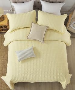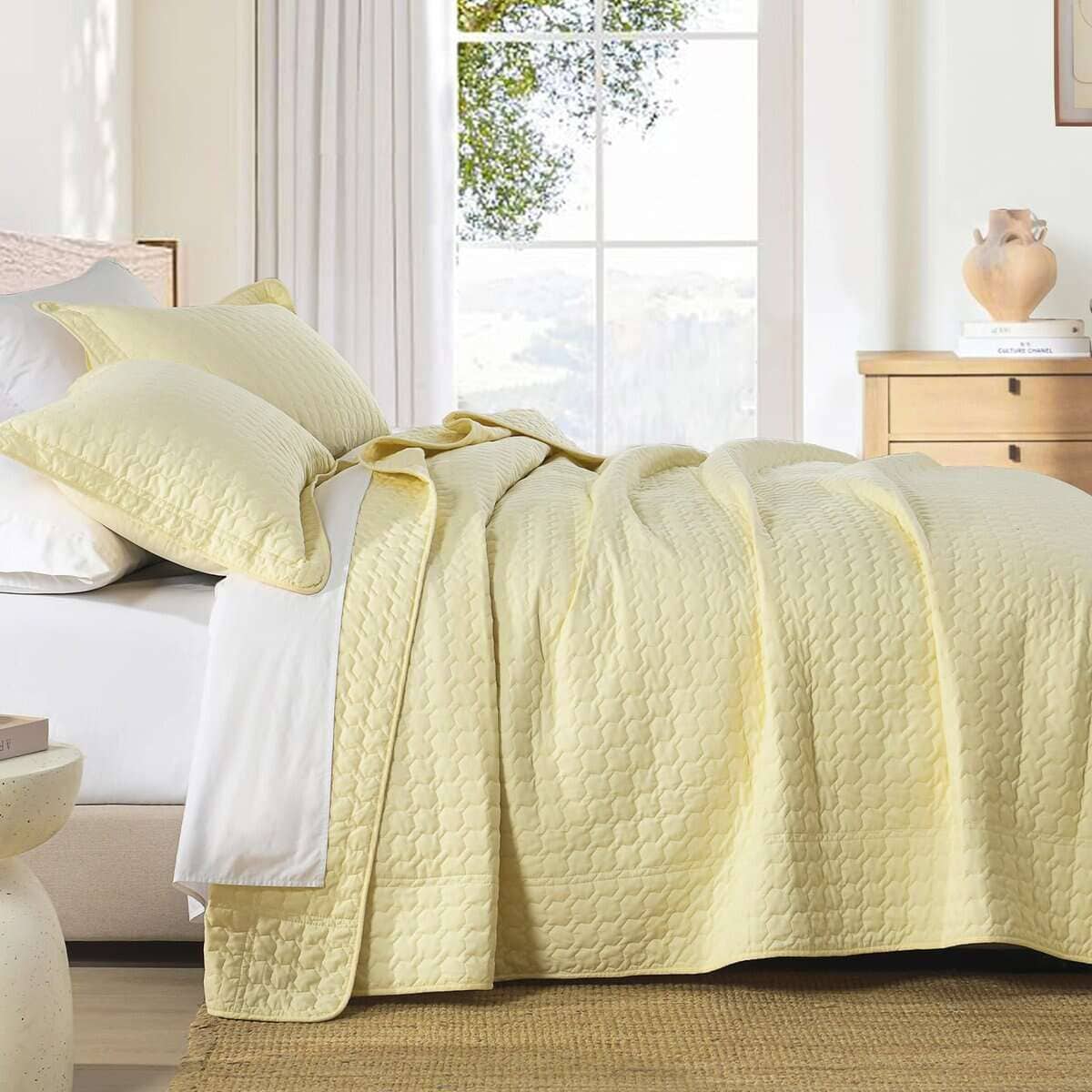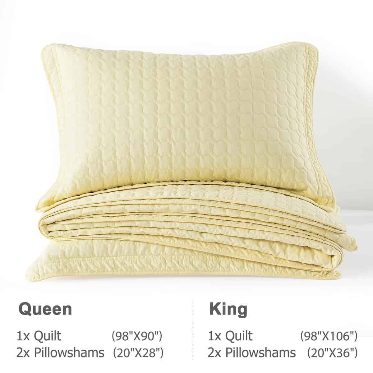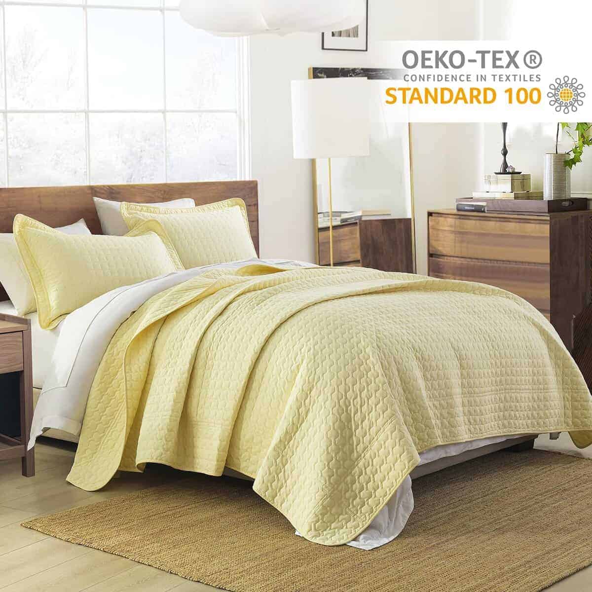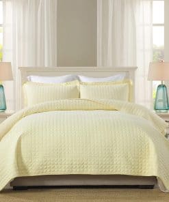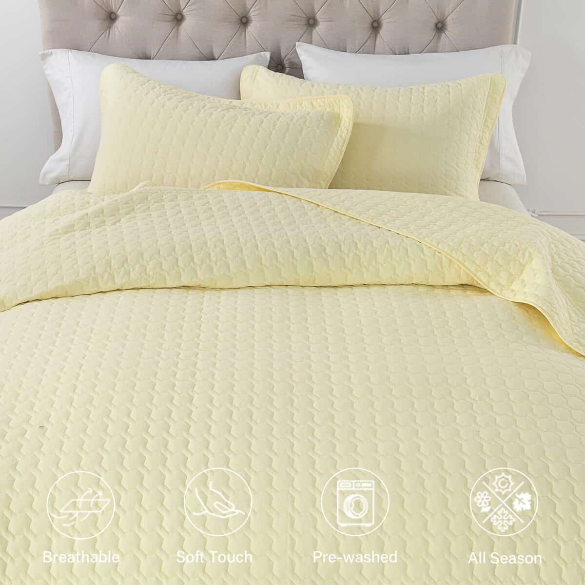 1. Artesanía Exquisita – Lograda a través de una artesanía detallada de costura, esta colcha amarilla clara agrega un ambiente cálido y acogedor a cualquier dormitorio, mezclándose perfectamente con diversos estilos de decoración interior. 2. Suavidad Duradera – La colcha de cama está hecha de tejido de algodón de alta calidad, ofrece un tacto suave y cómodo, asegurando una experiencia de sueño lujosa. Es transpirable y duradera, perfecta para un uso a largo plazo. 3. Versátil y Práctica – Esta colcha sirve como una manta ligera para el verano y una capa extra de calidez durante el invierno, también se puede usar como colcha para mascotas o un elemento decorativo simple y elegante para la ropa de cama, lo que la hace adecuada para su uso durante todo el año. 4. Cuidado Fácil – Diseñada para la comodidad, esta colcha es apta para lavadora, lo que la hace fácil de limpiar y mantener. Resiste decoloración y mantiene su forma, lavar a máquina en agua fría en ciclos suaves y secar a baja temperatura para una restauración como nueva. 5. Lo Que Puedes Obtener – Esta colcha de cama queen viene con una colcha (90″ x 98″) y dos fundas de almohada a juego (20″ x 26″ + 2″). 6. Certificación de Seguridad – Esta colcha queen está certificada Standard 100 por OEKO-TEX, garantizando que ha sido probada y verificada para estar libre de sustancias nocivas.