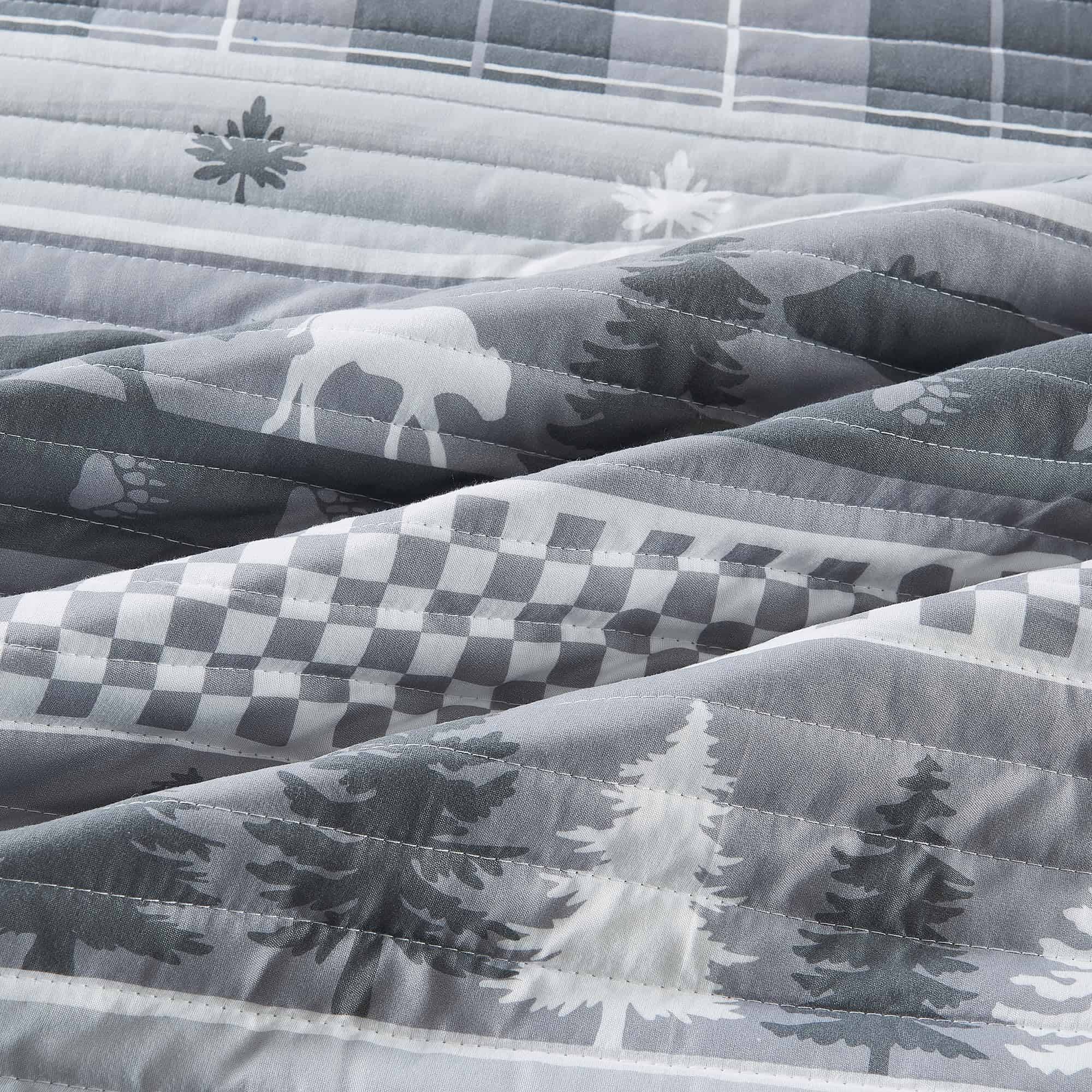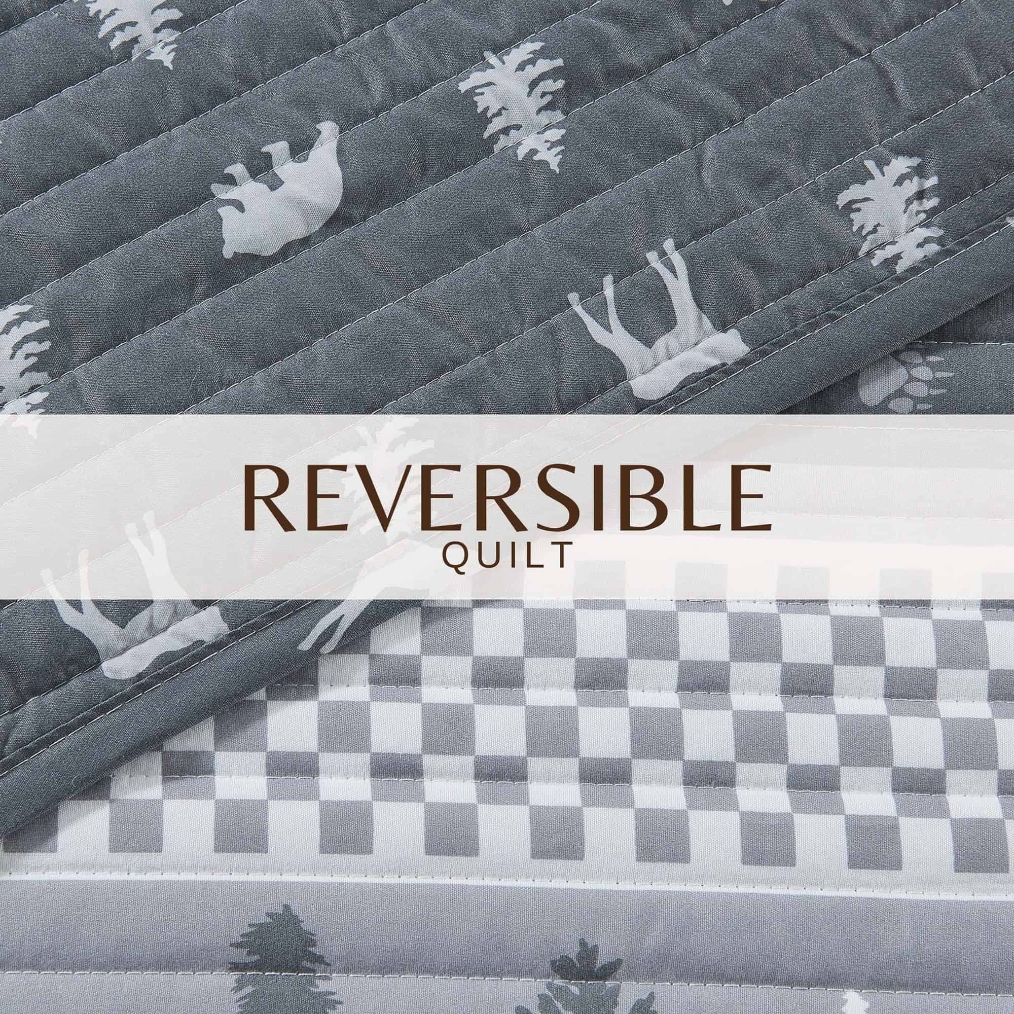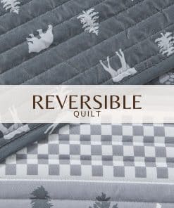 1. Estampado Rústico de Cabaña: Complementa la decoración de tu cabaña junto al lago con un juego de colcha inspirado en la naturaleza y en una cabaña rústica. Este conjunto presenta elementos de la naturaleza, como animales y árboles, además de patrones de cuadros reversible con fundas a juego. Los diseños de las fundas pueden variar.