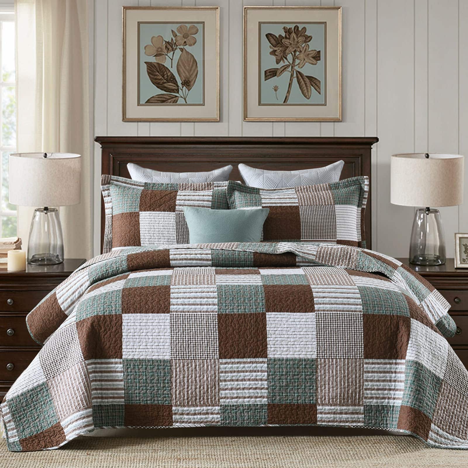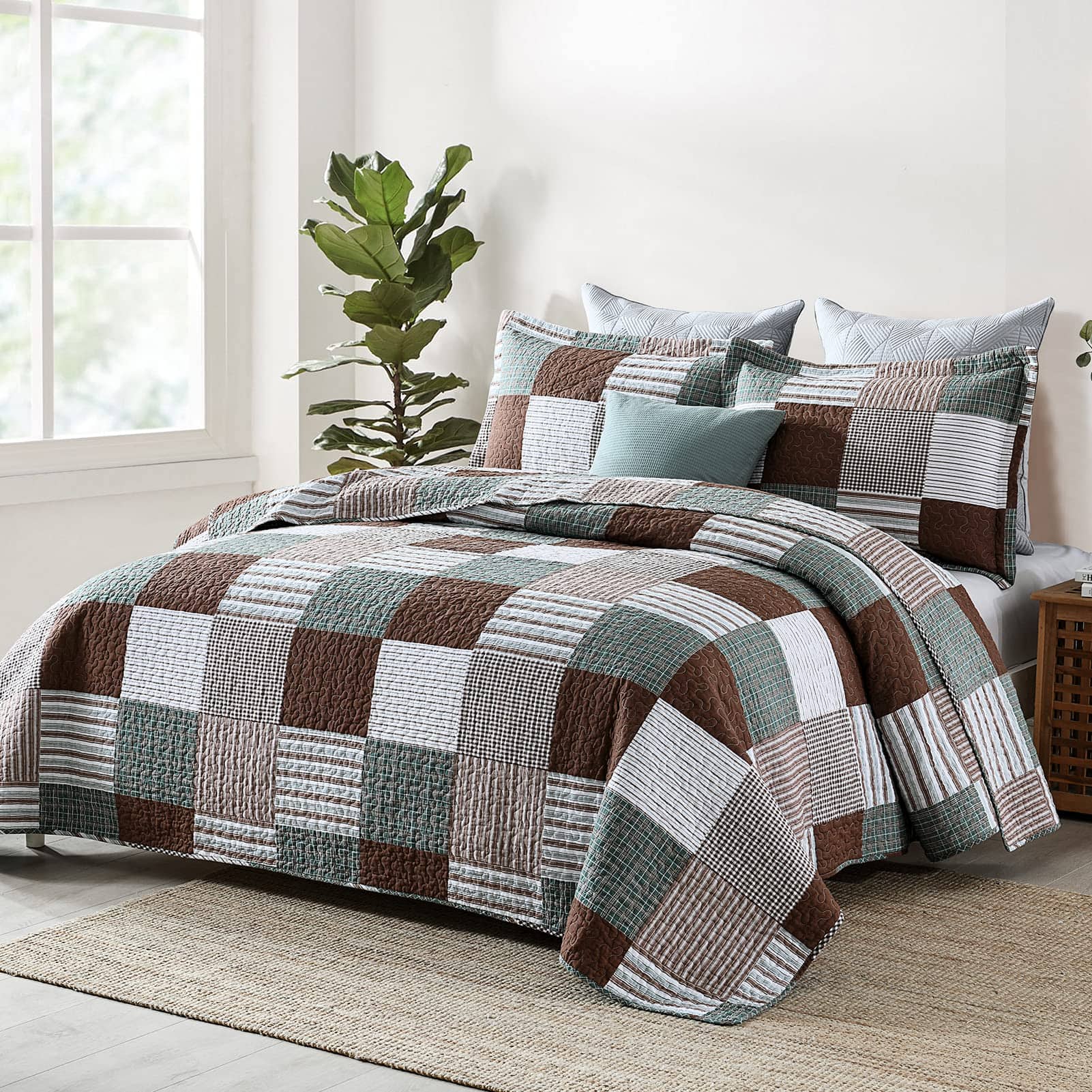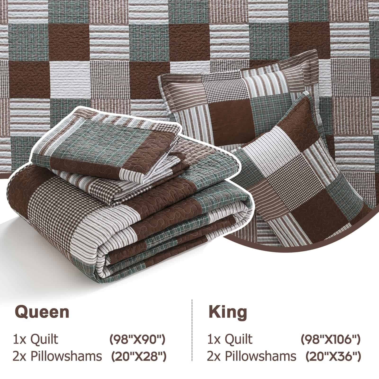2. Decoración para el Hogar: El juego de colcha king de estilo moderno y inspirado en granja con colores marrón, verde y blanco, diseño único de patrón a cuadros clásico, adopta una excelente artesanía de doble costura e imprime el hermoso patrón en el juego de cobertor king, una bonita decoración para tu habitación.