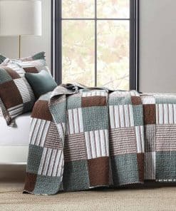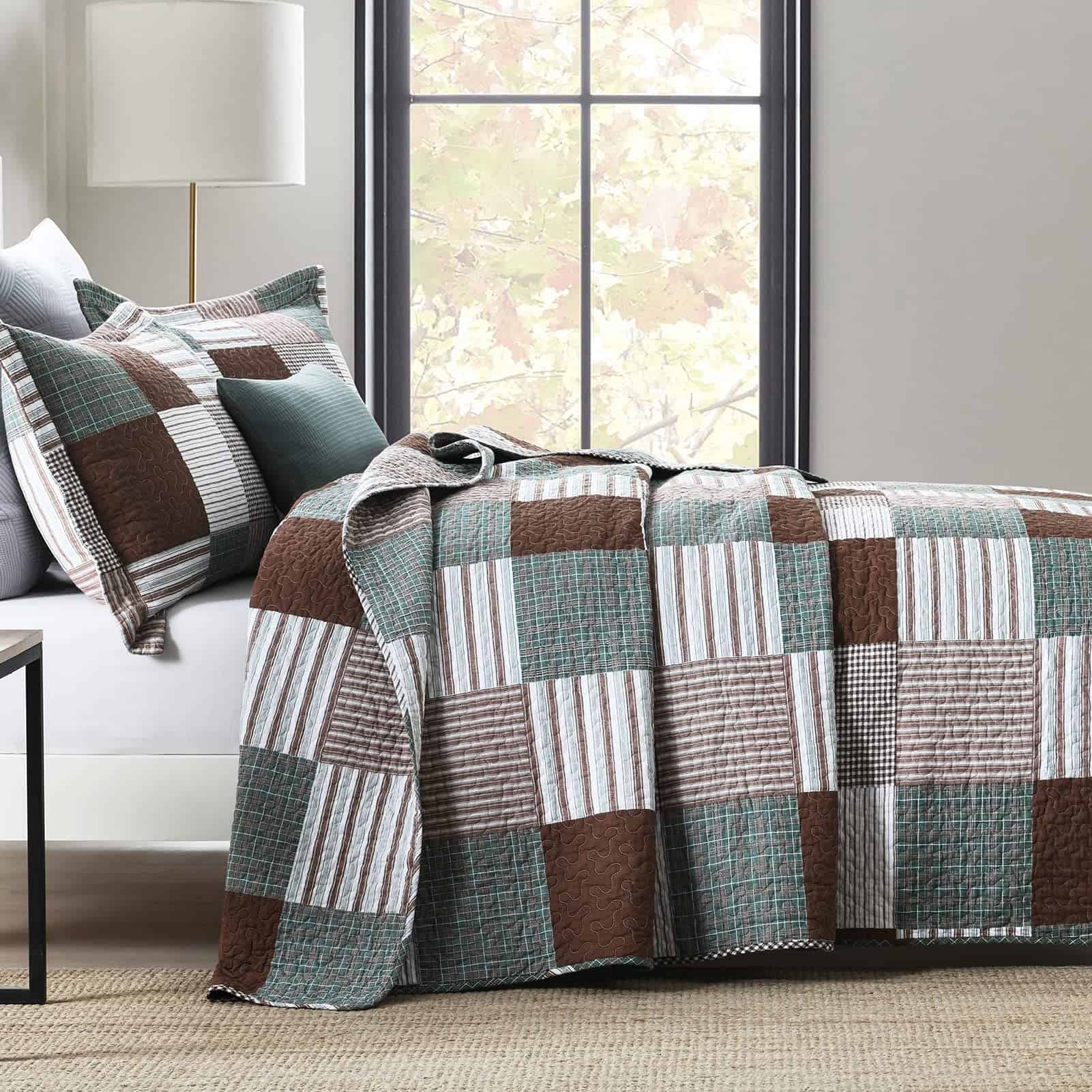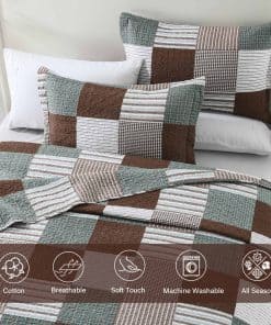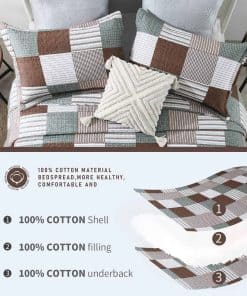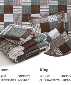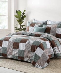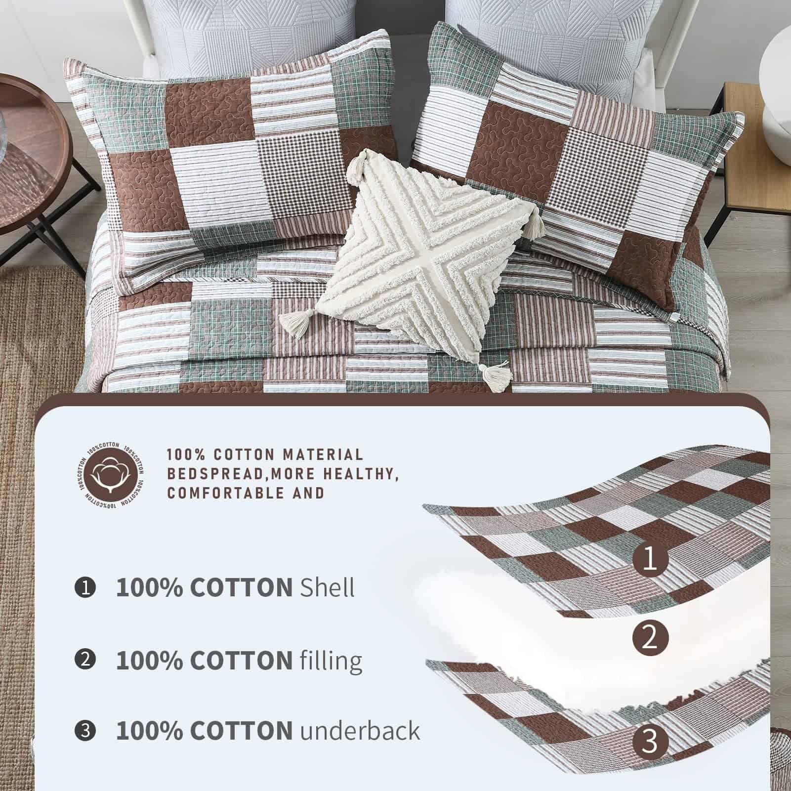 2. Decoración para el Hogar: El juego de colcha king de estilo moderno y inspirado en granja con colores marrón, verde y blanco, diseño único de patrón a cuadros clásico, adopta una excelente artesanía de doble costura e imprime el hermoso patrón en el juego de cobertor king, una bonita decoración para tu habitación.