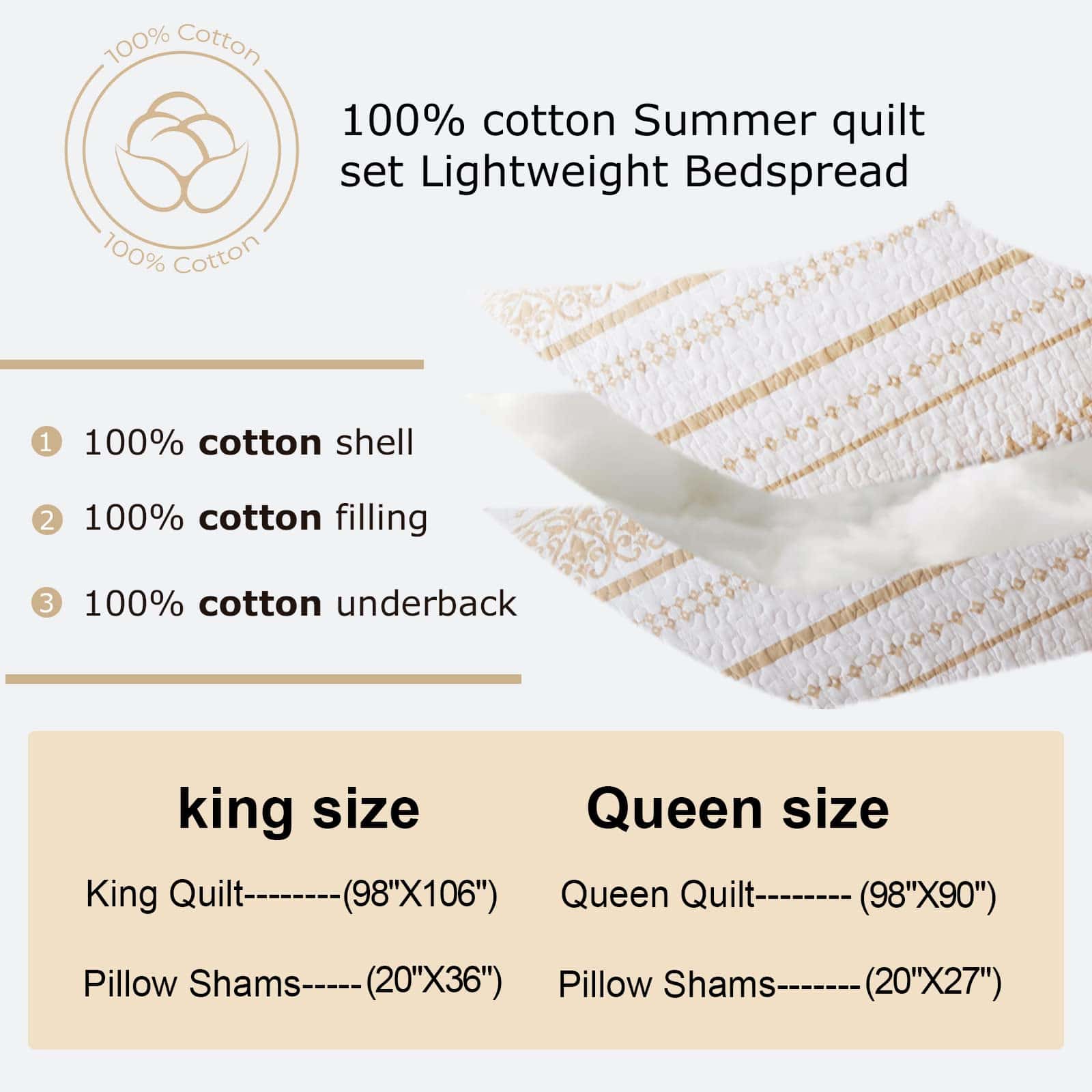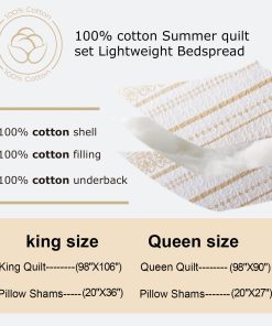 Made of 100% organic cotton, this king size quilt is incredibly soft, comfortable, and durable. The high-quality cotton material ensures that the king size bedding set won’t easily wear out or lose its shape. Enjoy the charm of our king size bedspread adorned with a beautiful blend of white and beige boho patterns. Transform your bedroom instantly with this elegant bohemian bedding set, perfect for adding a cool touch to your space during hot summer months. The generous dimensions of our king size quilt set include a king size quilt (106″x98″) and two pillow shams (20″x36″). This king size bedspread drapes hang well over your king size bed, creating a stunning focal point in your bedroom. Lightweight, soft, and breathable, this cotton king quilt set is ideal for use in air-conditioned rooms during the hot months. It is safe for direct skin contact without any allergy concerns. Additionally, this lightweight bedspread doubles as a stylish accessory that can add a touch of elegance to your bedroom decor. Keeping your bed quilt clean is effortless. Simply machine wash it in cold water on a gentle cycle, tumble dry on low heat, and avoid using bleach. Even after multiple washes, this quilt set will maintain its warmth, comfort, and shape, ensuring long-lasting enjoyment.