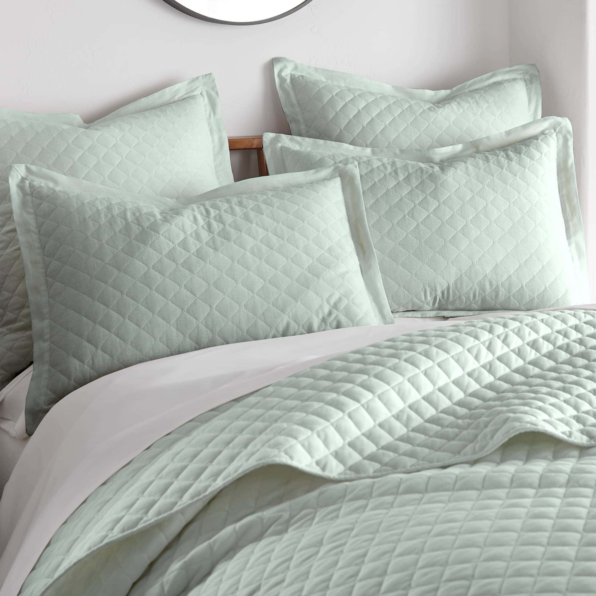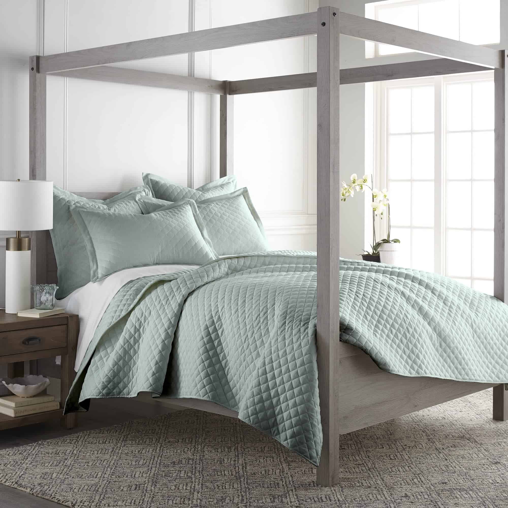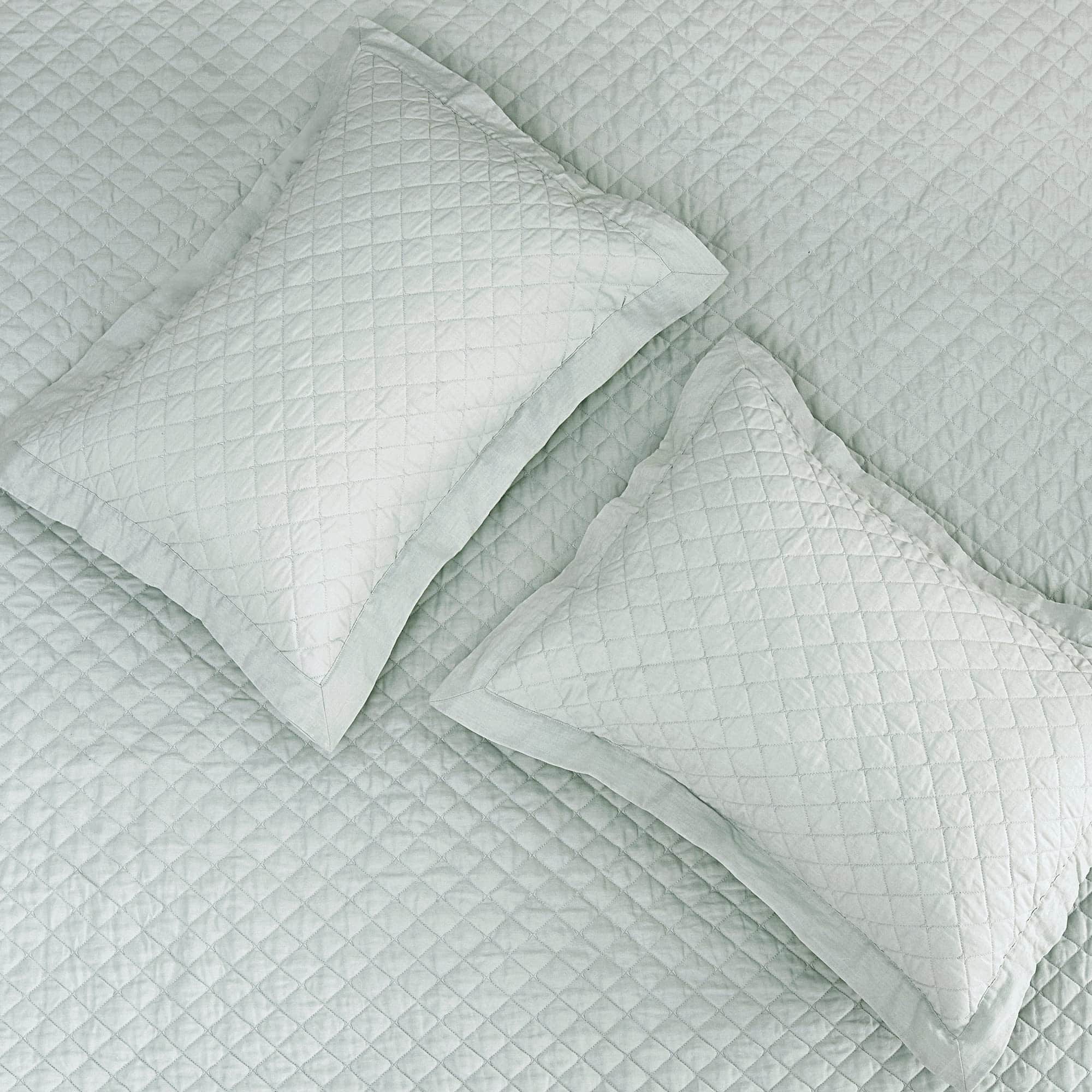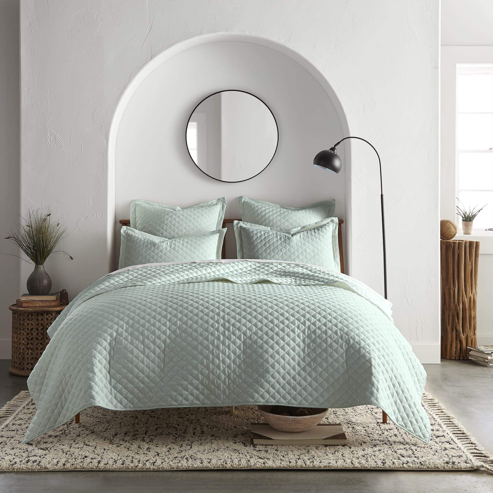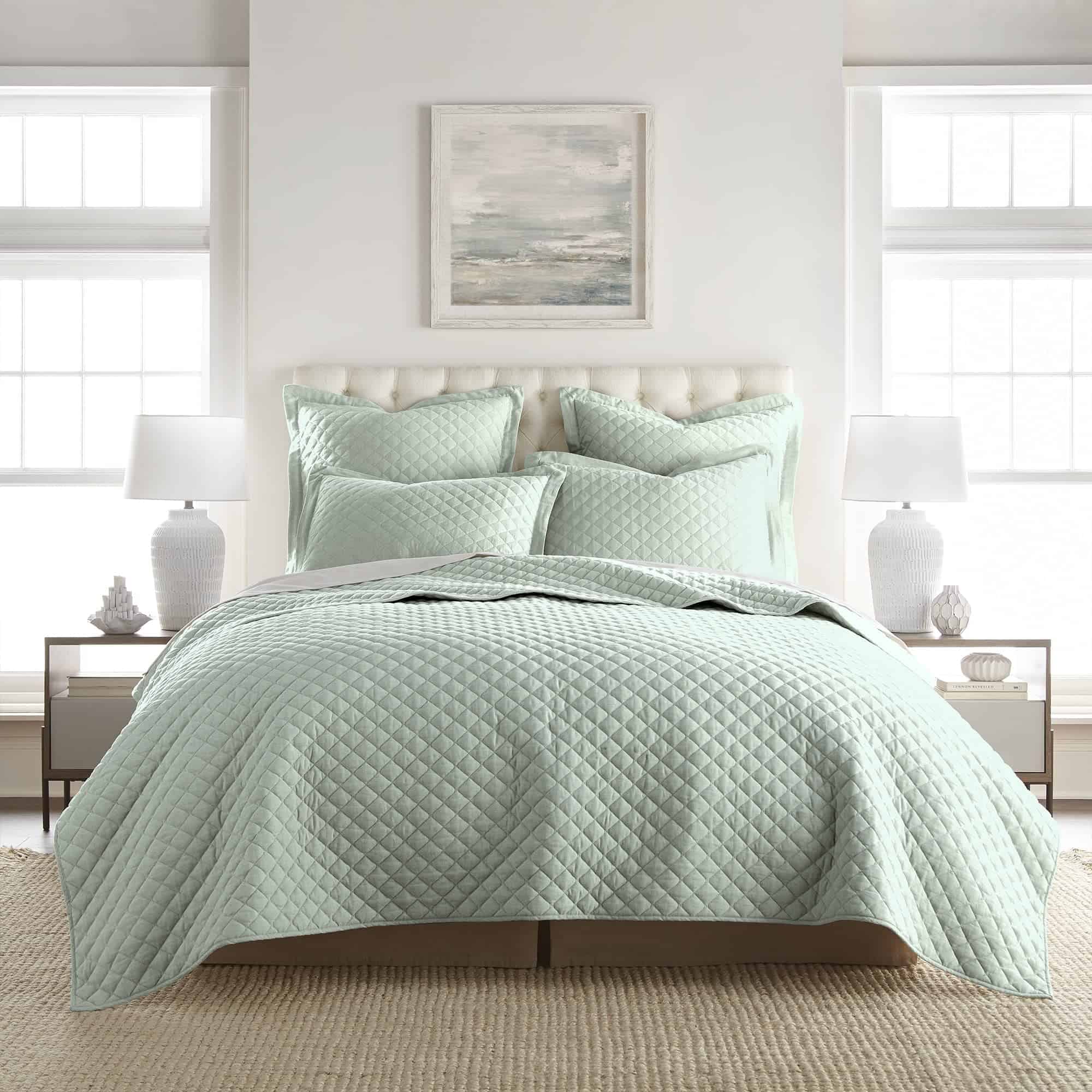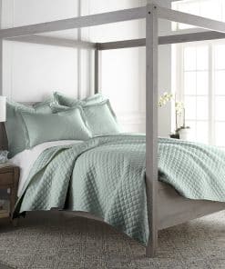 El Juego de Colcha Levtex Home Austin incluye una colcha de tamaño Full/Queen y dos fundas estándar, todo elaborado con un hermoso diseño de acolchado de diamante en un tono relajante spa. La colcha tiene unas medidas de 88×92 pulgadas, mientras que las fundas miden 20×26 pulgadas cada una. Este juego es reversible, lo que le permite cambiar la apariencia de su dormitorio fácilmente. Fabricado con una mezcla de lino y algodón, este conjunto es suave al tacto y duradero para un uso prolongado y cómodo.