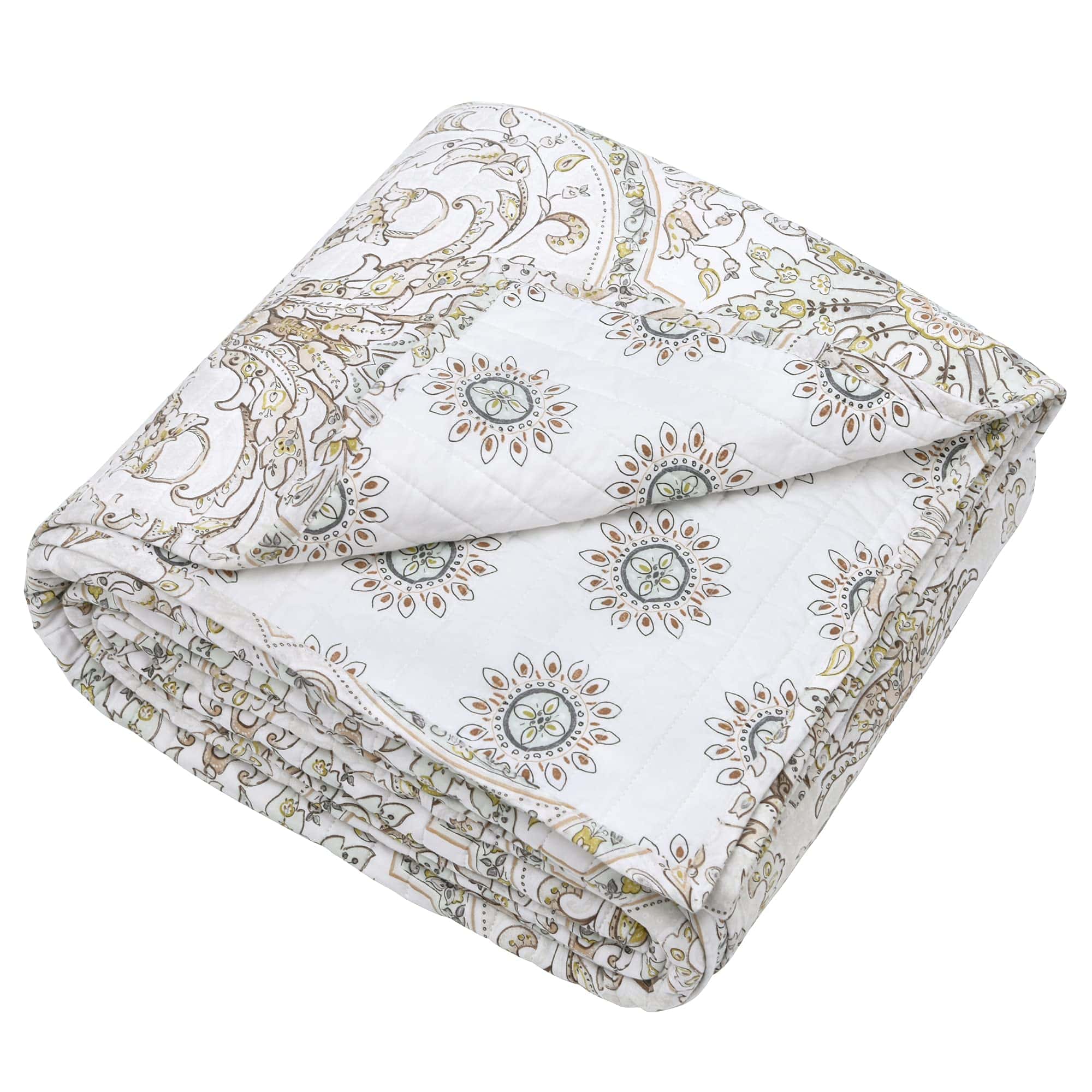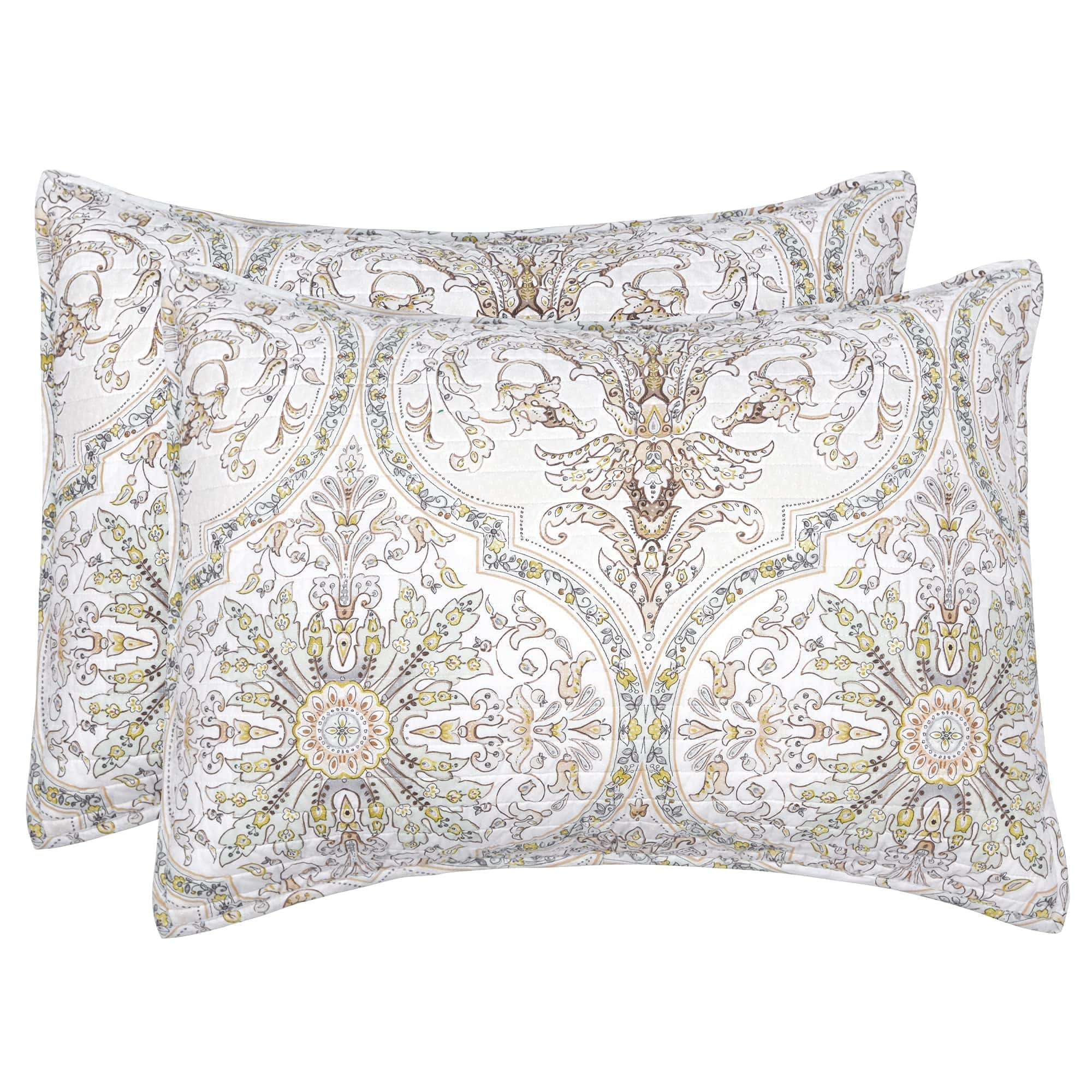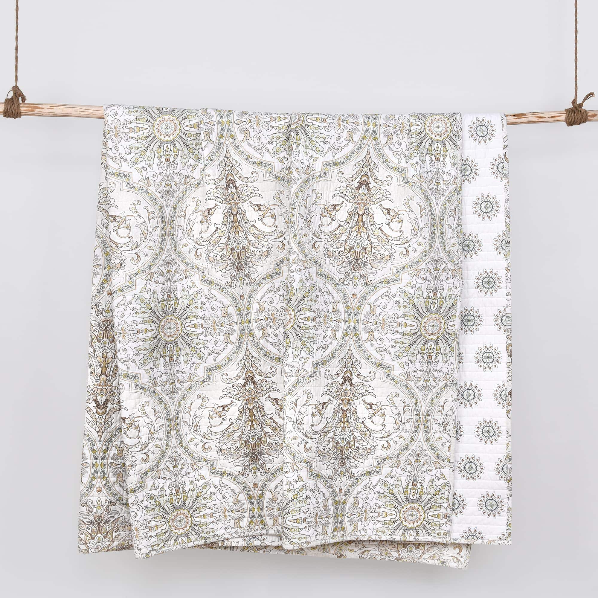 El Juego de Colcha Levtex Home Villa Lugano Cosima incluye una colcha King de tamaño generoso y dos fundas de almohada King a juego. Con un hermoso diseño de medallón en tonos taupe, verde, amarillo y blanco, esta colcha es reversible para mayor versatilidad en la decoración de tu dormitorio. Hecho con tela de algodón suave y transpirable para un descanso confortable. Añade un toque elegante y acogedor a tu habitación con este juego de colcha de alta calidad de Levtex Home.