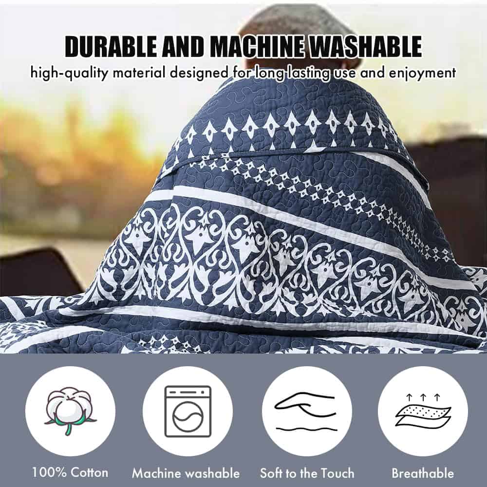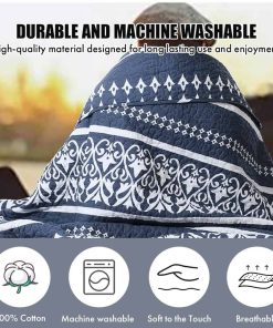 1. Colcha 100% Algodón: El juego de colcha boho king size está hecho de 100% algodón, más saludable y transpirable. Suavidad, amigable con la piel y duradero. 2. Patrón Bohemio a Rayas: La colcha boho impresa a rayas, diseño único, decora tu cama con este hermoso juego de ropa de cama estilo boho, combinando perfectamente con tu dormitorio y una bonita decoración para el hogar. Ideal para aquellos que aprecian una estética bohemia. 3. Colcha para Todas las Estaciones: Esta colcha king size está diseñada para ser utilizada en todas las estaciones, ligera pero cálida como una manta en primavera y verano, como un edredón en otoño e invierno. 4. Elegancia Azul Marino: El color azul marino profundo aporta un toque de sofisticación a tu dormitorio. Complementa varios estilos de decoración y crea un ambiente sereno para relajarse. 5. Fácil Cuidado de la Colcha: Lavar a máquina en agua fría, ciclo suave, secar a temperatura baja, no usar lejía. El juego de colcha king de algodón seguirá siendo cálido y mantendrá su forma suave después de cada lavado.