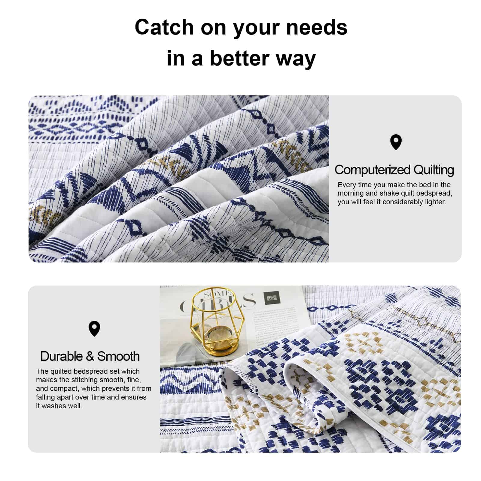 2. Para Varias Habitaciones – Este juego de colcha puede combinar fácilmente con la decoración de tu habitación. Es adecuado para dormitorios, salas de estar, habitaciones principales, habitaciones de invitados, estudios, airbnb, dormitorios y RVs. Y es ligero y portátil para habitaciones interiores y acampadas al aire libre. Este juego de colcha es ampliamente aplicable, por lo que puede ser una buena elección como regalo.