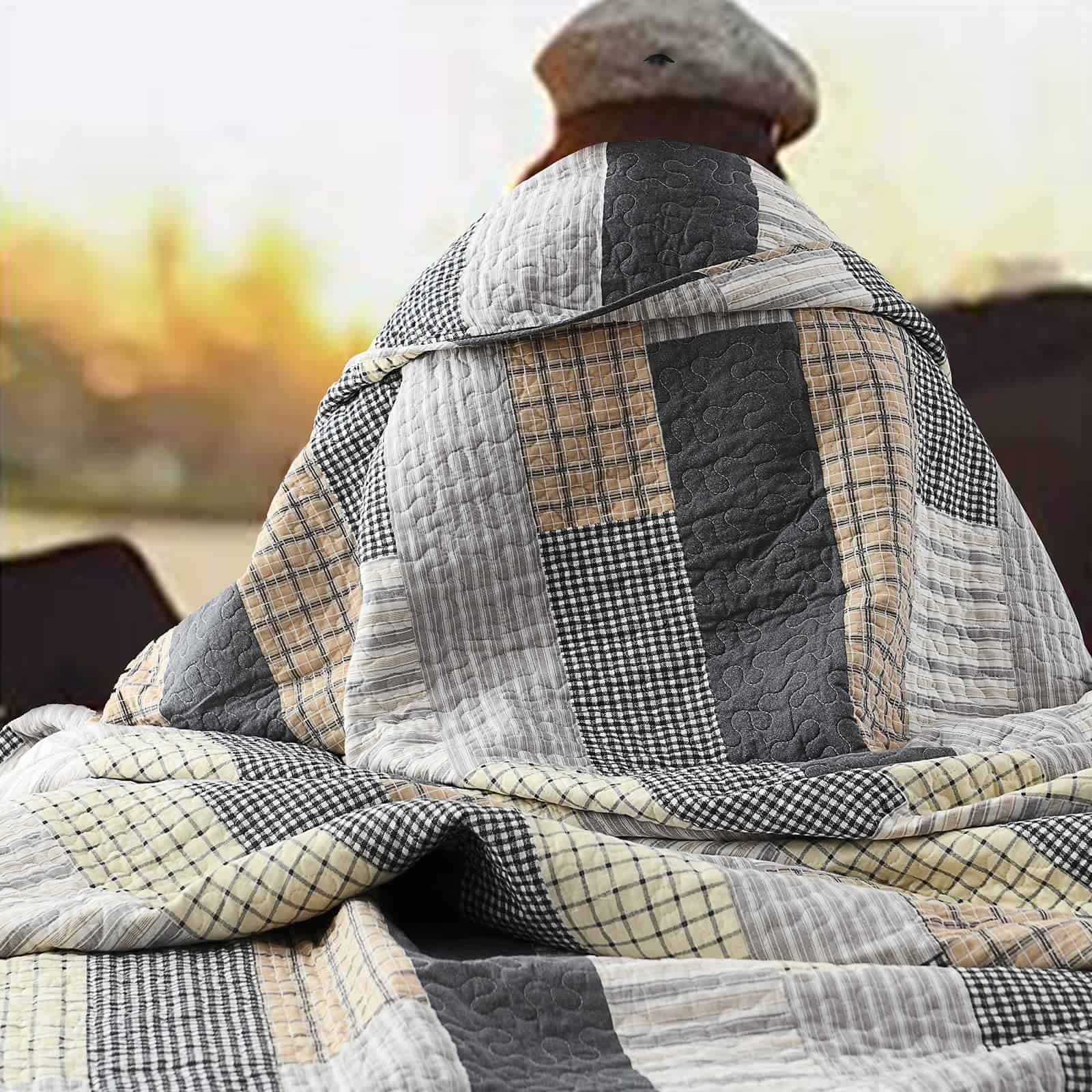 Este juego de colcha LORRIARD Queen está hecho de algodón orgánico 100%, lo que lo hace extremadamente suave, cómodo y duradero. El material de algodón de alta calidad garantiza que el set de colcha queen no se desgaste fácilmente ni pierda su forma. El diseño de patchwork en color gris/amarillo se ve realzado por la combinación de rayas, lo que hace que este conjunto de colchas sea elegante y único. Este juego de edredón reversible es también un elegante accesorio que añadirá un toque de sofisticación a tu dormitorio. Puedes usar este set de edredón de algodón en todas las estaciones, incluso en habitaciones con aire acondicionado durante los meses calurosos. Es seguro para el contacto directo con la piel y no presenta riesgos de alergias. El juego de 3 piezas incluye 1 colcha de tamaño queen de 90″x98″ y 2 fundas de almohada de 20″ x 27″. Es fácil de cuidar, simplemente ponlo en la lavadora y sécalo a baja temperatura. No uses lejía en este set de colchas, ya que mantendrá su suavidad y comodidad después de cada lavado.